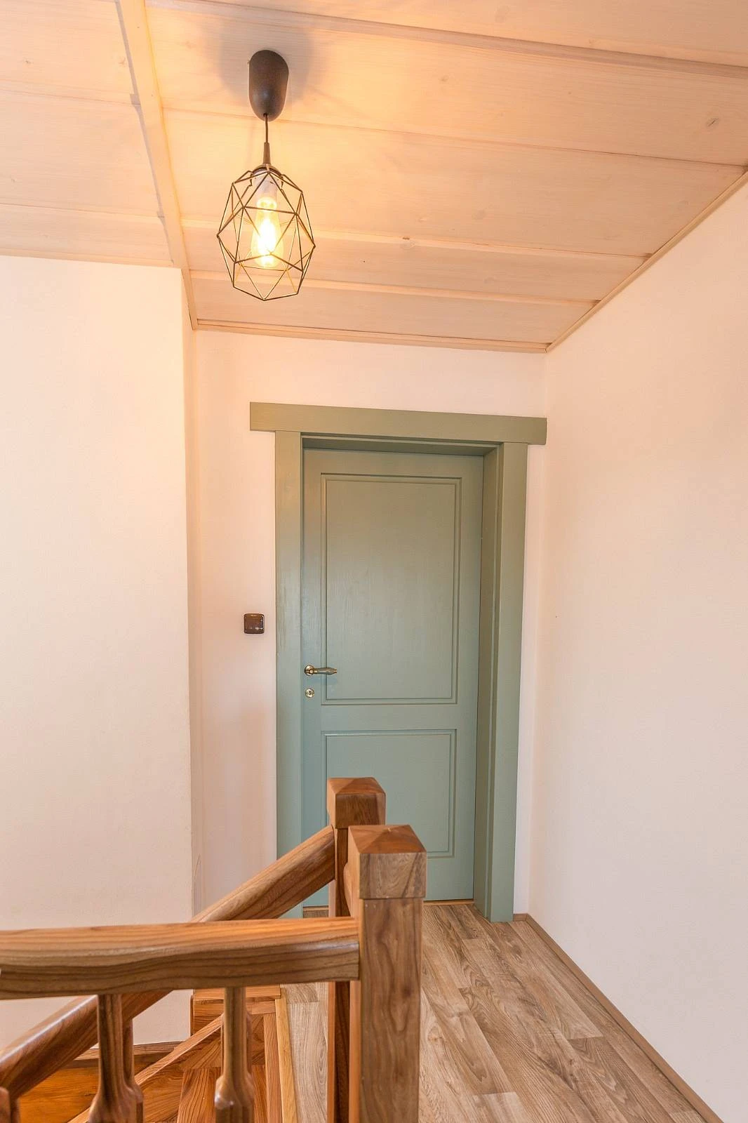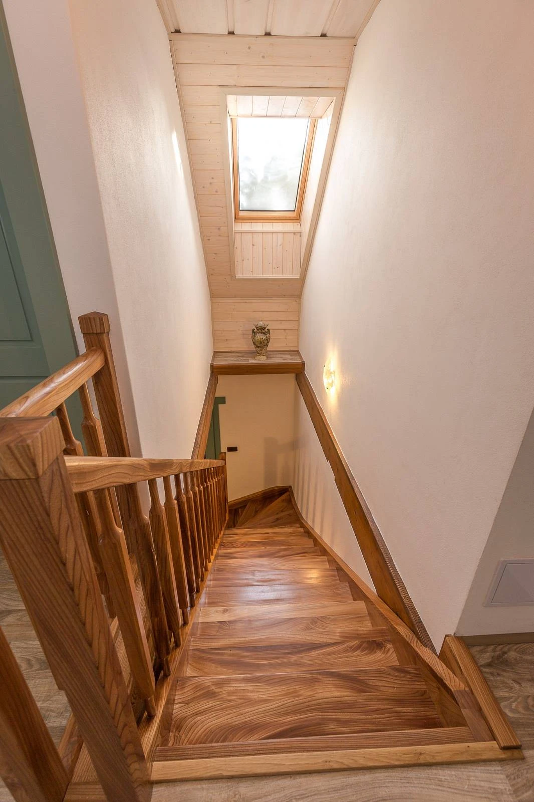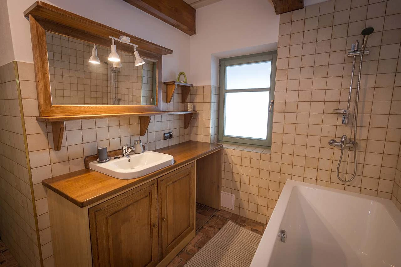 3 koupelny (2× sprchový kout + WC v patře, 1× vana + umyvadlo v přízemí)