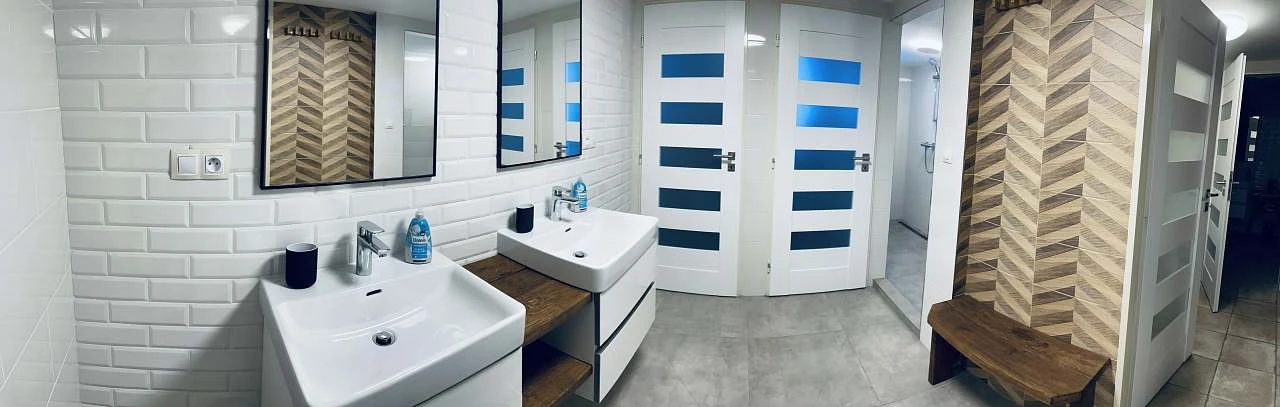 Koupelny jsou rozdělené na dámské a pánské. Každá má dvě toalety, sprchové kouty a umyvadla.
