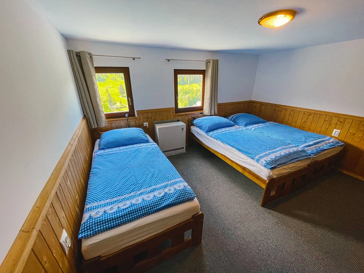 K dispozici jsou jak dvoulůžkové, tak i vícelůžkové pokoje, což zajišťuje flexibilitu pro různé skupiny hostů. Koupelny jsou rozděleny na dámské a pánské, každá s toaletami a umývanými kouty. Ubytování je vybaveno moderními technologiemi, včetně akumulačních kamenů, což zajišťuje teplo i v chladných měsících.