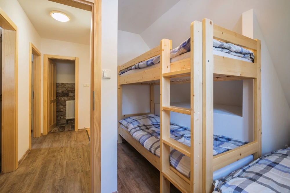 Velký apartmán je ideální pro větší rodiny nebo skupiny až 9 osob. Nabízí tři ložnice – dva dvoulůžkové pokoje a jeden prostorný pokoj s pěti lůžky. Hosté mohou využít plně vybavenou kuchyň s jídelnou, která umožňuje pohodlnou přípravu a konzumaci jídel. Obývací prostor je zařízen k odpočinku a společenským aktivitám. Samozřejmostí je vlastní koupelna s toaletou.