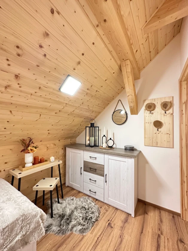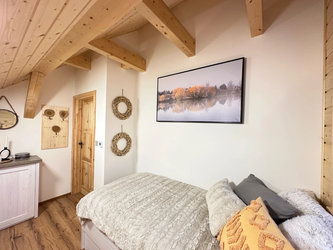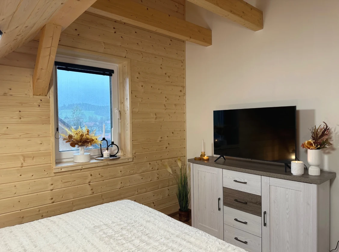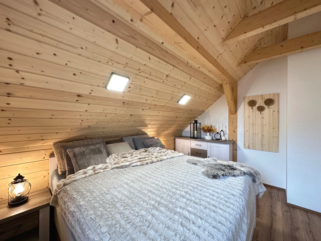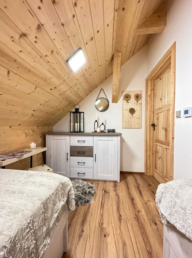- 1. ložnice je vybavena manželskou postelí (180x200 cm), komodou, věšáky, 2 nočními stolky s lampičkami a Smart TV.