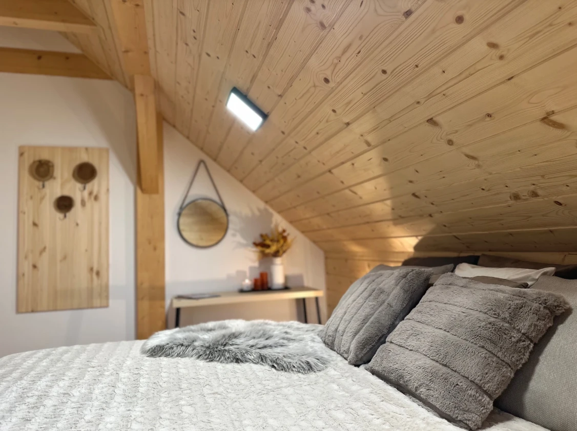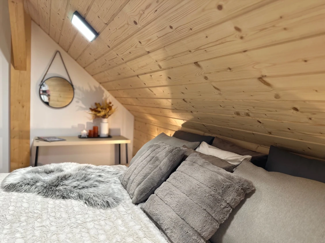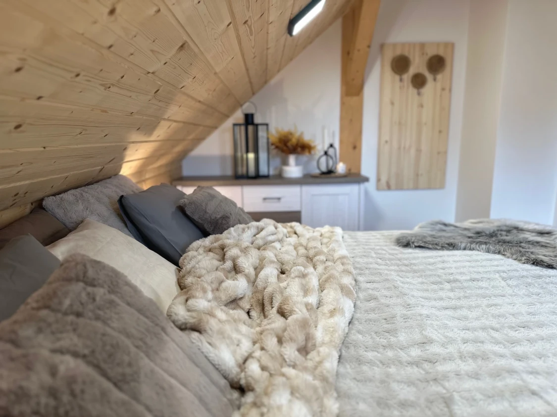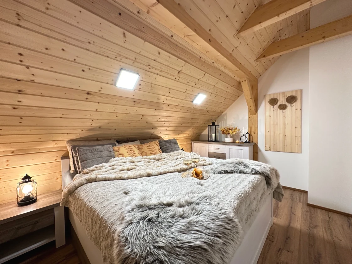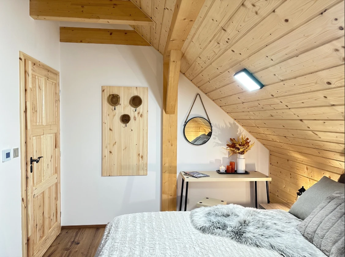 - 1. ložnice je vybavena manželskou postelí (180x200 cm), komodou, věšáky, 2 nočními stolky s lampičkami a Smart TV.