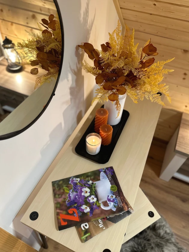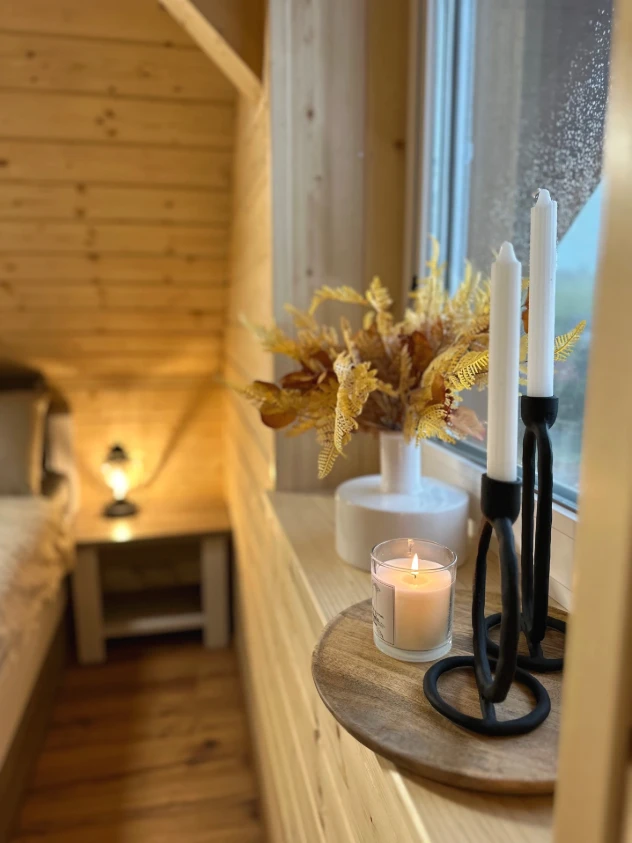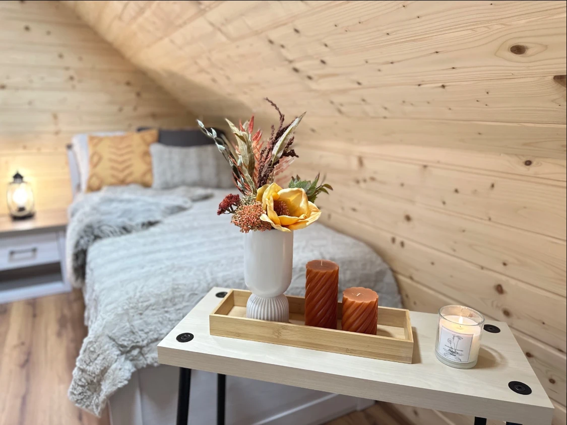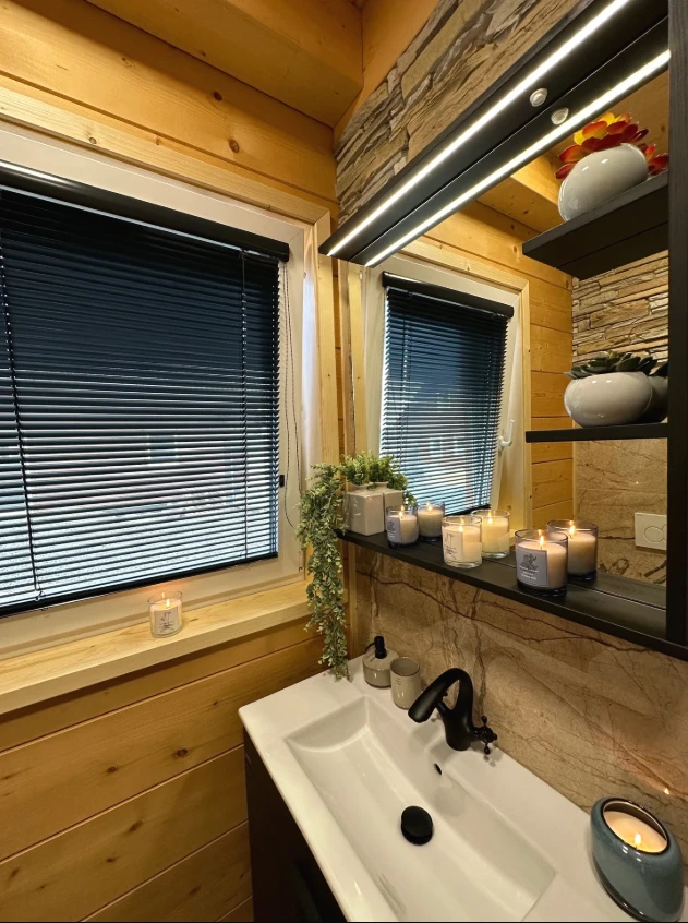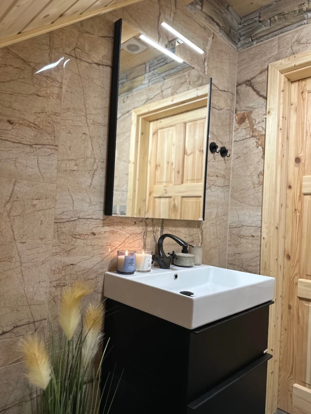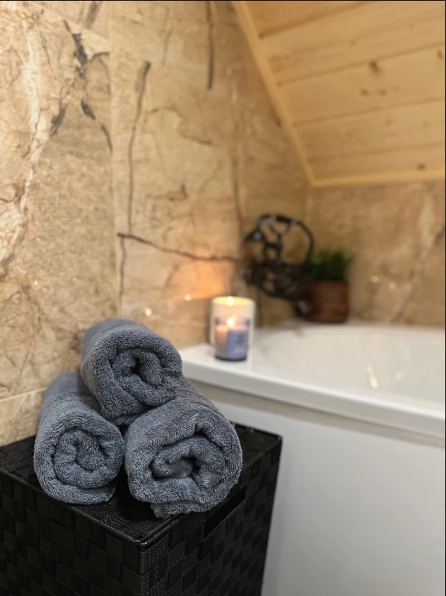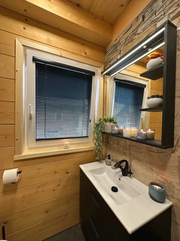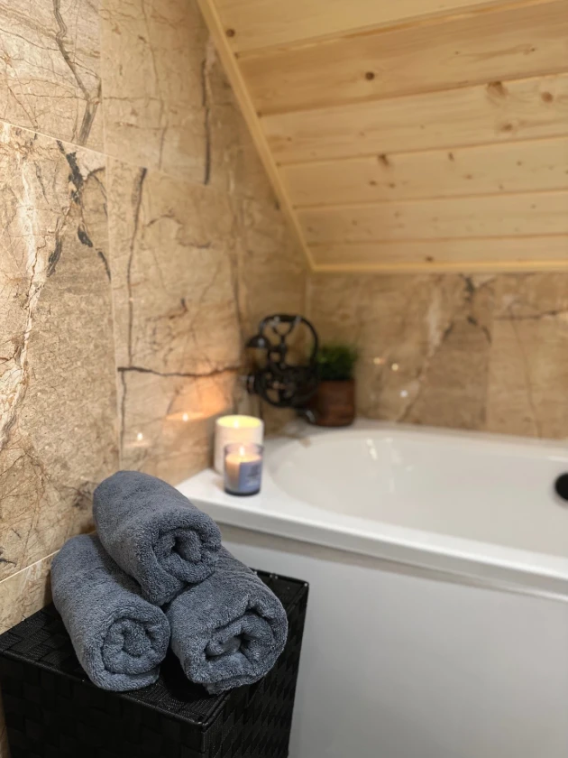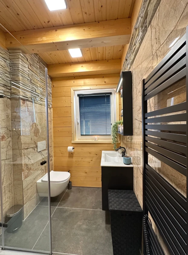 - Koupelna v přízemí: sprchový kout, umyvadlo se skříňkou, WC, topný žebřík, koš na prádlo, ručníky, mýdlo a toaletní papír.