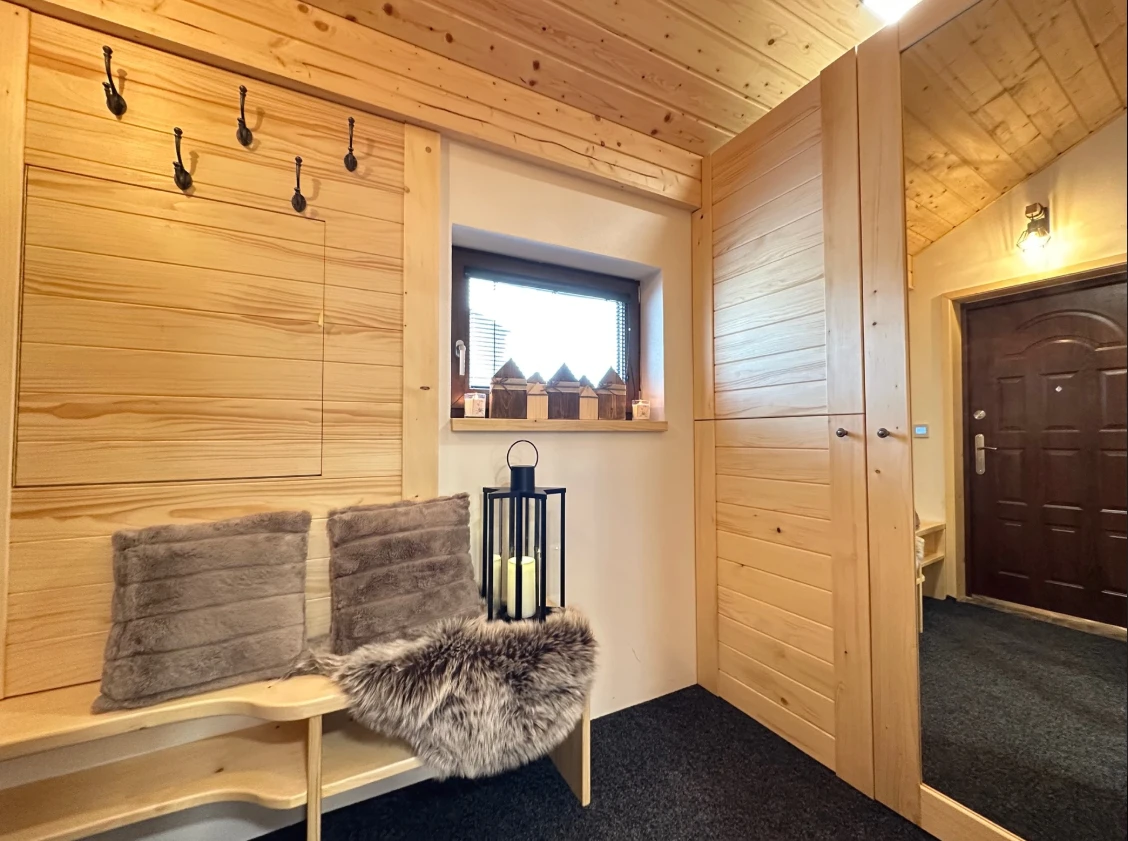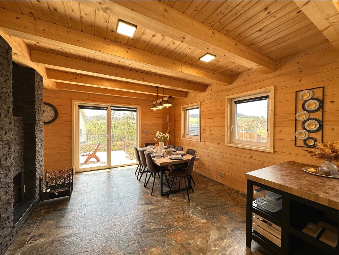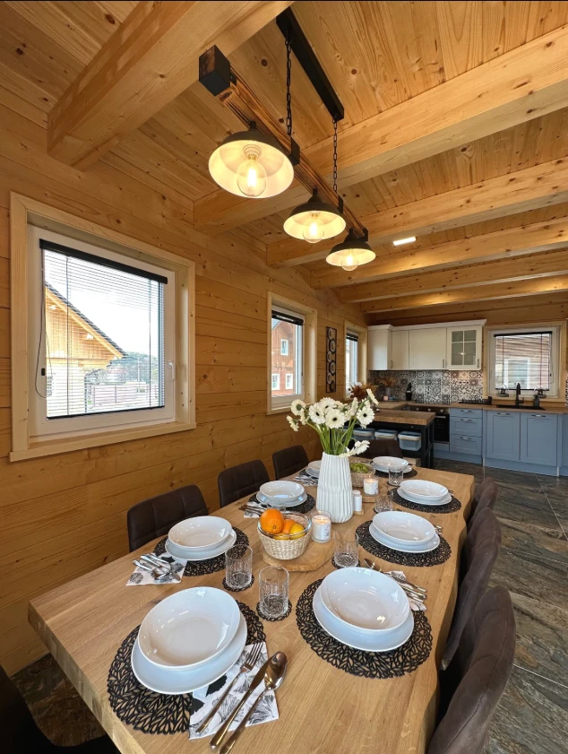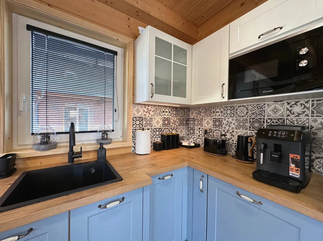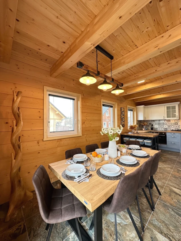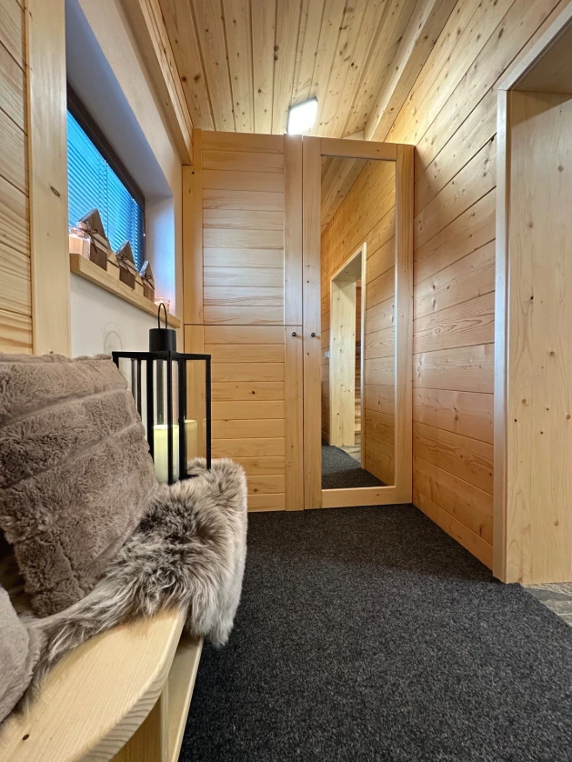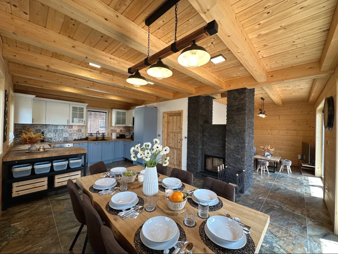 V přízemí roubenky najdete velkou šatní skříň s trezorem a technickou místnost vybavenou sušičkou prádla. K dispozici je také koupelna se sprchovým koutem a WC. Kuchyň je prostorná a plně vybavená nadstandardními spotřebiči, včetně espresso kávovaru. Součástí kuchyně je jídelní stůl z masivního dřeva pro 8 osob. Jídelnu od obývacího pokoje odděluje dominantní krb. V obývacím pokoji se nachází velká rozkládací sedačka pro 2 osoby, konferenční stolek z masivního dřeva, křeslo a Smart TV.