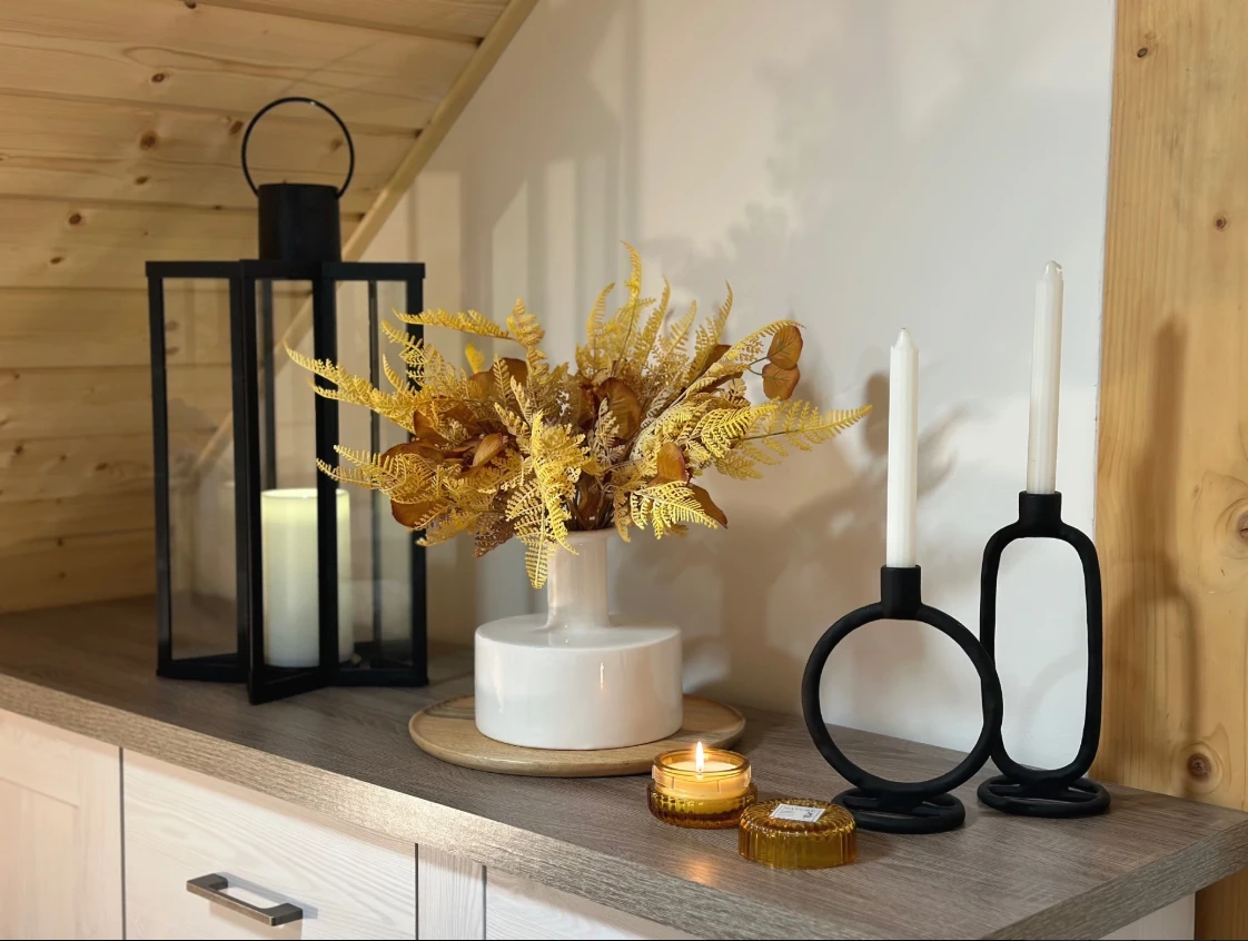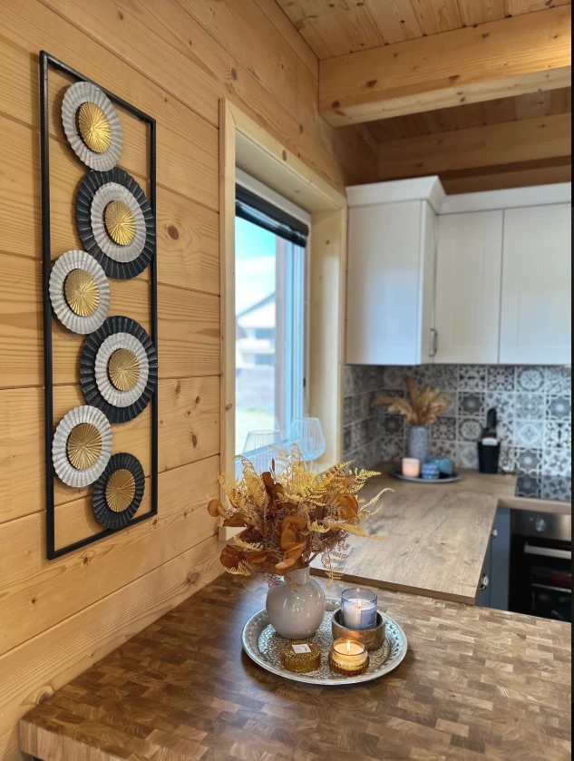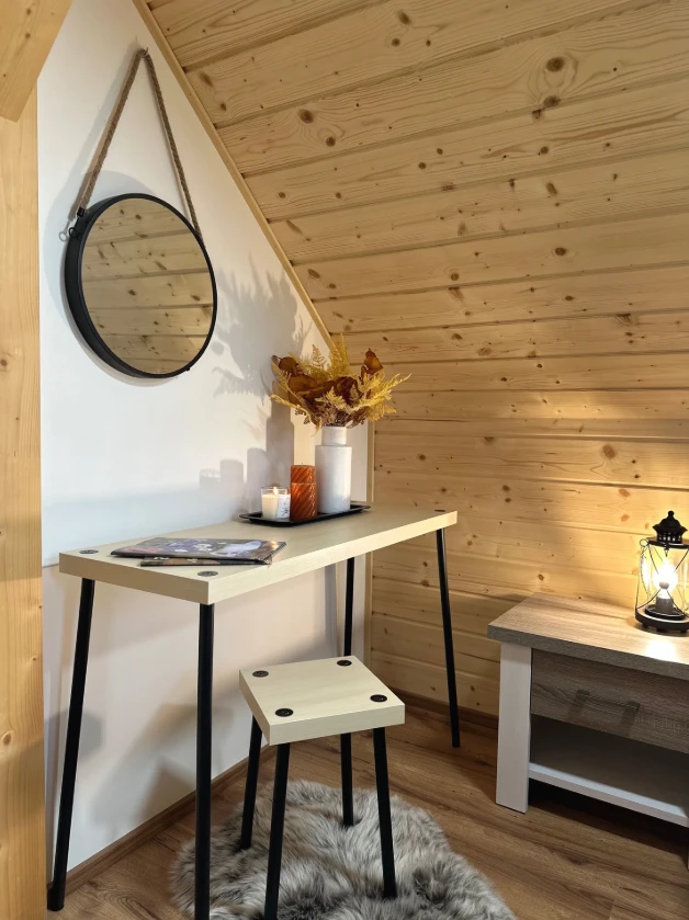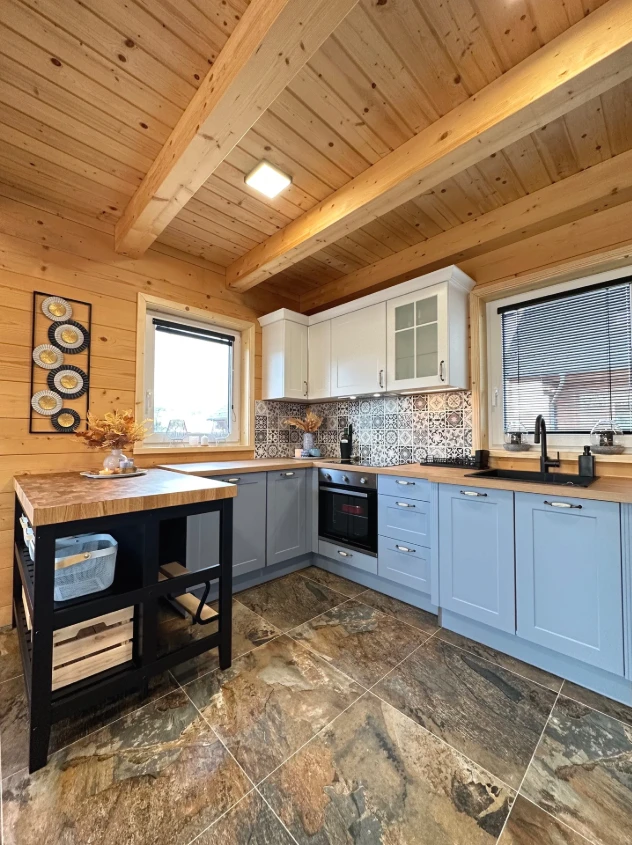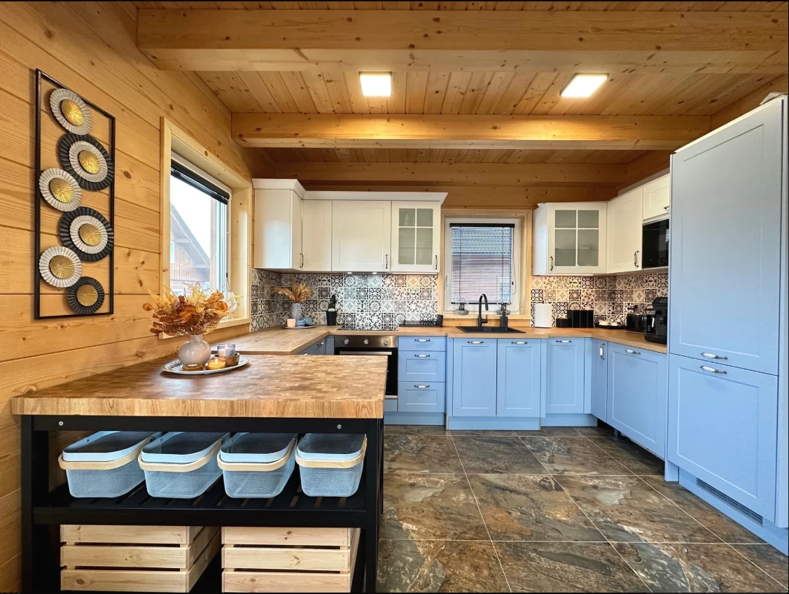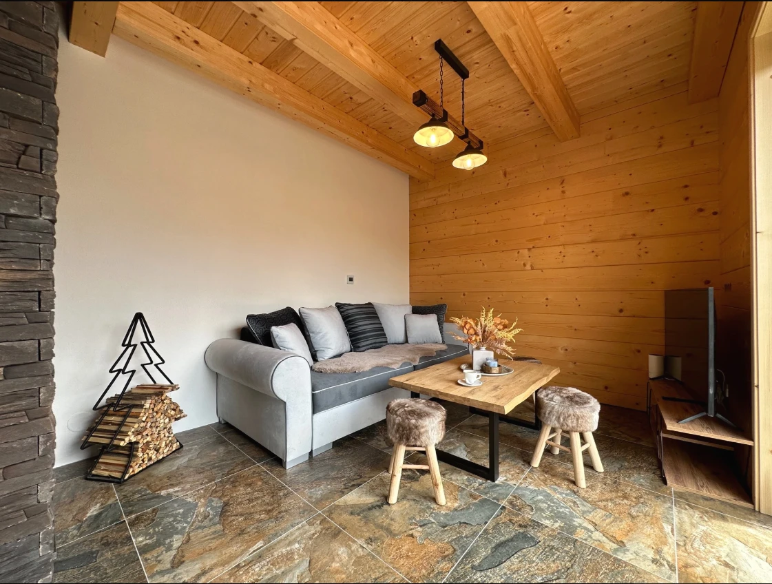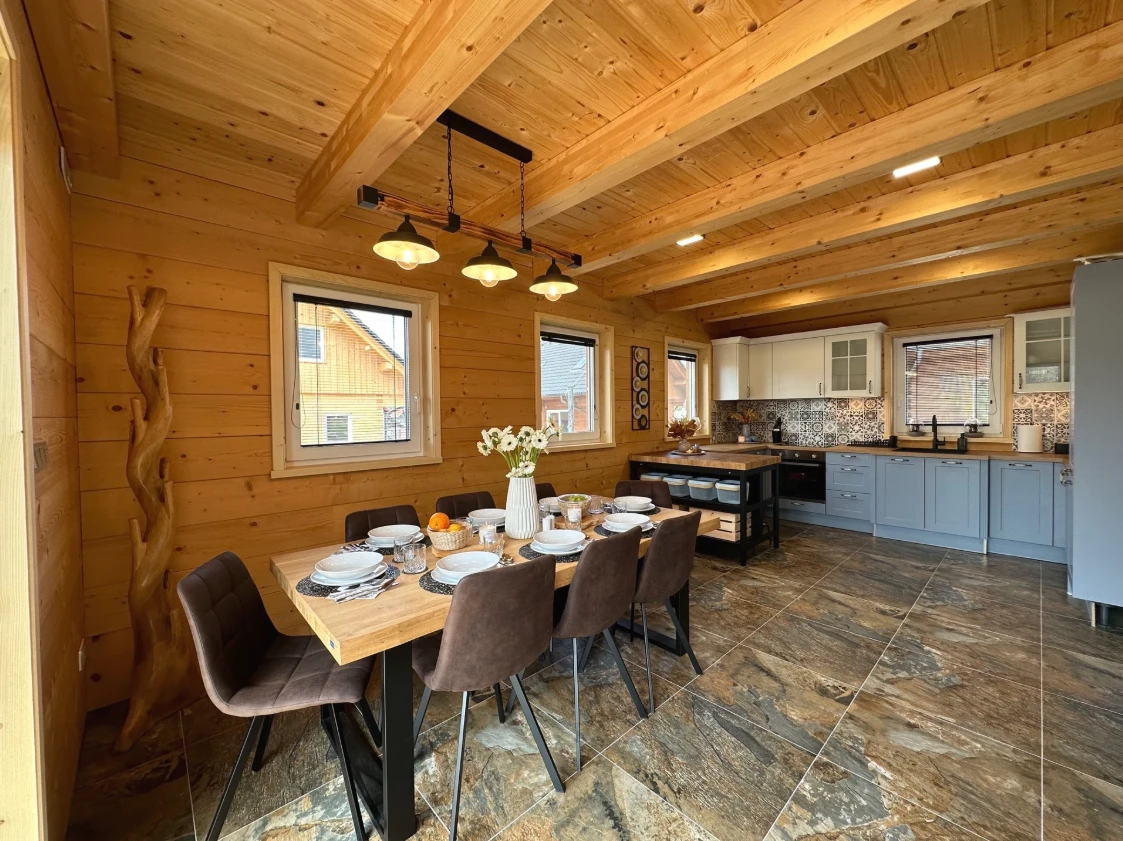 V přízemí roubenky najdete velkou šatní skříň s trezorem a technickou místnost vybavenou sušičkou prádla. K dispozici je také koupelna se sprchovým koutem a WC. Kuchyň je prostorná a plně vybavená nadstandardními spotřebiči, včetně espresso kávovaru. Součástí kuchyně je jídelní stůl z masivního dřeva pro 8 osob. Jídelnu od obývacího pokoje odděluje dominantní krb. V obývacím pokoji se nachází velká rozkládací sedačka pro 2 osoby, konferenční stolek z masivního dřeva, křeslo a Smart TV.