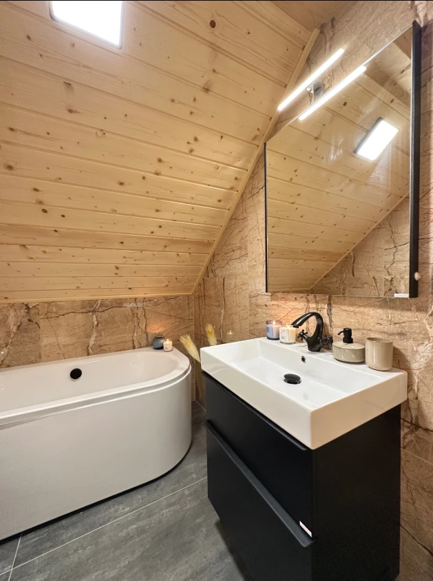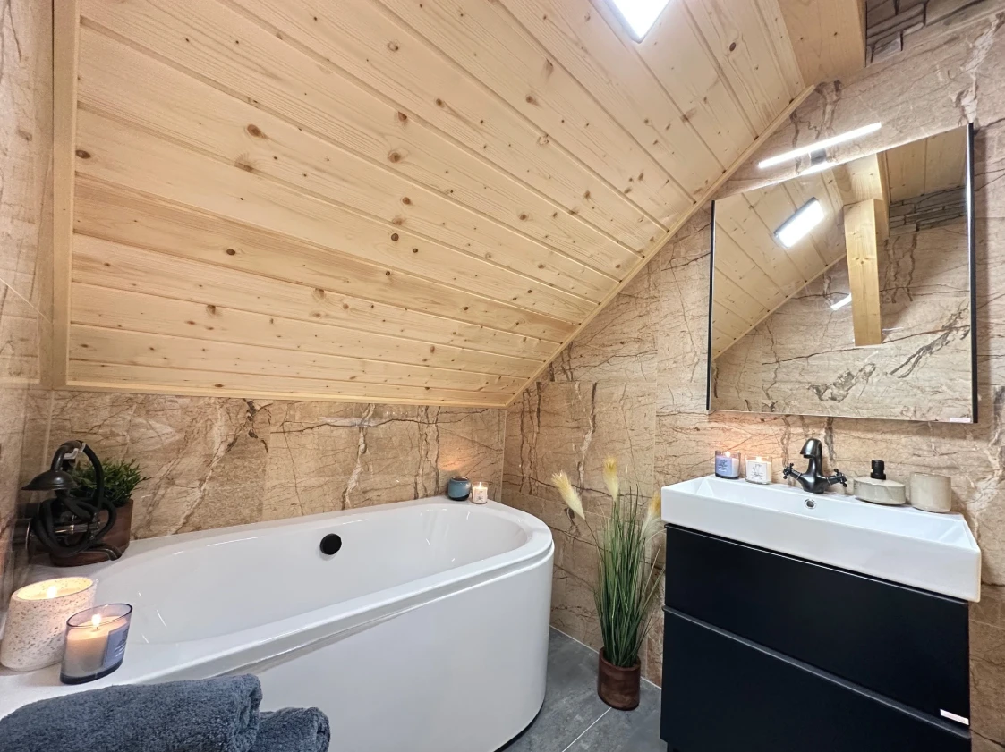 - Koupelna v patře: vana, umyvadlo se skříňkou, WC, ručníky, mýdlo a toaletní papír.