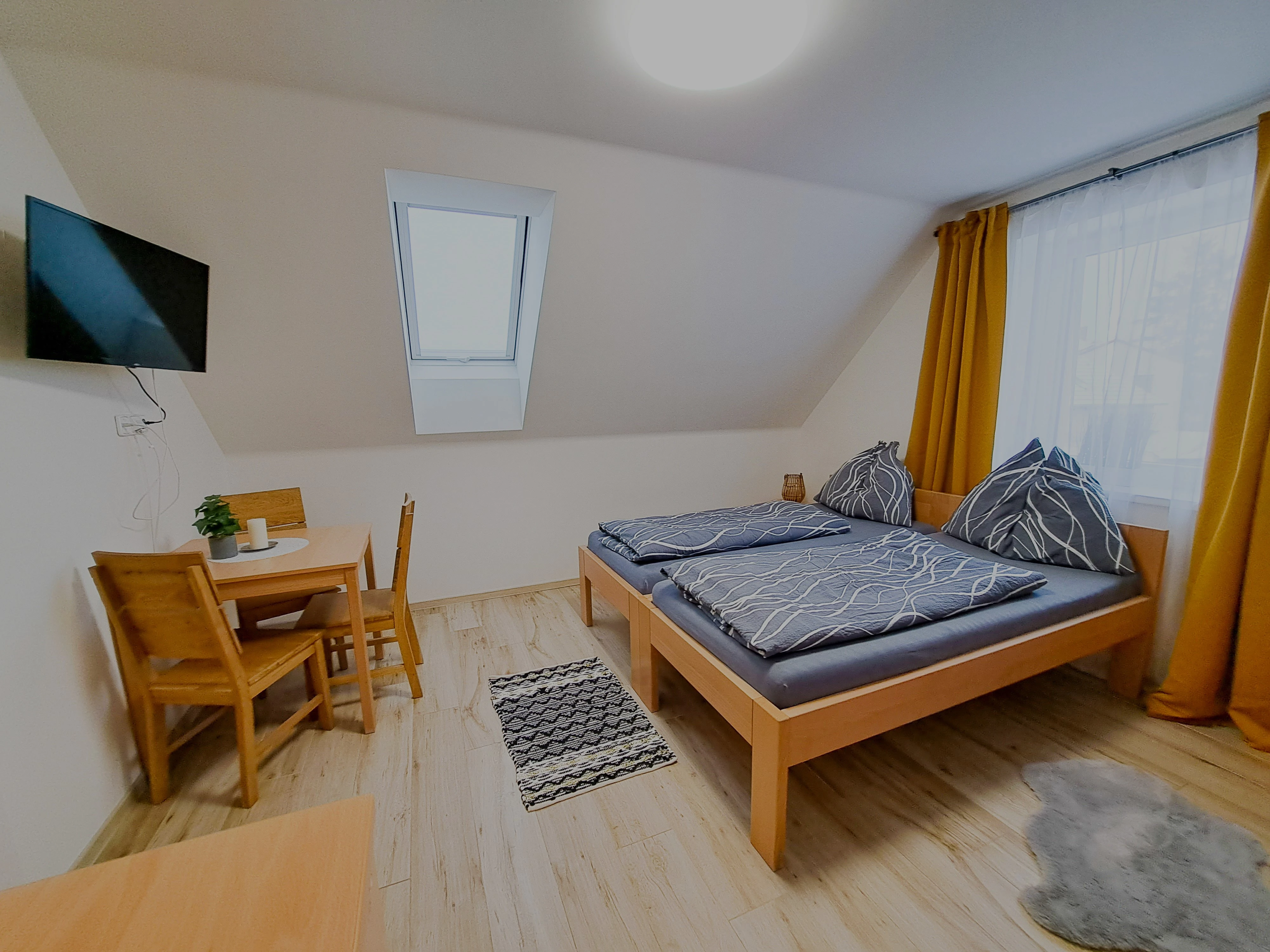 Ložnice: pohodlné postele, televize, jídelní posezení, šatní skříň