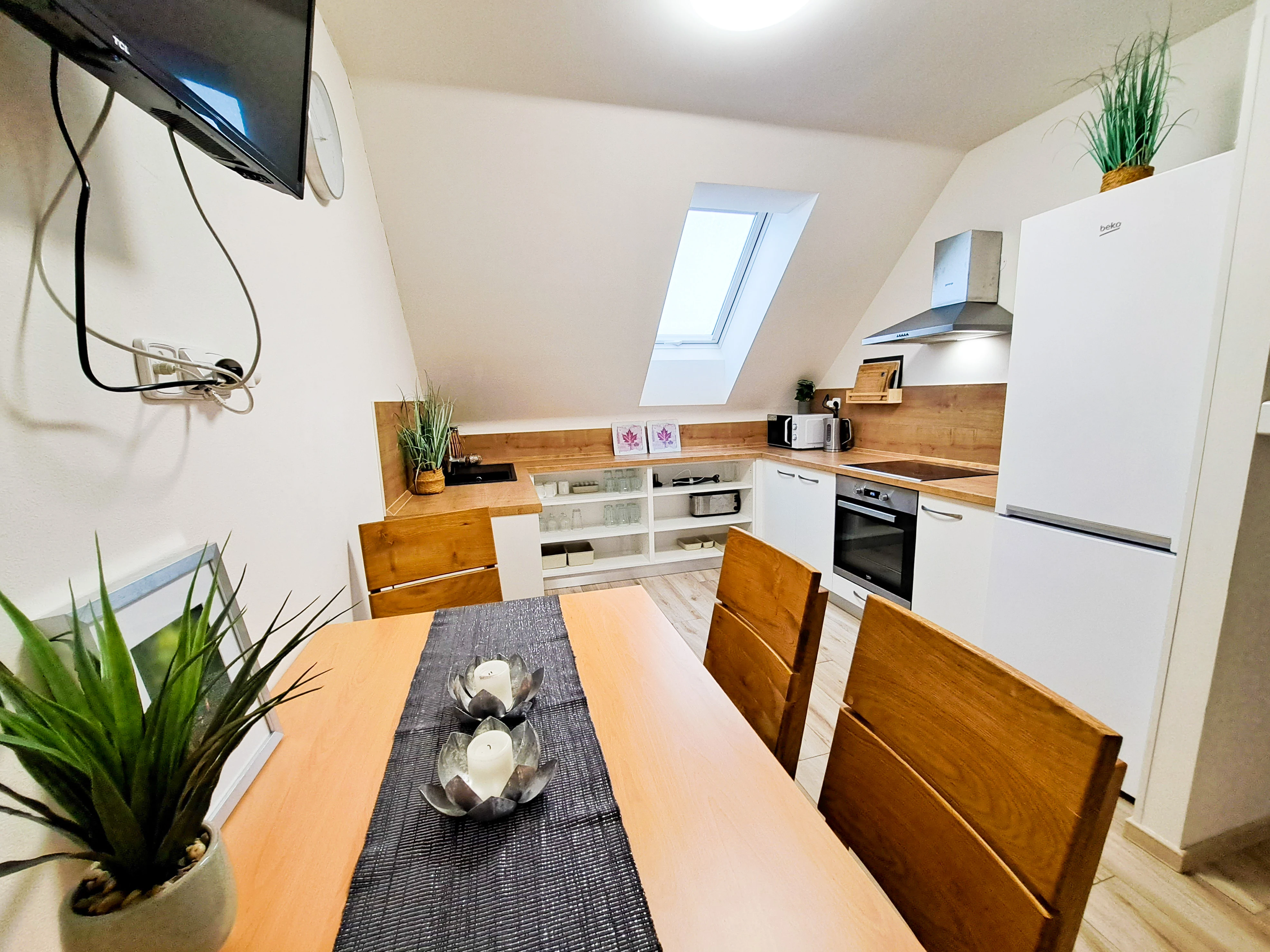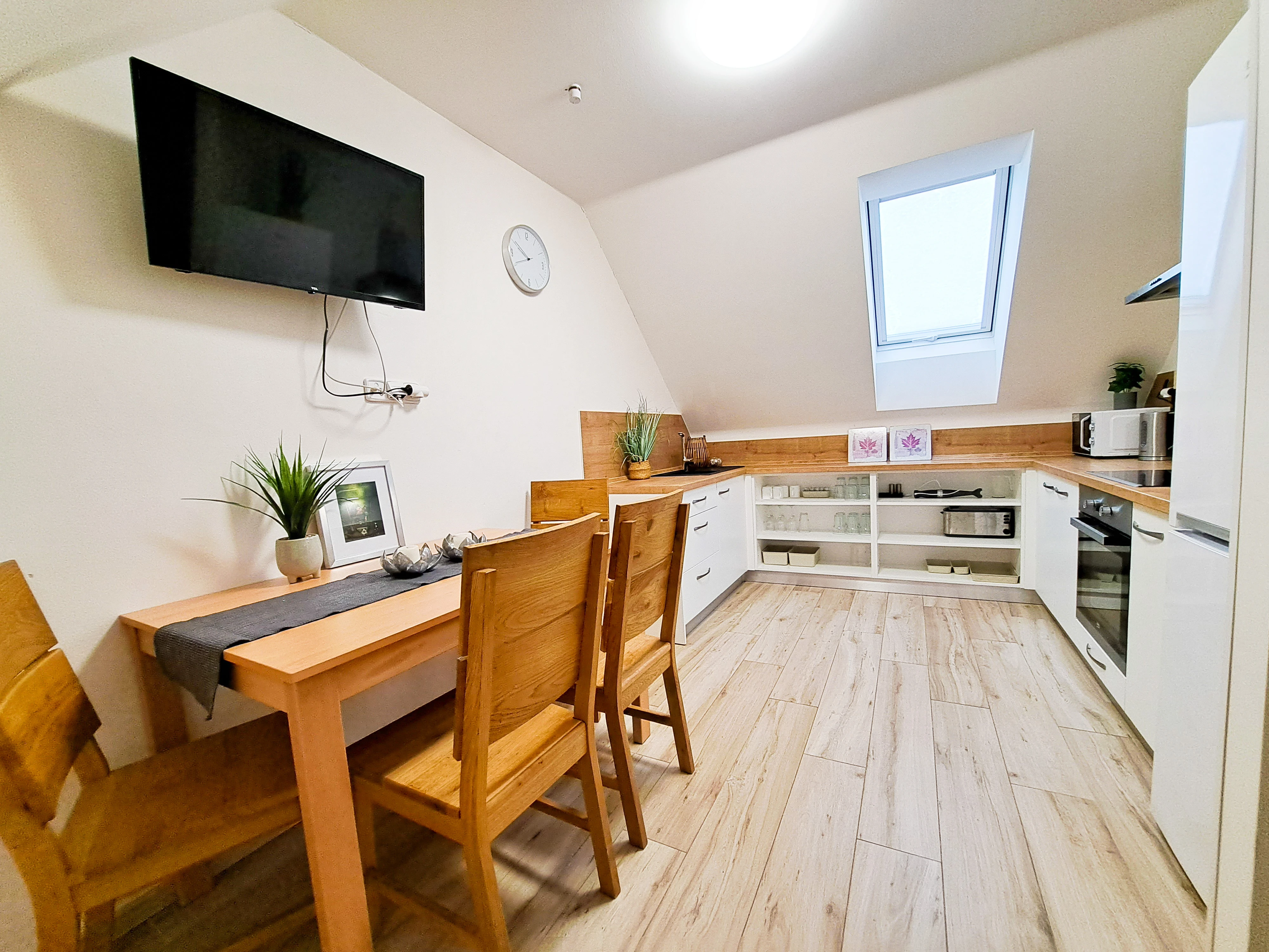 Tento útulný pokoj je ideální pro menší skupiny nebo rodiny. Nabízí tři pohodlná lůžka, vlastní koupelnu se sprchovým koutem a toaletou, a plně vybavenou kuchyň s elektrickou troubou, varnou deskou, mikrovlnnou troubou, lednicí, rychlovarnou konvicí a veškerým nádobím. Hosté mohou využít WiFi připojení zdarma, televizi a jídelní stůl se židlemi. Díky podlahovému vytápění si užijete maximální komfort po celý rok. Parkování je možné přímo u objektu.