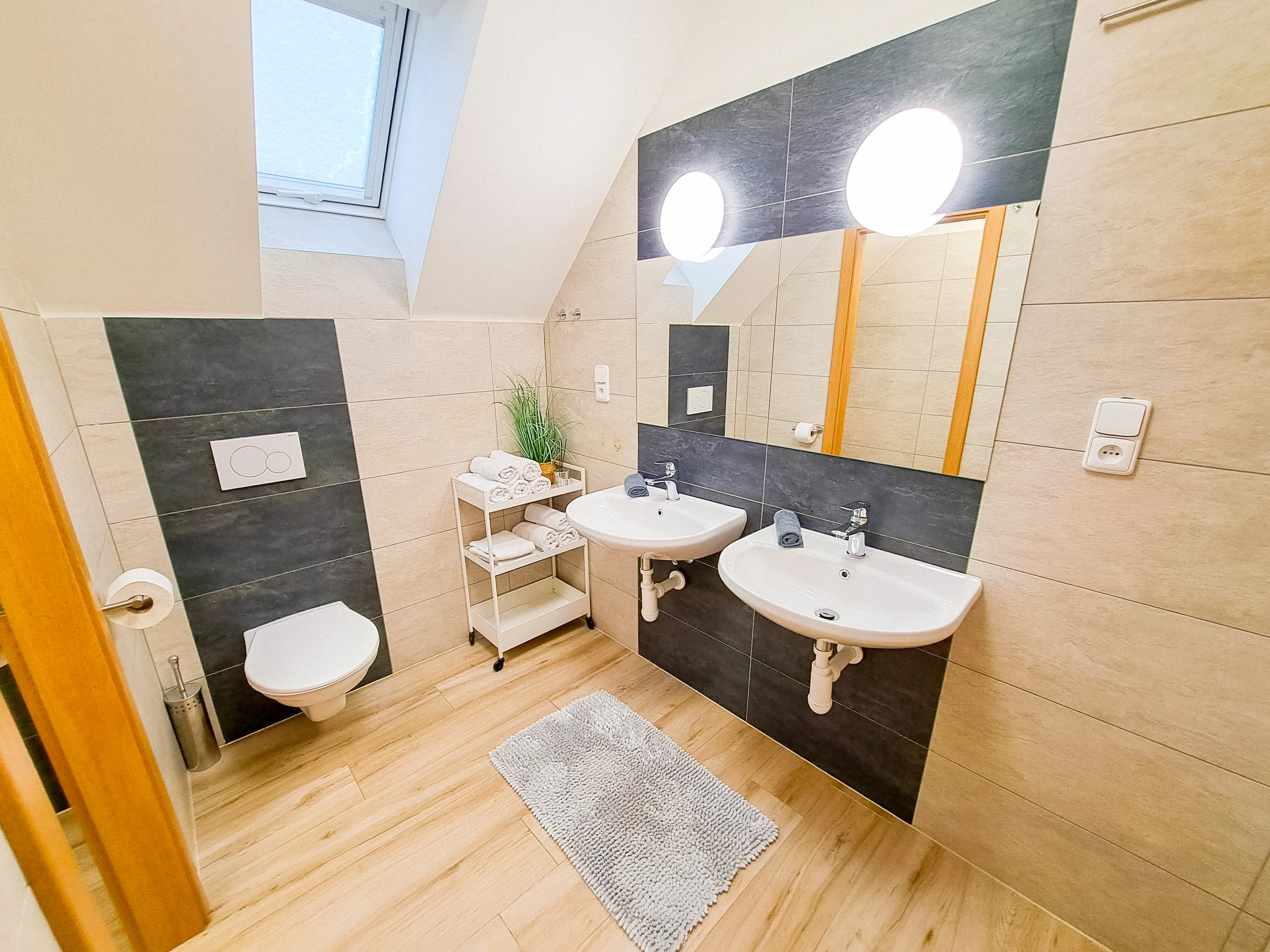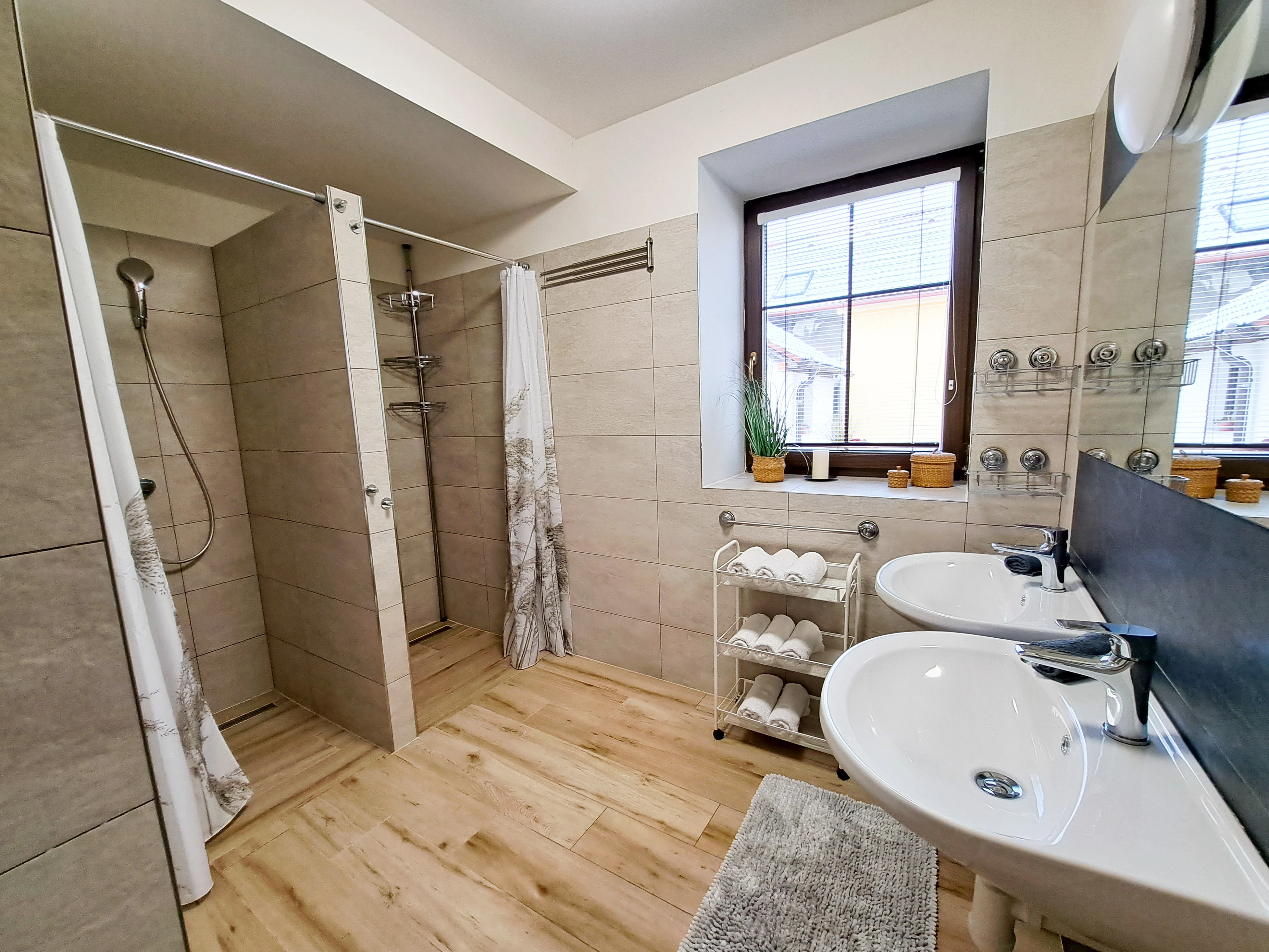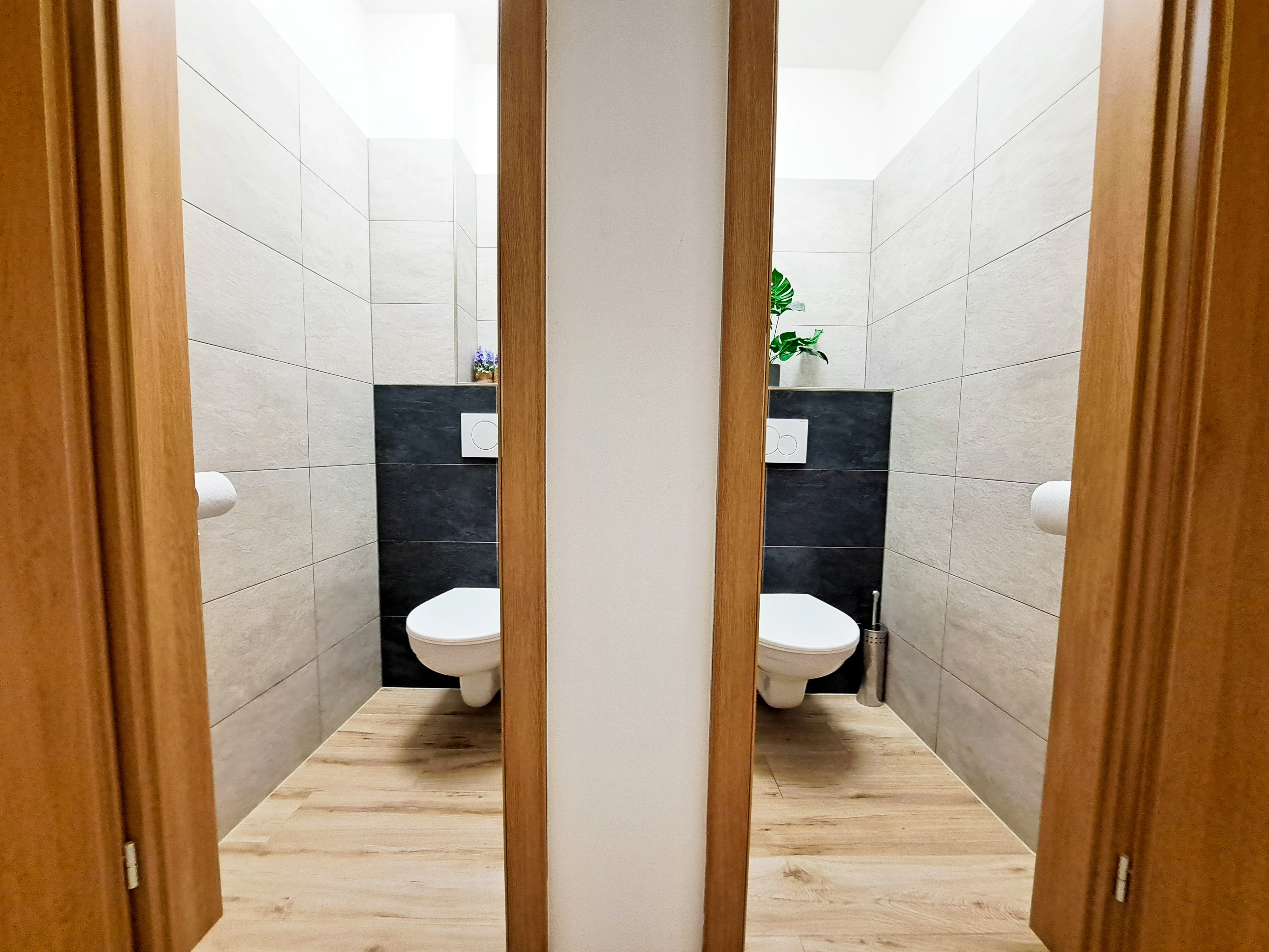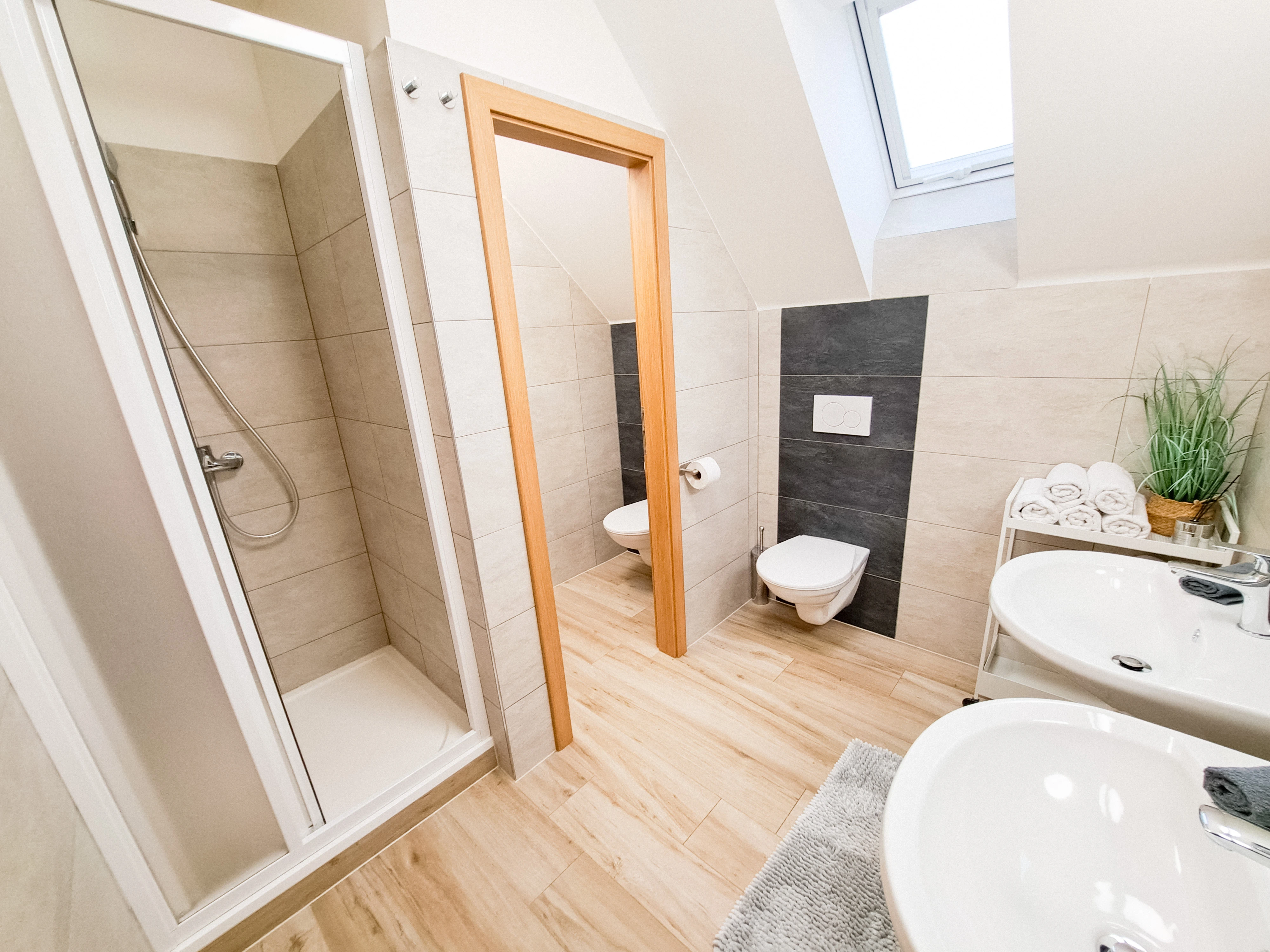 Koupelna: sprchový kout, toaleta, další samostatná toaleta