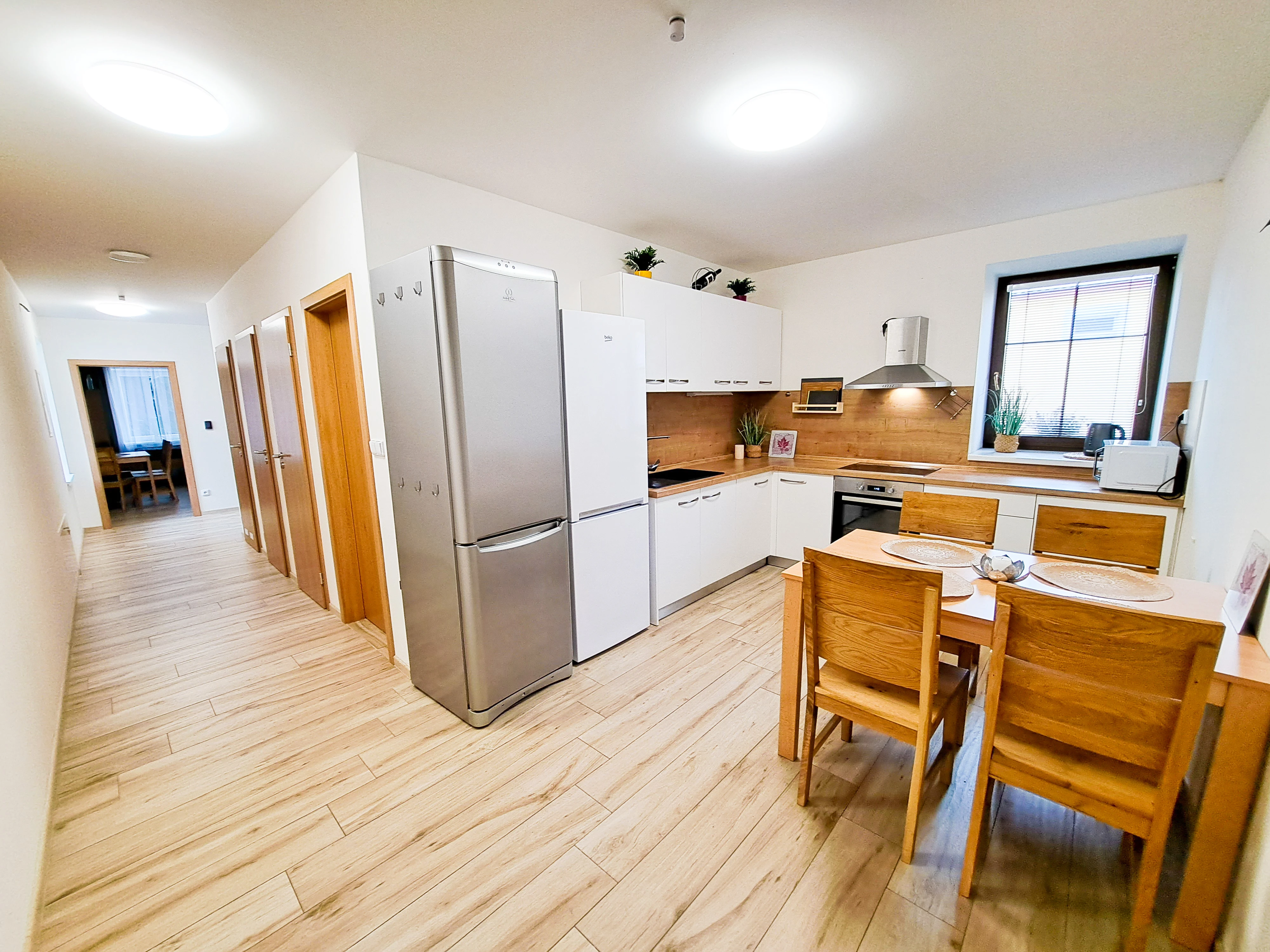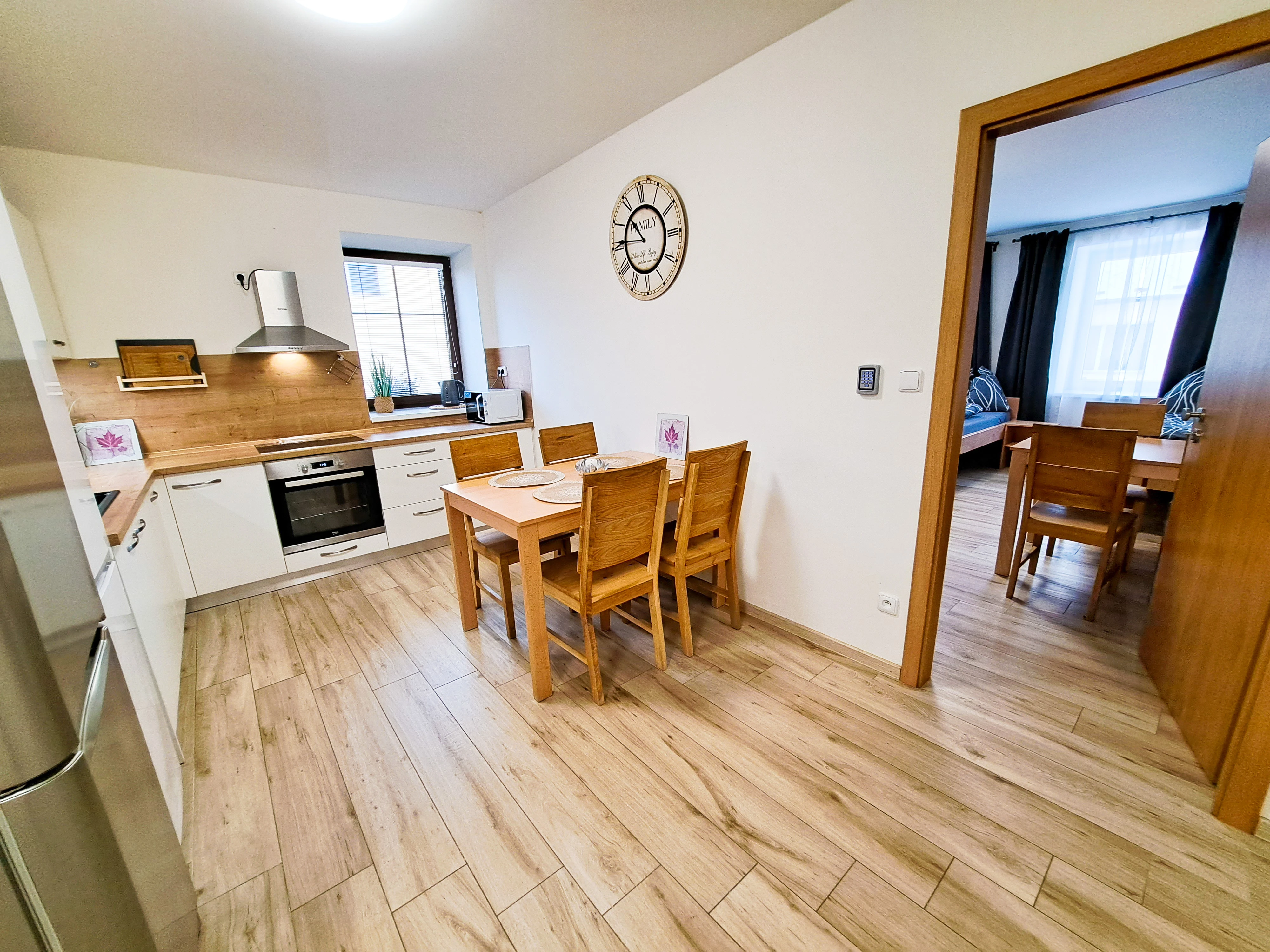Prostorný apartmán s kapacitou osmi osob je ideální pro větší skupiny či rodiny. Nabízí dvě samostatné ložnice s pohodlnými postelemi, televizí a úložným prostorem. Moderní kuchyň je vybavena elektrickou troubou, varnou deskou, mikrovlnnou troubou, lednicí a dalším kuchyňským vybavením. Součástí apartmánu je koupelna se sprchovým koutem a WC plus další samostatná toaleta. Hosté mají k dispozici WiFi připojení zdarma, podlahové vytápění a parkování přímo u objektu.