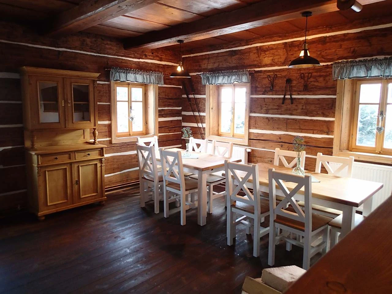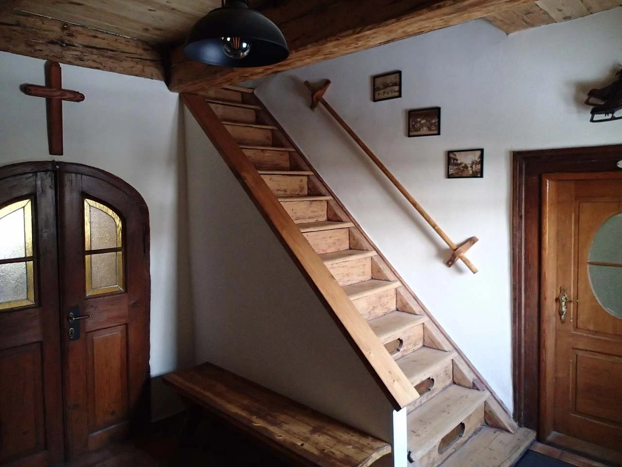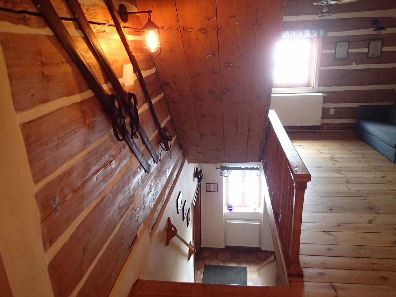 V přízemí se nachází chodba, lyžárna - kolárna s možností nabíjení elektrokol, velká společenská místnost s pecí a výčepem, jídelna, kuchyň, sklářská dílna, dvě toalety a kumbál - technická místnost. V prvním patře je velká chodba s rozkládací pohovkou a čtyři ložnice: 1x dvoulůžkový pokoj (dvoulůžko), 1x třílůžkový pokoj (dvoulůžko + jednolůžko), 1x čtyřlůžkový pokoj (4x jednolůžko) a 1x čtyřlůžkový dvoupokoj (1x dvoulůžko + 2x jednolůžko).