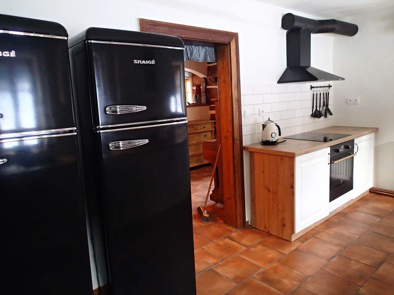 Kuchyně je kompletně zařízená a obsahuje indukční varnou desku, odsavač par, myčku nádobí, pečicí troubu, mikrovlnku, kávovar, elektrickou konvici, topinkovač a dva kombinované ledničky s mrazícím prostorem, včetně všech potřebných kuchyňských potřeb a doplňků.