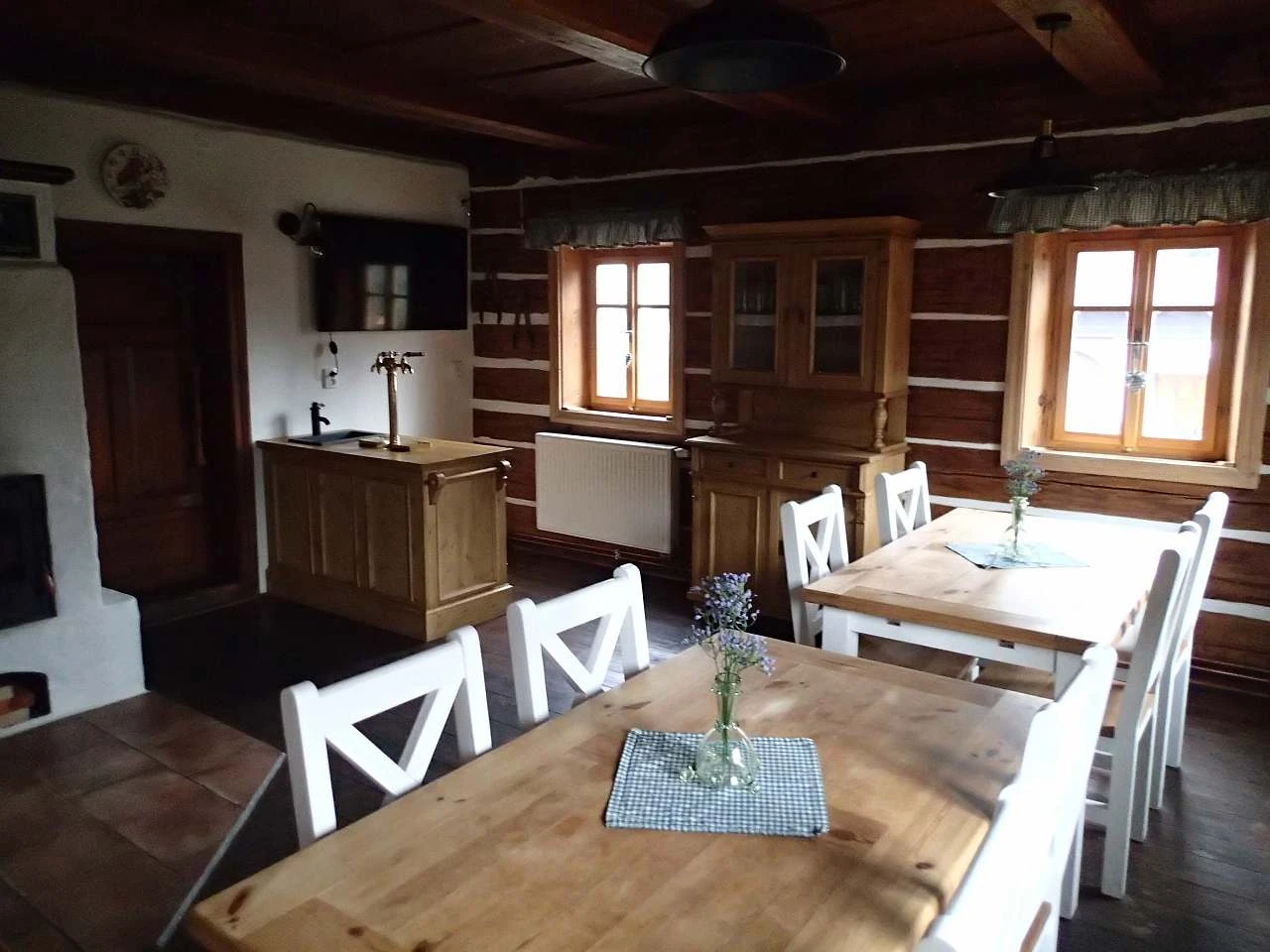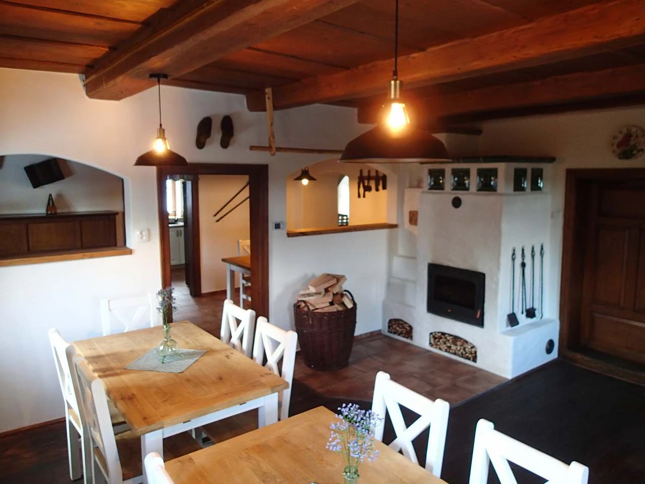 Ústřední topení a ohřev TÚV automatickým kotlem nebo možnost topení dřevem v peci ve společenské místnosti. Pec je napojena do rozvodů topení a dřevo je zdarma.