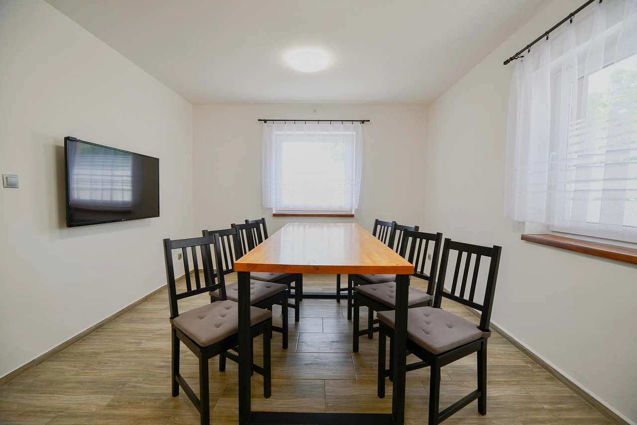 K dispozici je obývací pokoj s krbem, televizí a jídelním stolem, prostorná kuchyně, uzamykatelný prostor pro uložení kol, rybářského vybavení apod. Parkovací místa jsou v bezprostřední blízkosti ubytování a celý pozemek je oplocený.