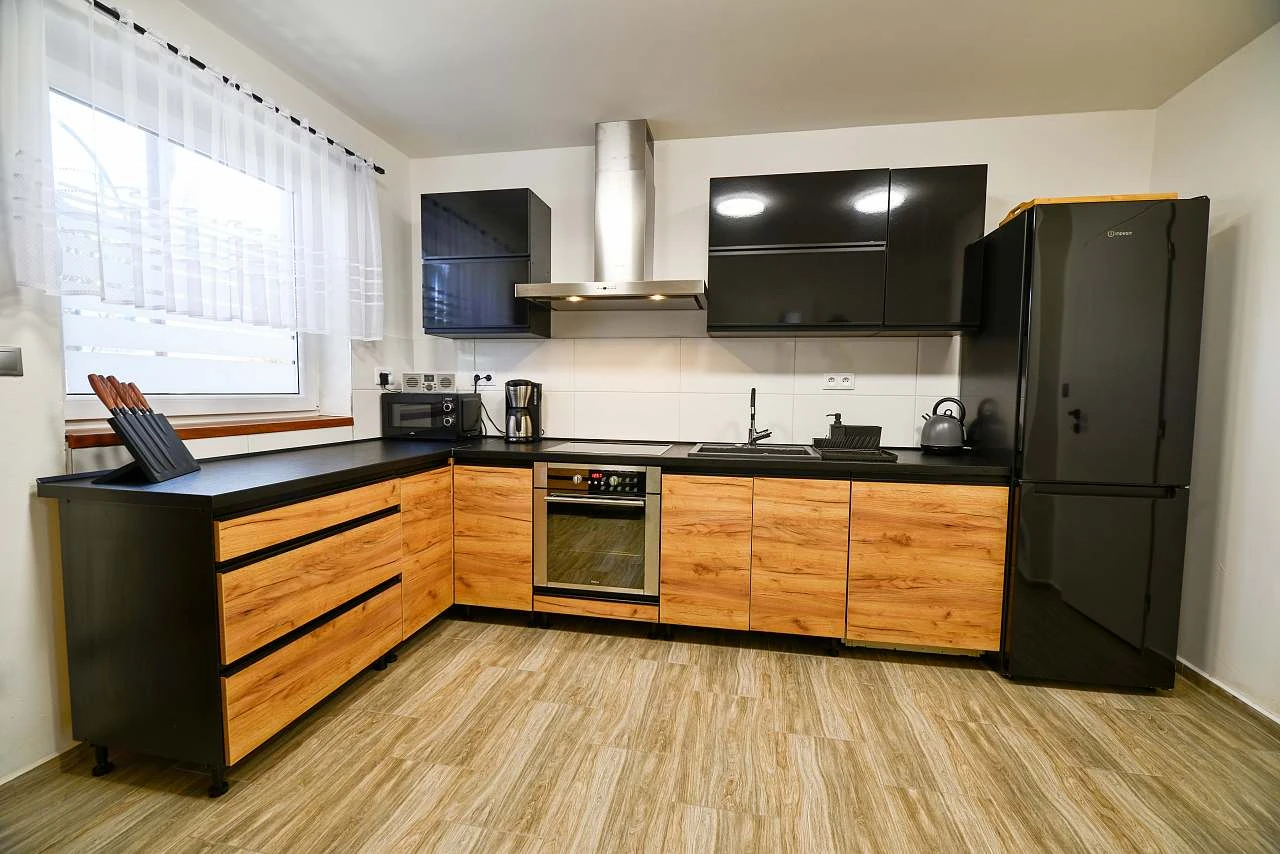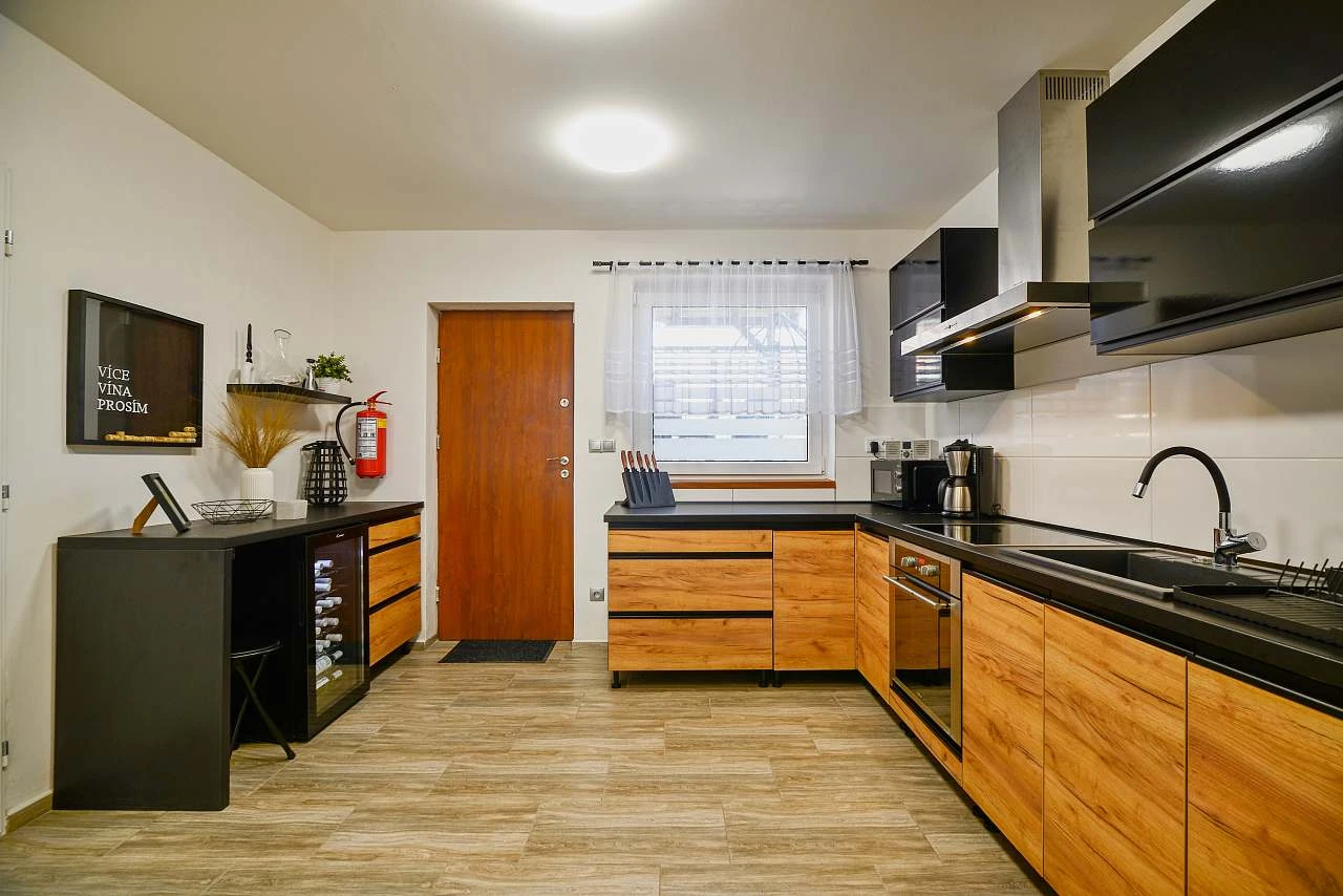 - plně vybavená kuchyňská linka (lednička s mrazákem, trouba, varná deska, mikrovlnná trouba, rychlovarná konvice, kávovar, myčka, veškeré nádobí)