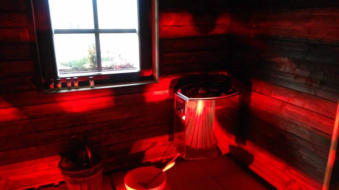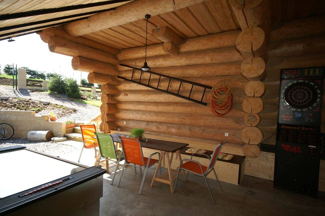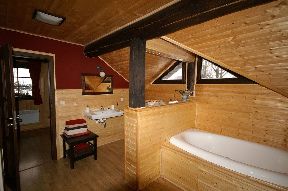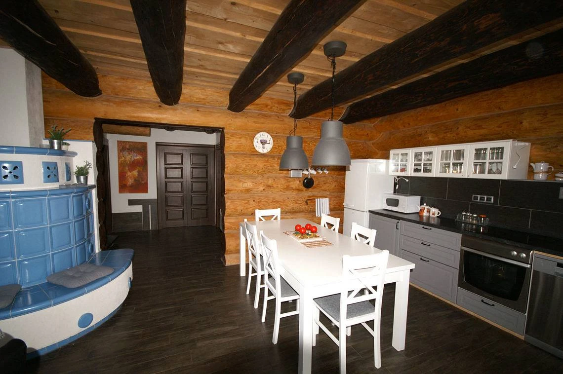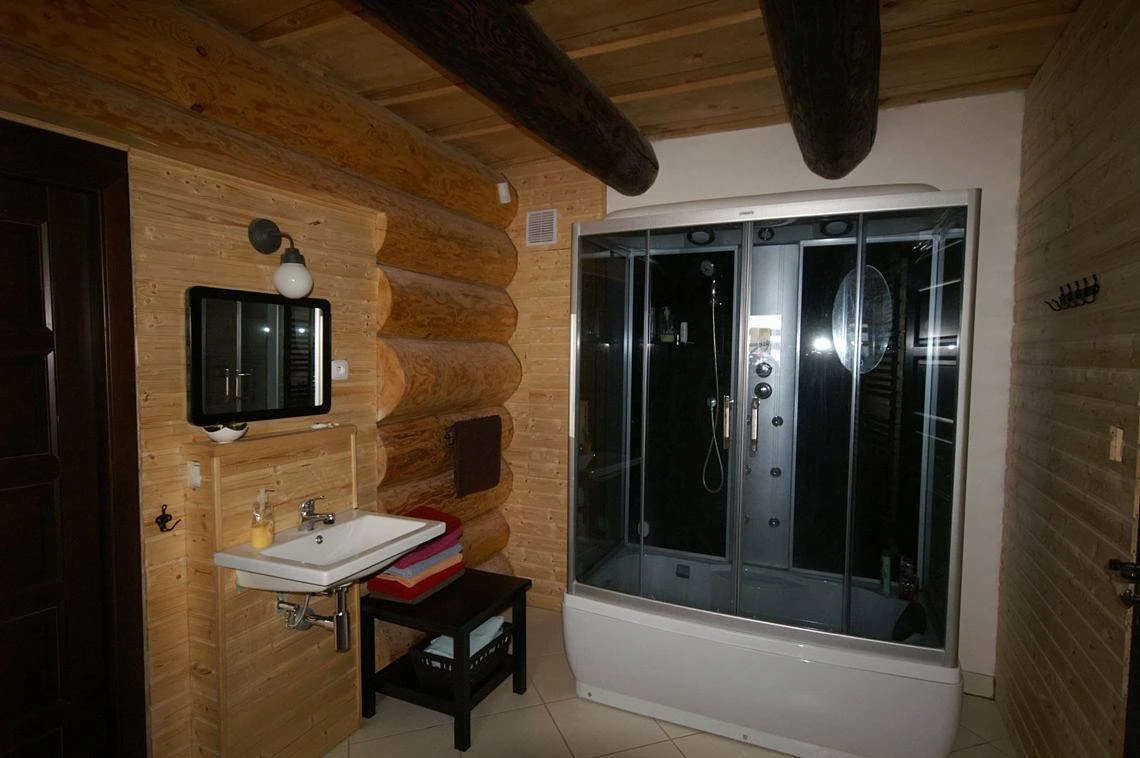 Ve srubu je kuchyňský a jídelní kout, koupelna se sprchovým koutem (masážní trysky s párou + rádiem, ) bidet a WC.