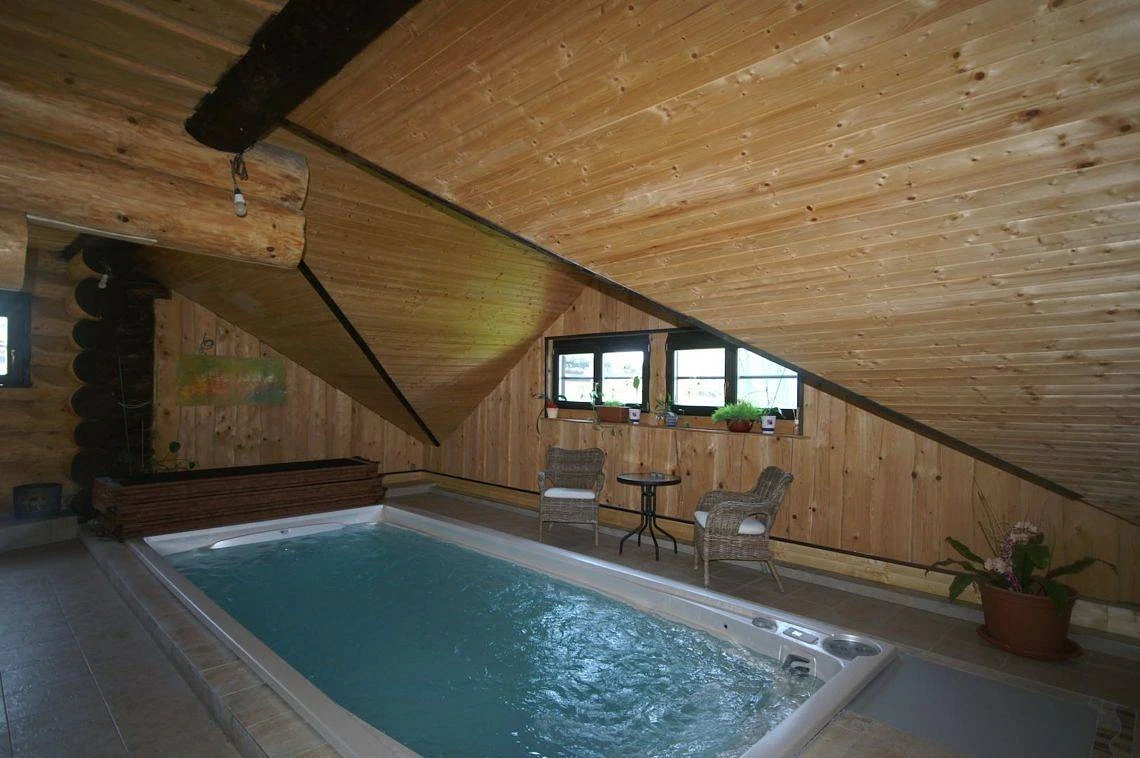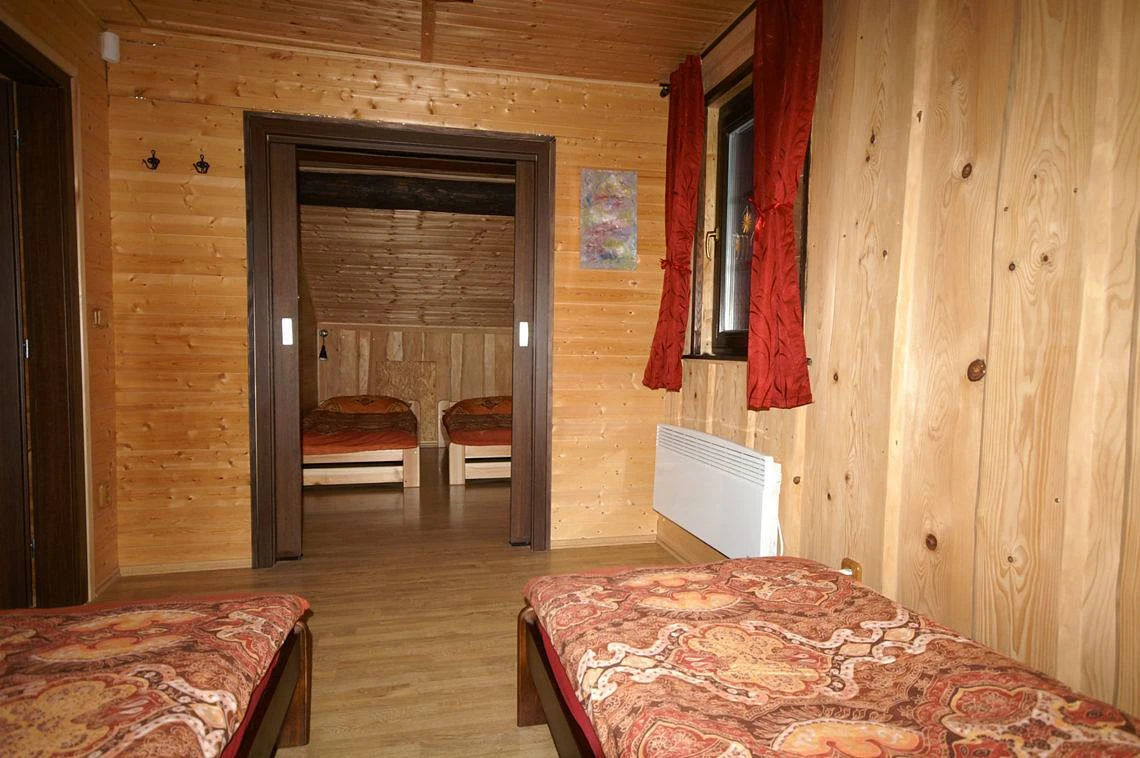 Srub k pronajmutí poskytuje ubytování pro 8 osob ve 4 ložnicích.