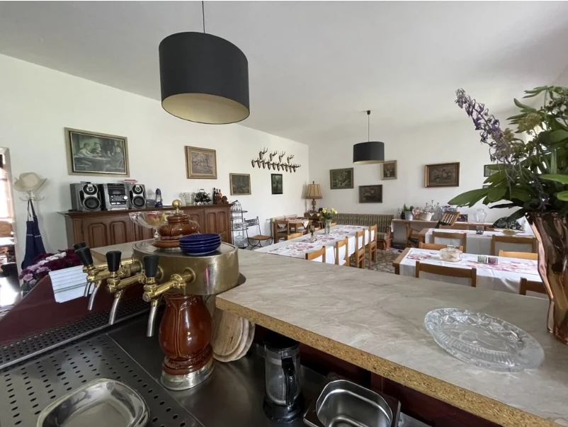 Dominantou společných prostor je jídelna s výčepem, která večer slouží jako hospůdka a ráno se zde podává bohatá snídaně. K dispozici je kombinovaná lednice, rychlovarná konvice, mikrovlnná trouba, kávovar a toustovač. Jídelna je propojena se společenskou místností s kachlovými kamny, pohodlnými gauči a křesly. Kuchyni a společenskou místnost lze využívat po dohodě.
