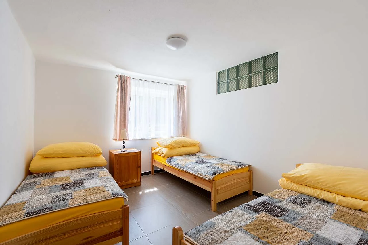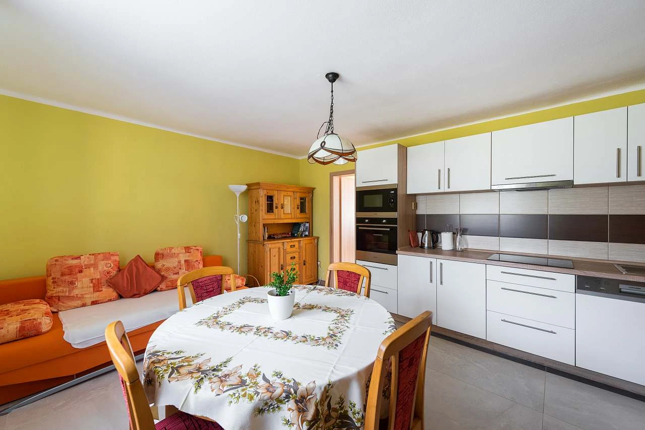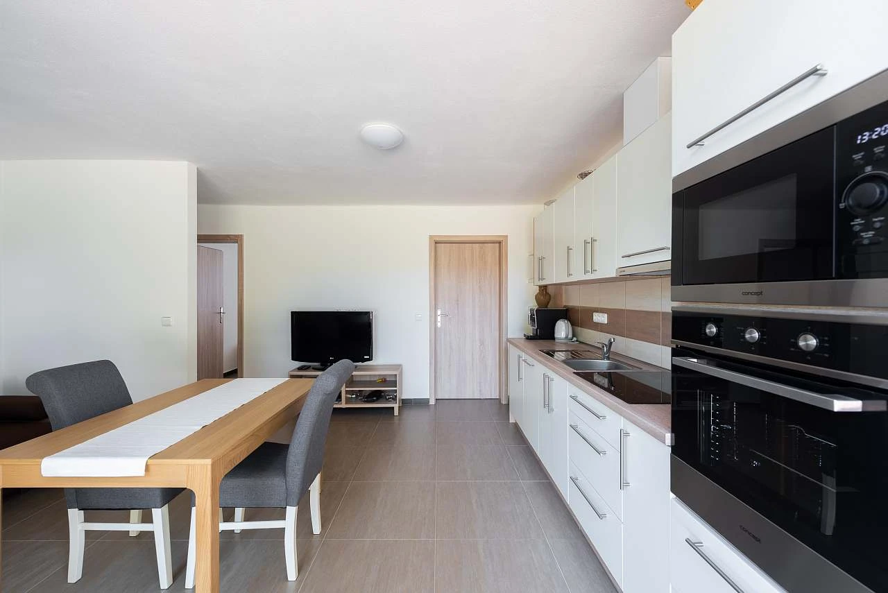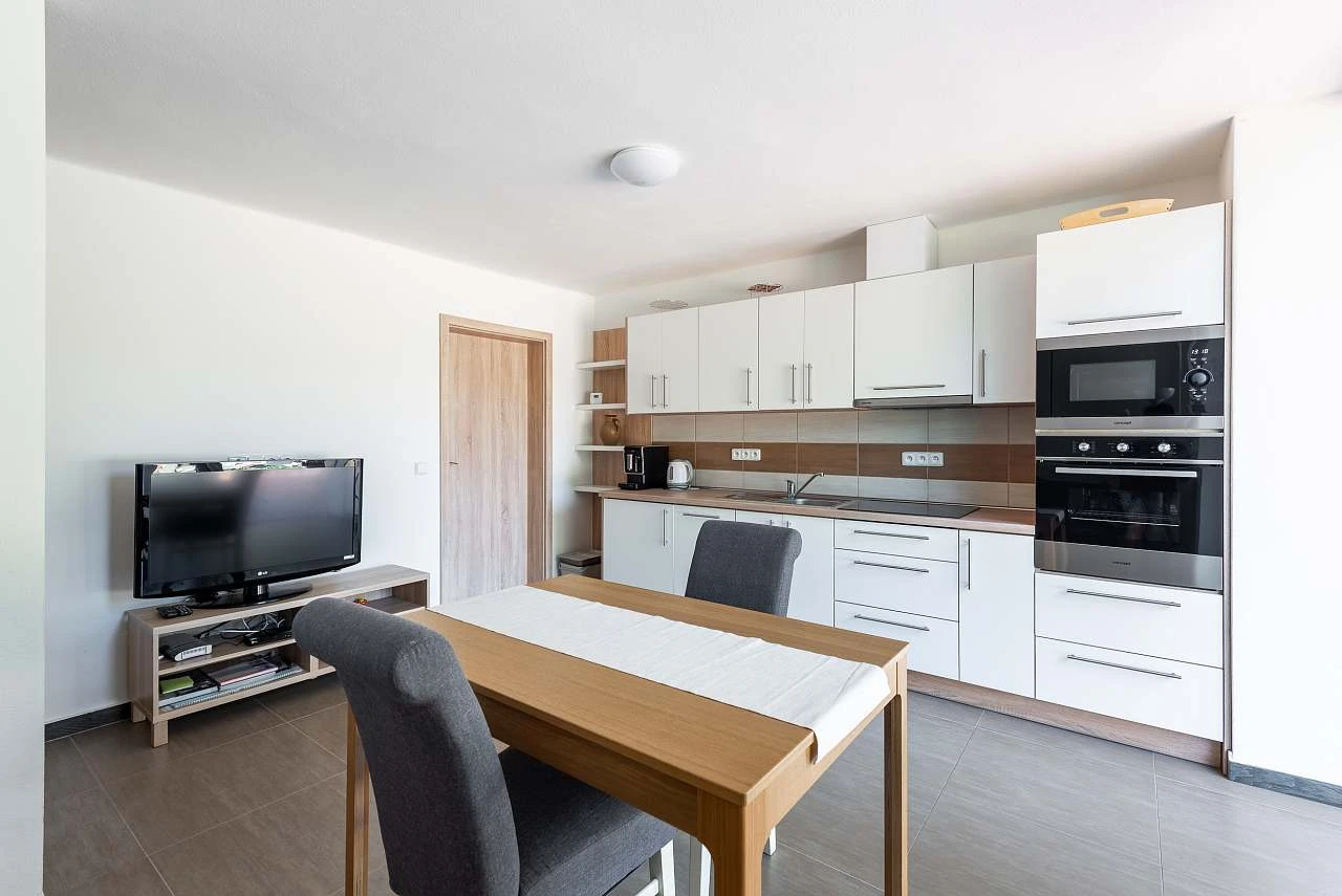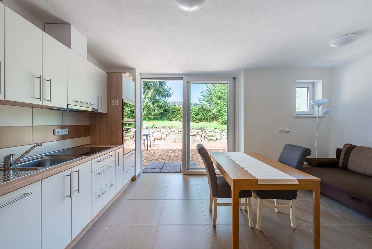 Apartmán č. 1 je vhodný pro 1-6 osob a disponuje ložnicí, obývacím pokojem s rozkládacím gaučem, kuchyní, koupelnou a samostatnou terasou.