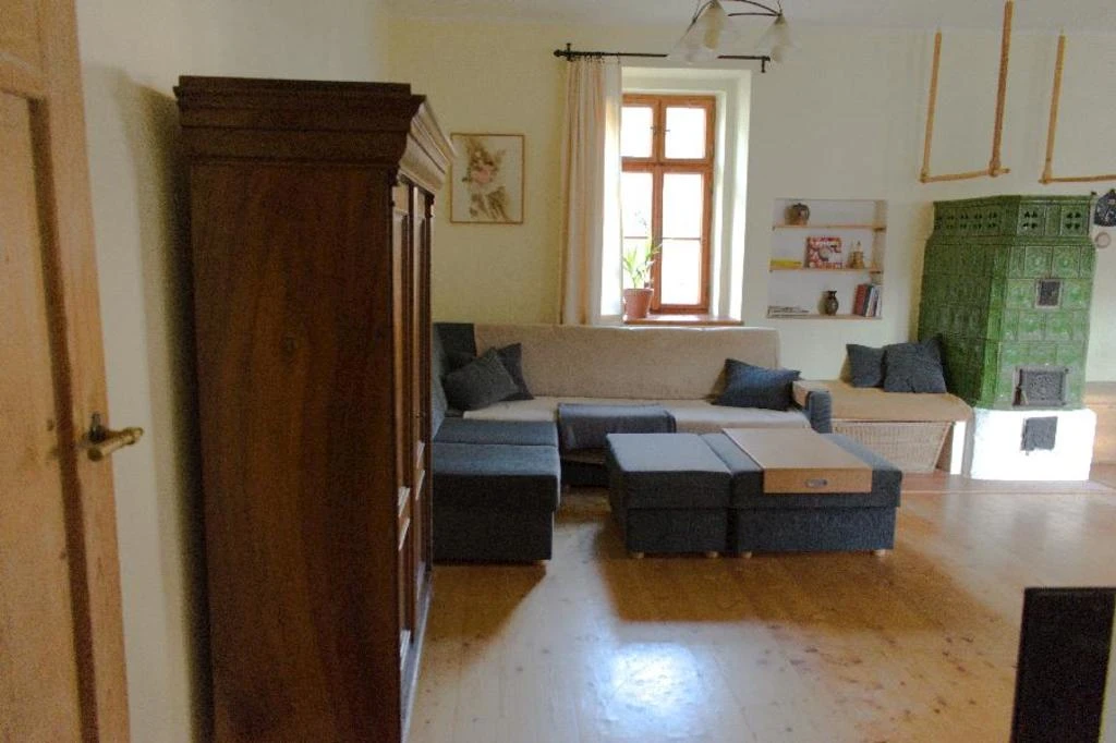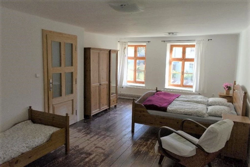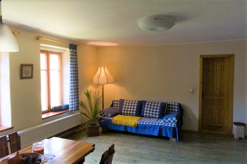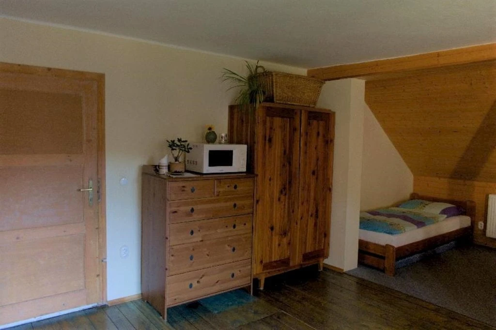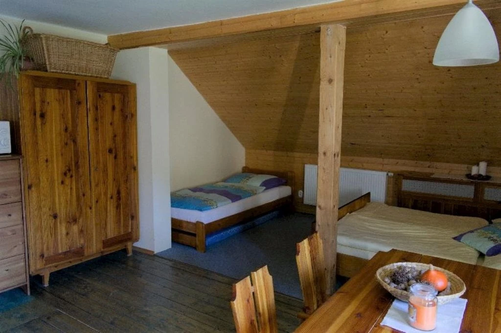Velký podkrovní apartmán má dvě ložnice, jednu s dvěma lůžky (dvě samostatné postele) a druhou s třemi lůžky (dvoulůžková postel a jednolůžko). Obývací pokoj je dominován krbovými kachlemi. Najdete zde také komfortní gauč, televizi a jídelní stůl. Kuchyň je integrovaná do obývacího pokoje, kde je k dispozici rychlovarná konvice, keramický sporák, lednice s mrazákem a veškeré nádobí. Koupelna s vanou a samostatná toaleta jsou samozřejmostí.