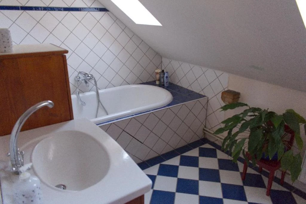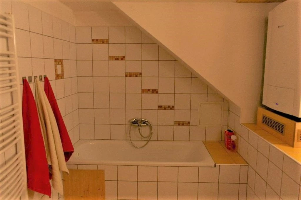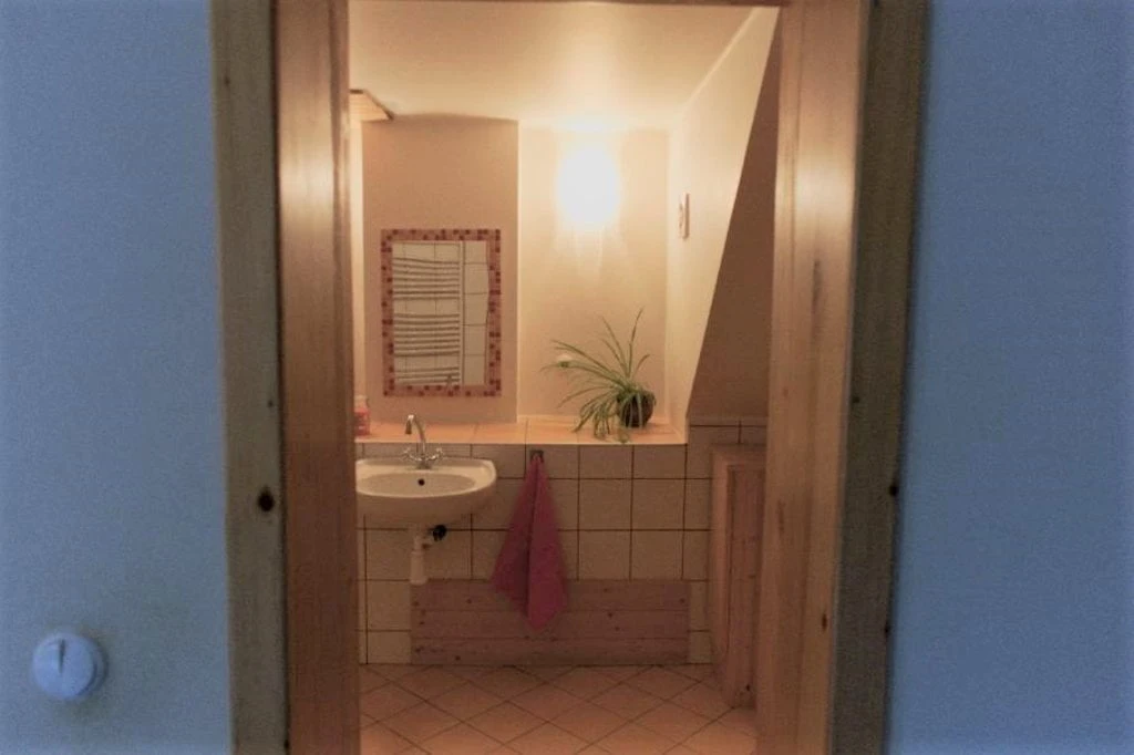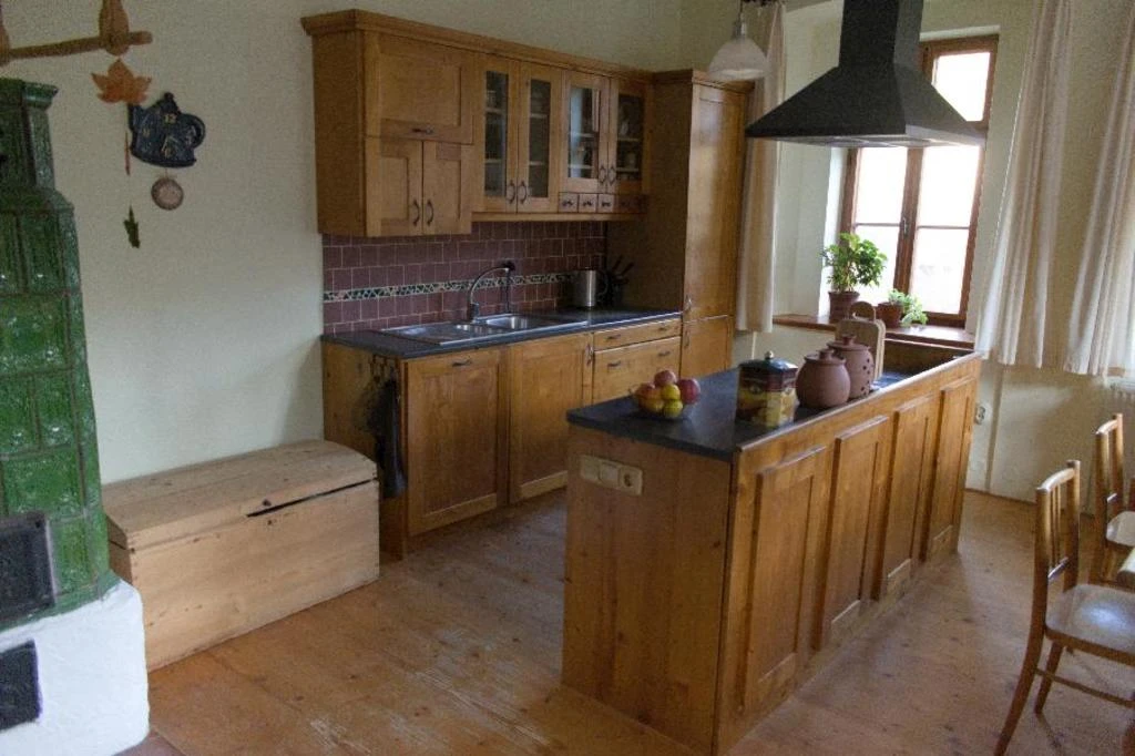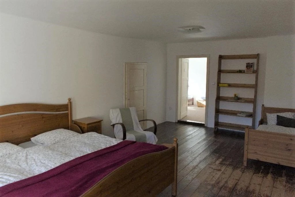 Velký podkrovní apartmán má dvě ložnice, jednu s dvěma lůžky (dvě samostatné postele) a druhou s třemi lůžky (dvoulůžková postel a jednolůžko). Obývací pokoj je dominován krbovými kachlemi. Najdete zde také komfortní gauč, televizi a jídelní stůl. Kuchyň je integrovaná do obývacího pokoje, kde je k dispozici rychlovarná konvice, keramický sporák, lednice s mrazákem a veškeré nádobí. Koupelna s vanou a samostatná toaleta jsou samozřejmostí.