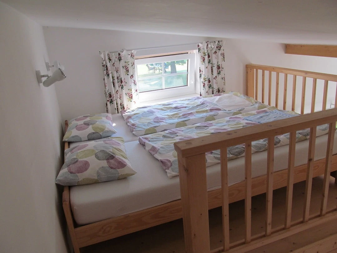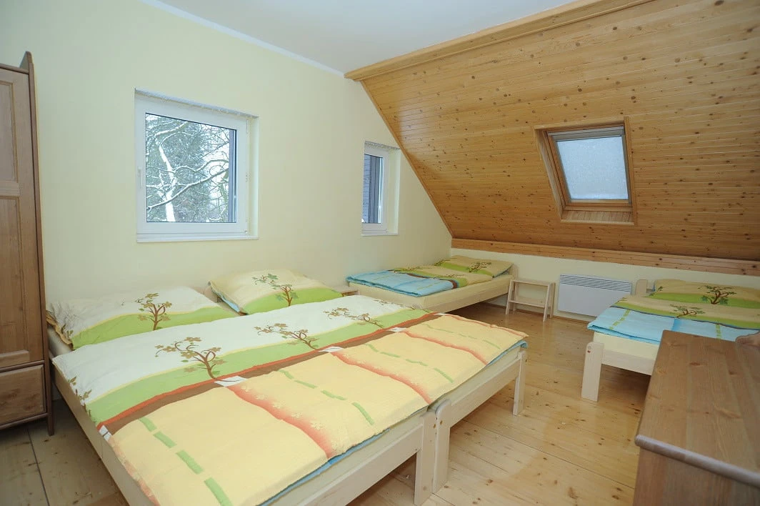 Nabízíme komfortní podkrovní apartmán (70 m²) v samostatně stojícím objektu, ideální pro rodiny a skupiny přátel. K dispozici je ložnice se 4 lůžky, oddělený obývací pokoj s kuchyňským koutem a dvě rozkládací křesla pro další hosty.