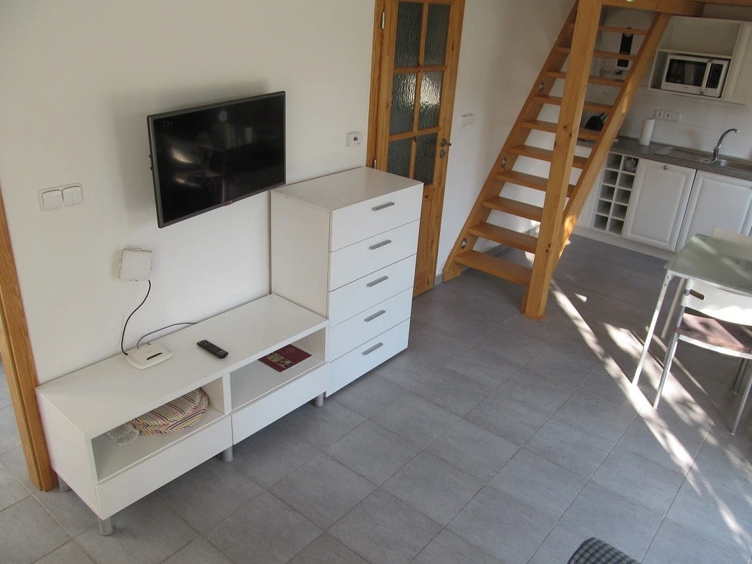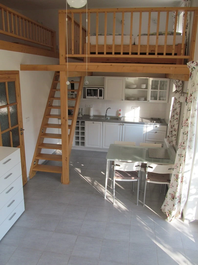 Druhou možností je menší apartmán (30 m²) s vestavěnou ložnicí. Kapacita je až 4 osoby (3 postele na patře, rozkládací gauč dole).