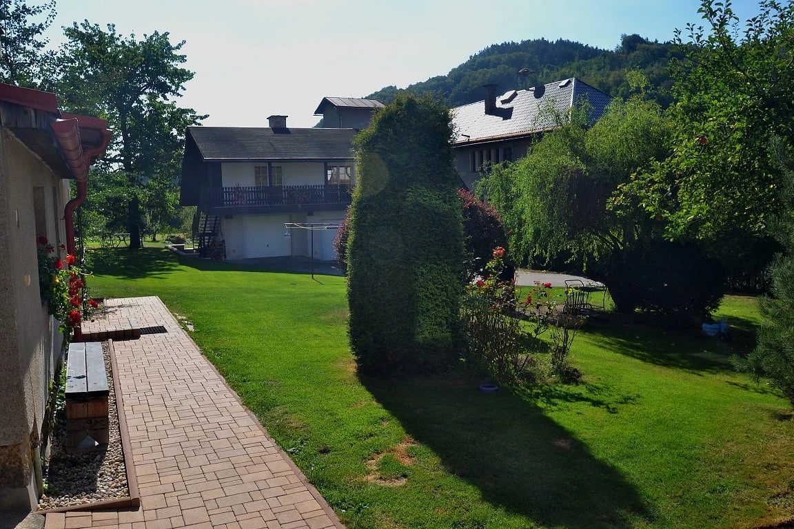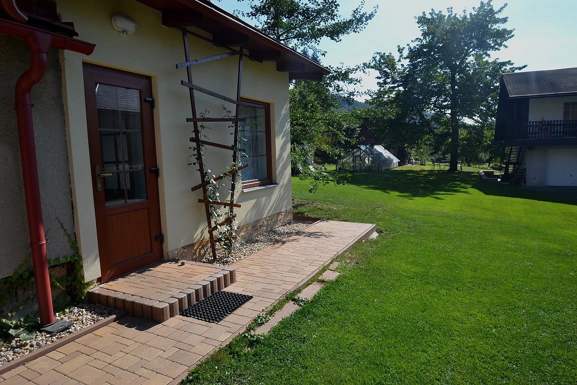 Pro oba apartmány je k dispozici velká oplocená zahrada s možností parkování za plotem. Na zahradě je postavena zastřešená pergola z části uzavřená určená pro úschovu kol a druhá část je otevřená. Vedle pergoly je zahradní gril z pískovcových kamenů, v rohu zahrady je malé dětské pískoviště.
