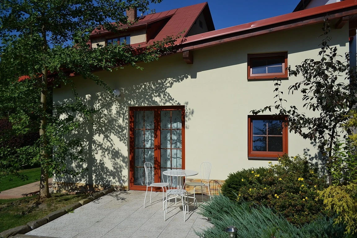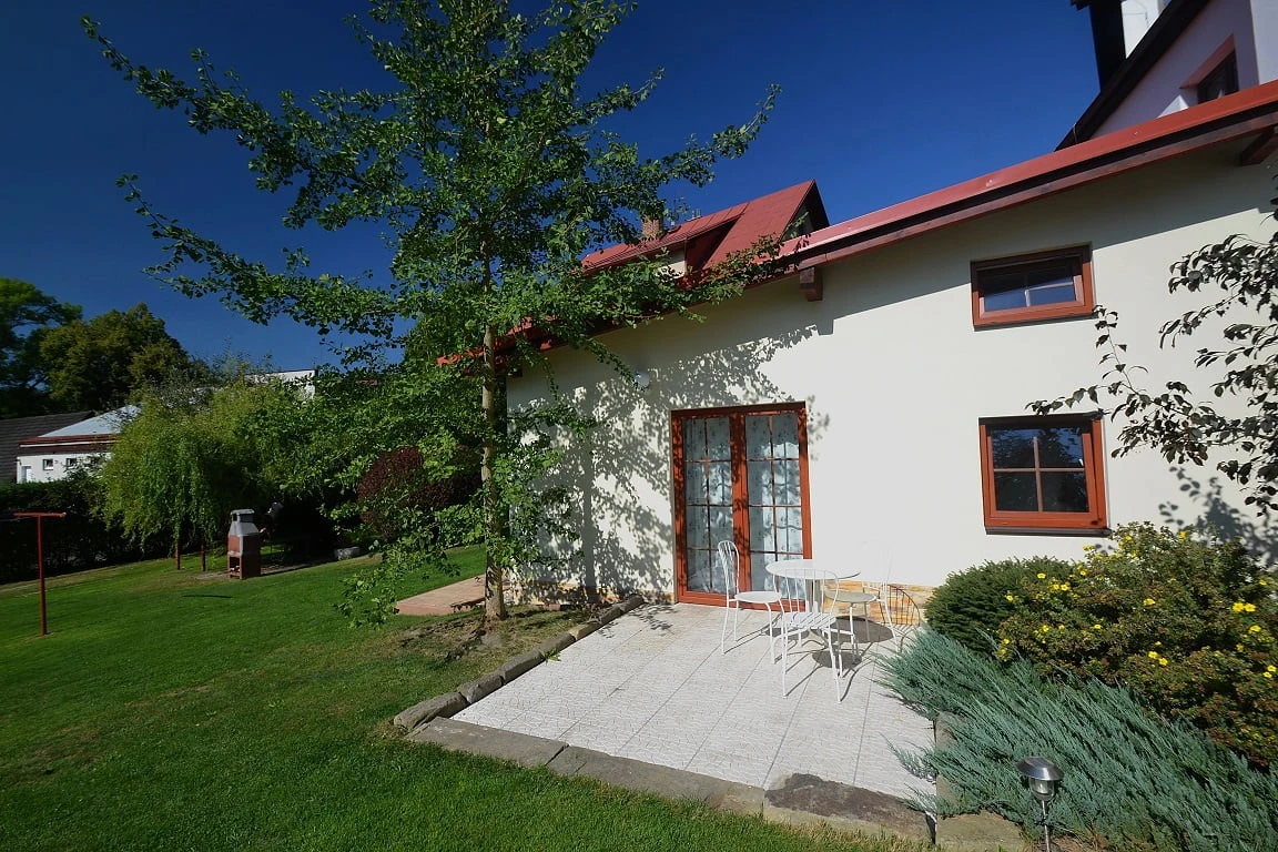 Součástí je terasa se zahradním nábytkem, kterou v létě příjemně stíní jinan dvoulaločný. Parkování je za oploceným pozemkem.