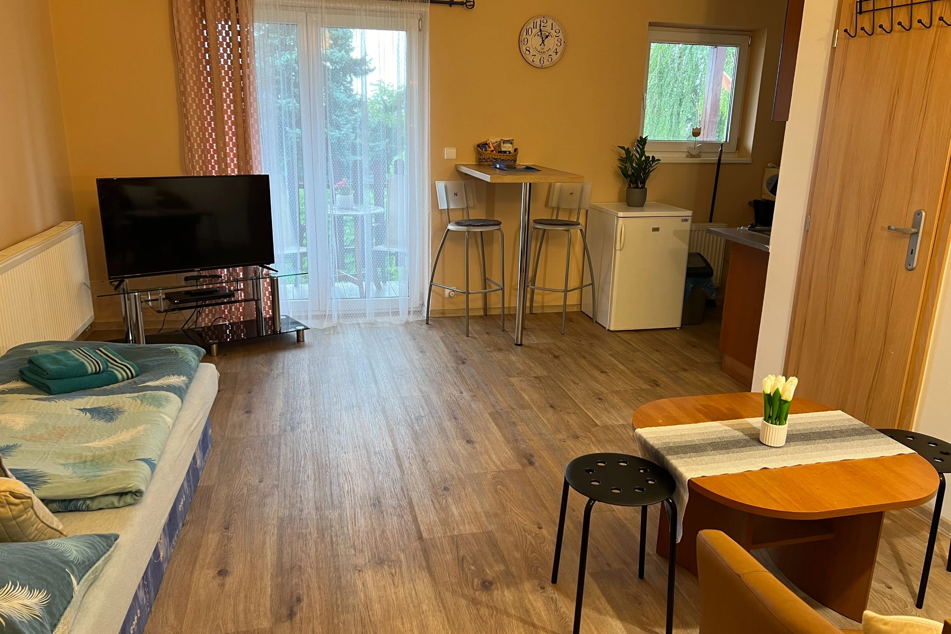Obývací prostor obsahuje další jednolůžkovou postel, gauč, televizi se satelitním příjmem a balkon s posezením, který nabízí výhled do zahrady.