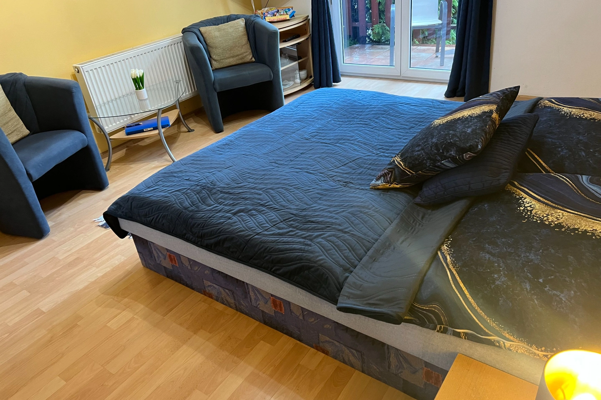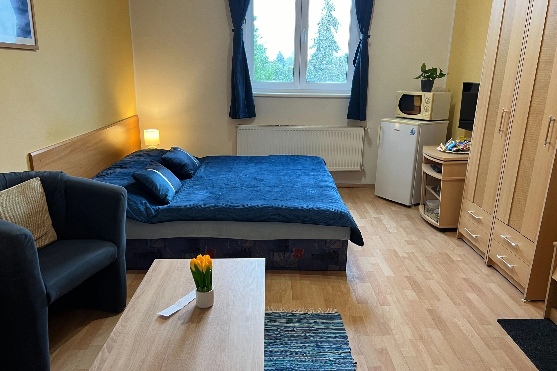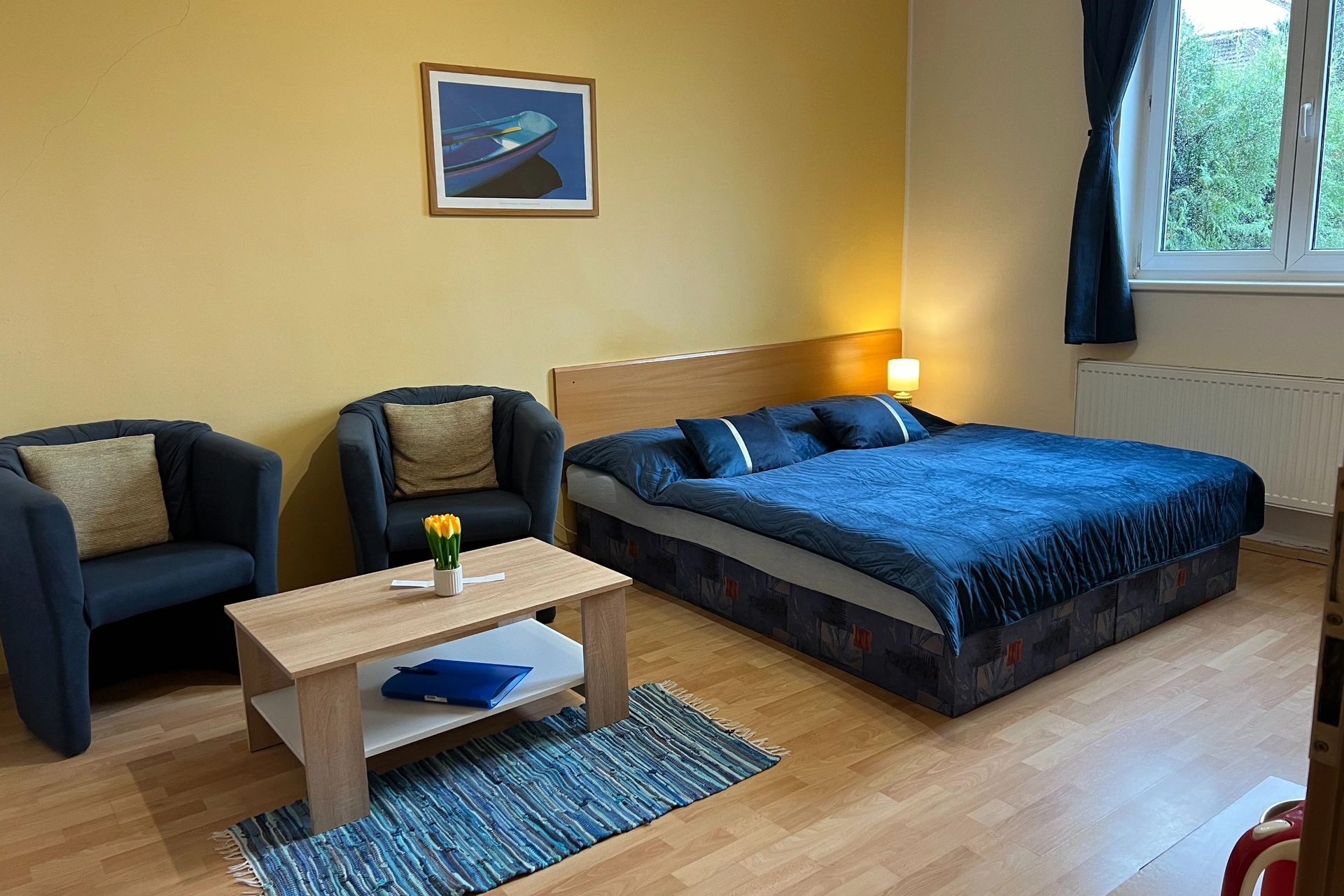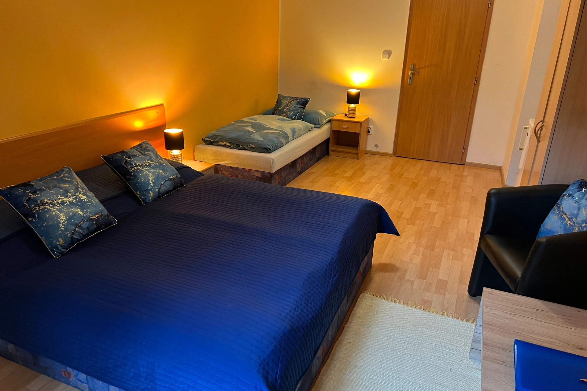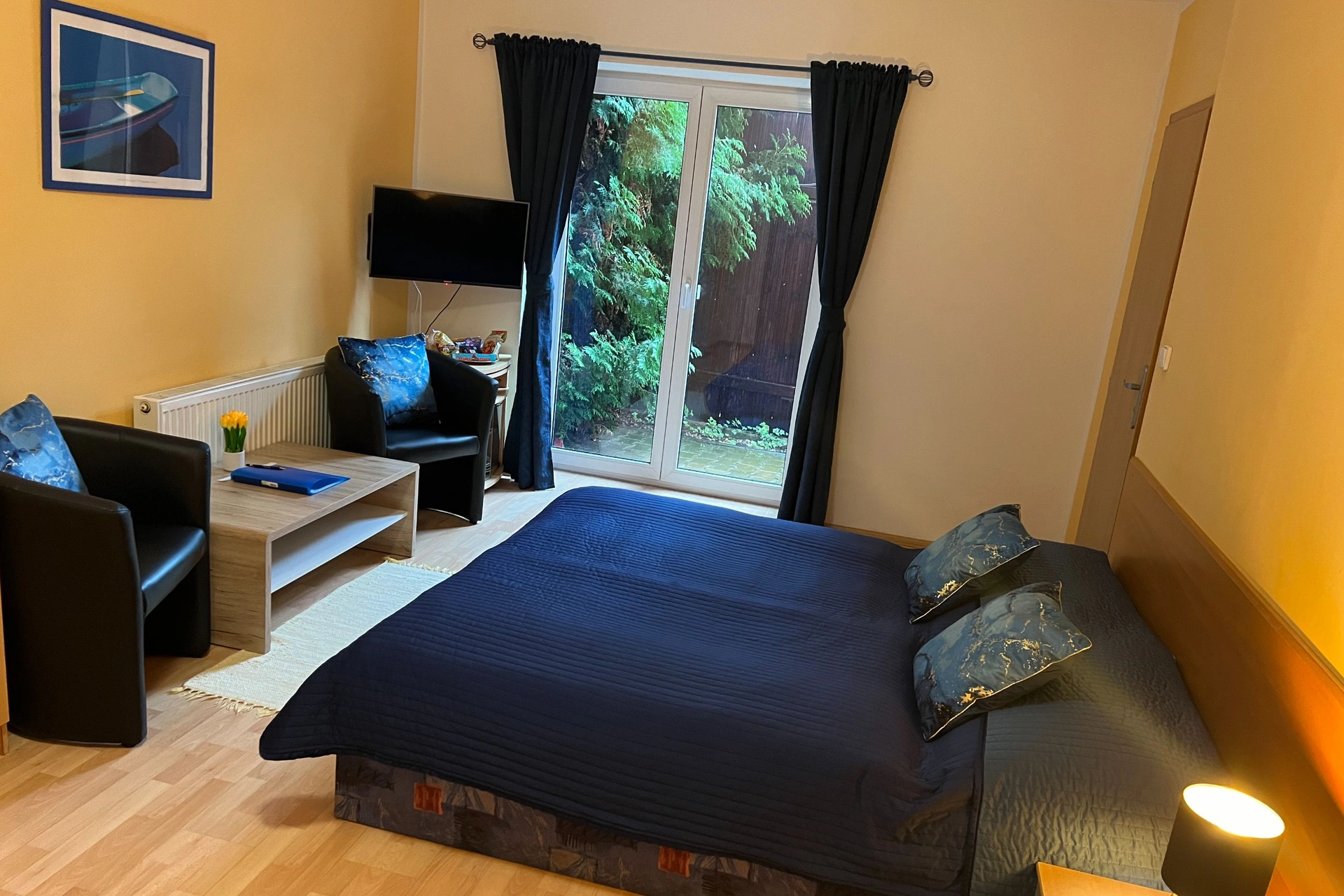 - Čtyřlůžkový apartmán s balkonem (manželské a samostatné lůžko v ložnici + samostatné lůžko v obývacím pokoji)