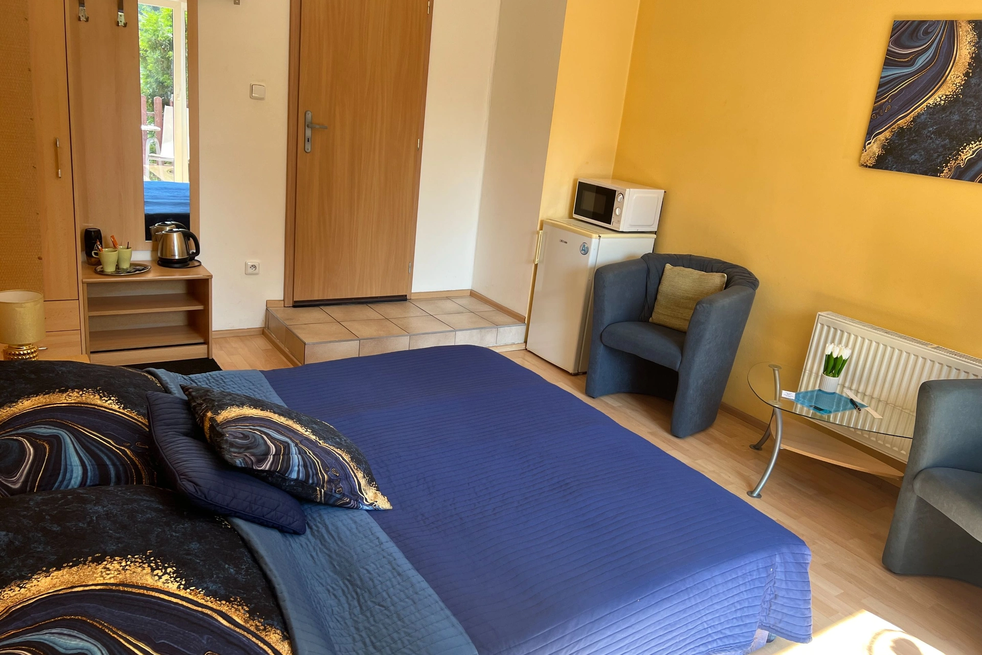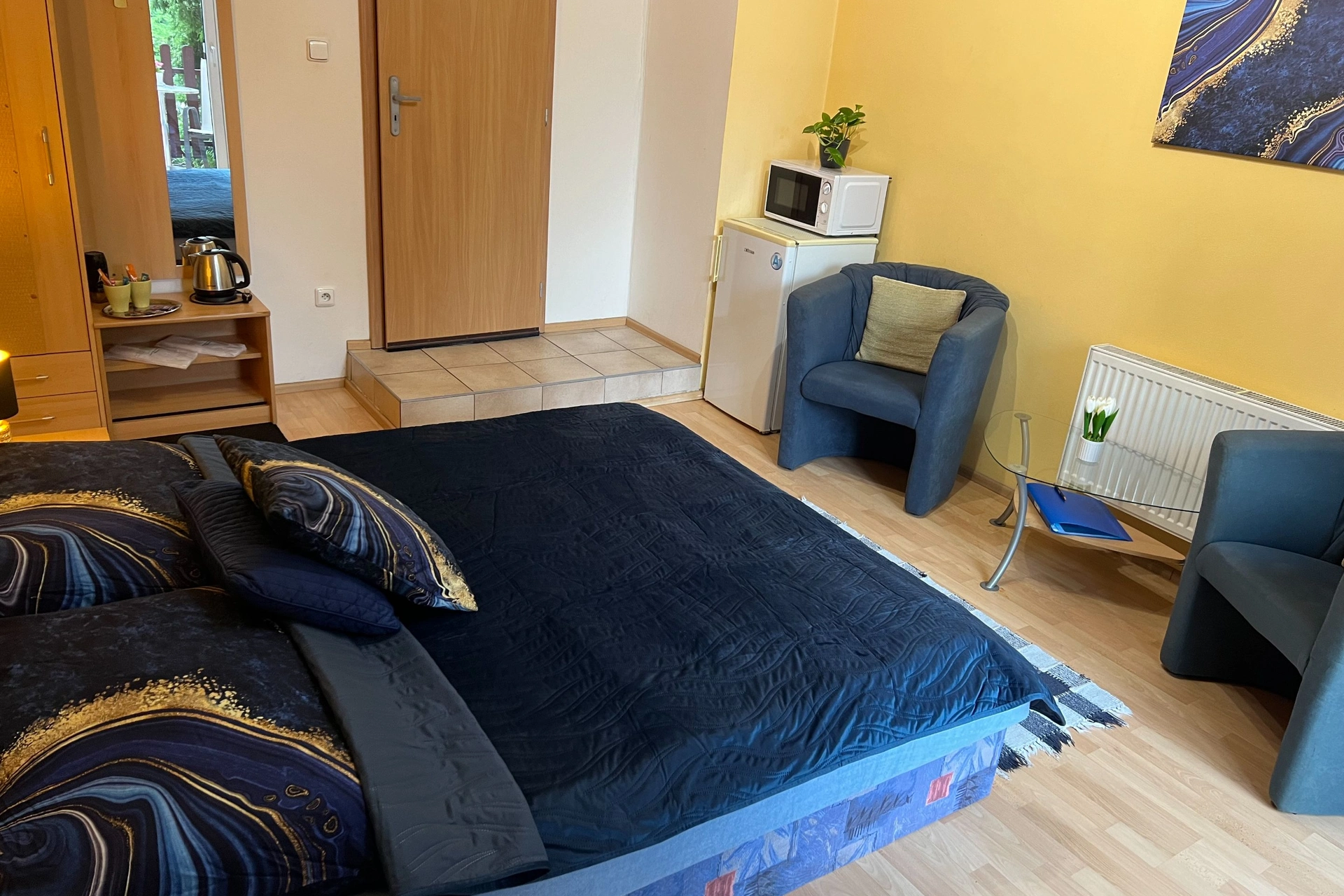 Součástí vybavení pokoje je minibar, kde můžete skladovat nápoje nebo malé občerstvení, a rychlovarná konvice pro přípravu teplých nápojů. Pokoj se nachází na 1. podlaží a je vybaven balkonem s posezením, který poskytuje výhled do zahrady.