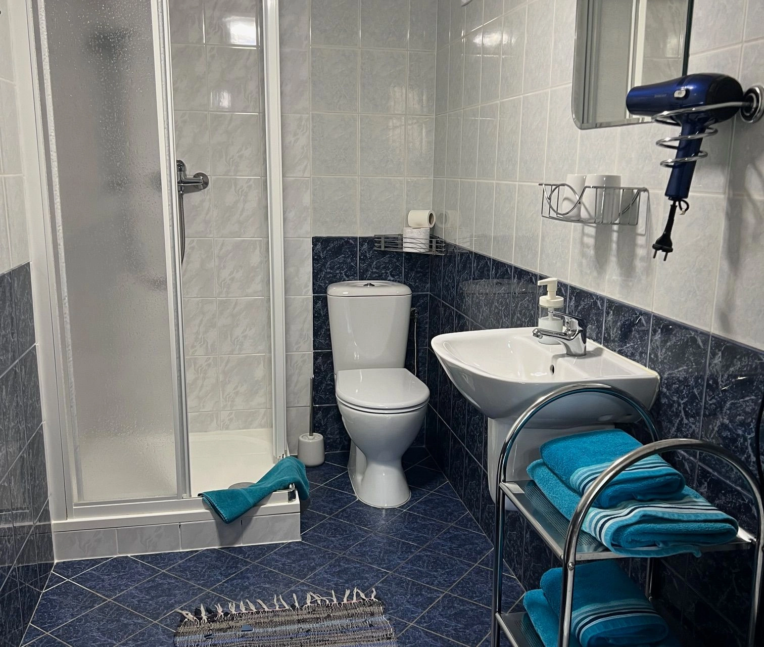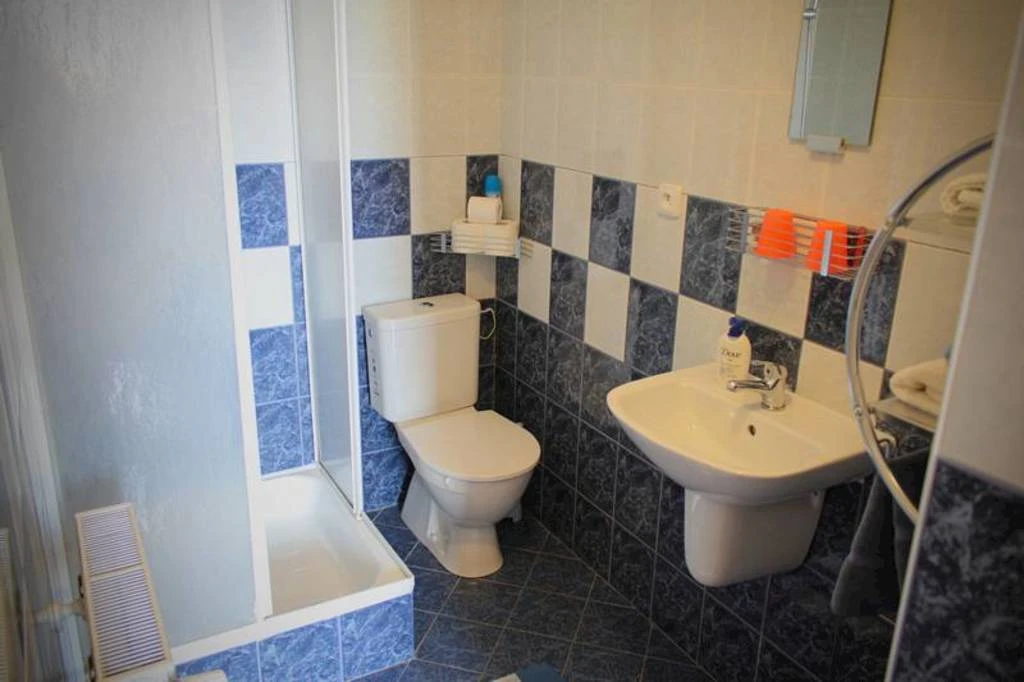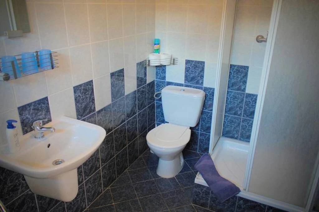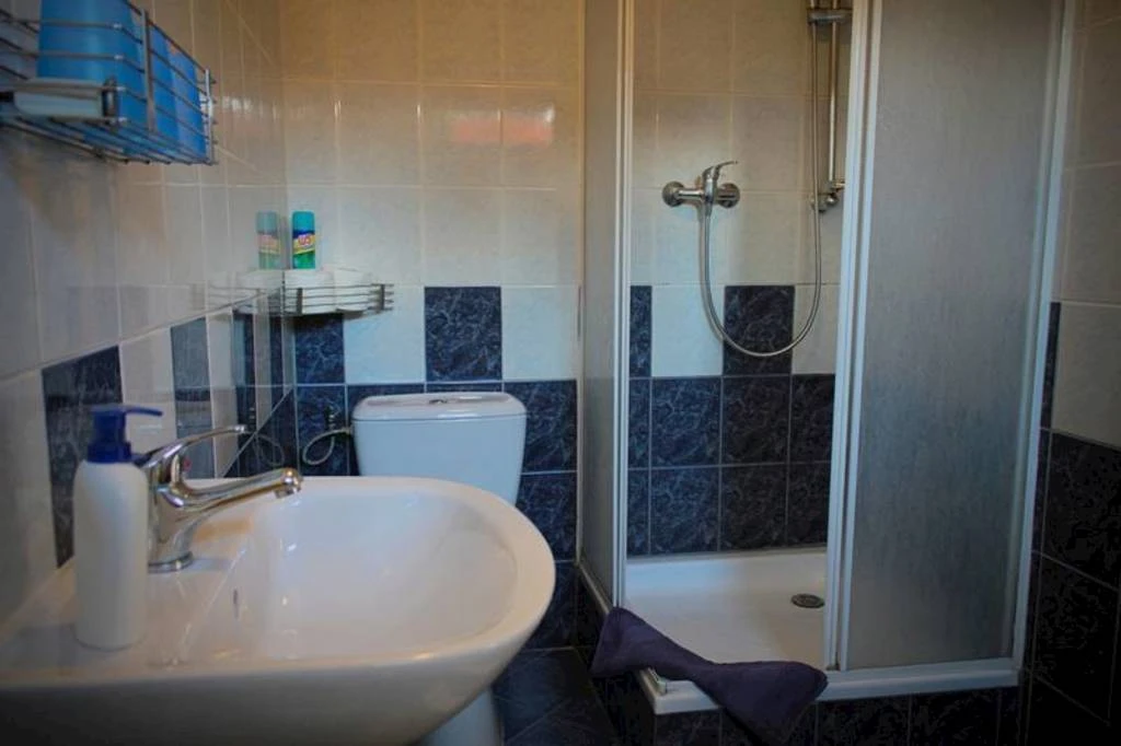 Koupelna obsahuje sprchu, umyvadlo a toaletu, přičemž k dispozici je také fén a čisté ručníky. Celkově pokoj poskytuje účelné a pohodlné prostředí během vašeho pobytu.