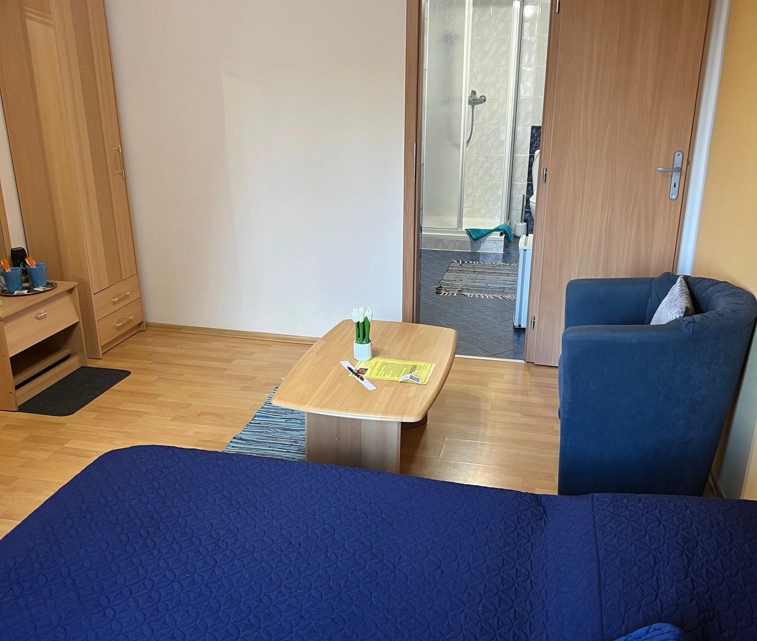 Pro vaše pohodlí je k dispozici minibar, kde si můžete uložit drobné občerstvení nebo nápoje. Pokoj je dále vybaven rychlovarnou konvicí pro přípravu teplých nápojů. V koupelně s toaletou najdete sprchu, umyvadlo a fén, což vám zajistí, že se můžete osvěžit a upravit dle potřeby. Samozřejmostí jsou čisté ručníky připravené k použití.