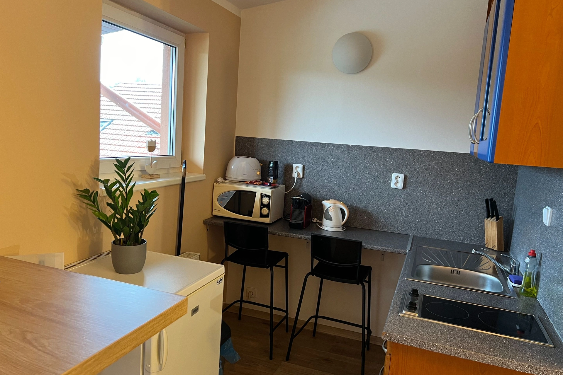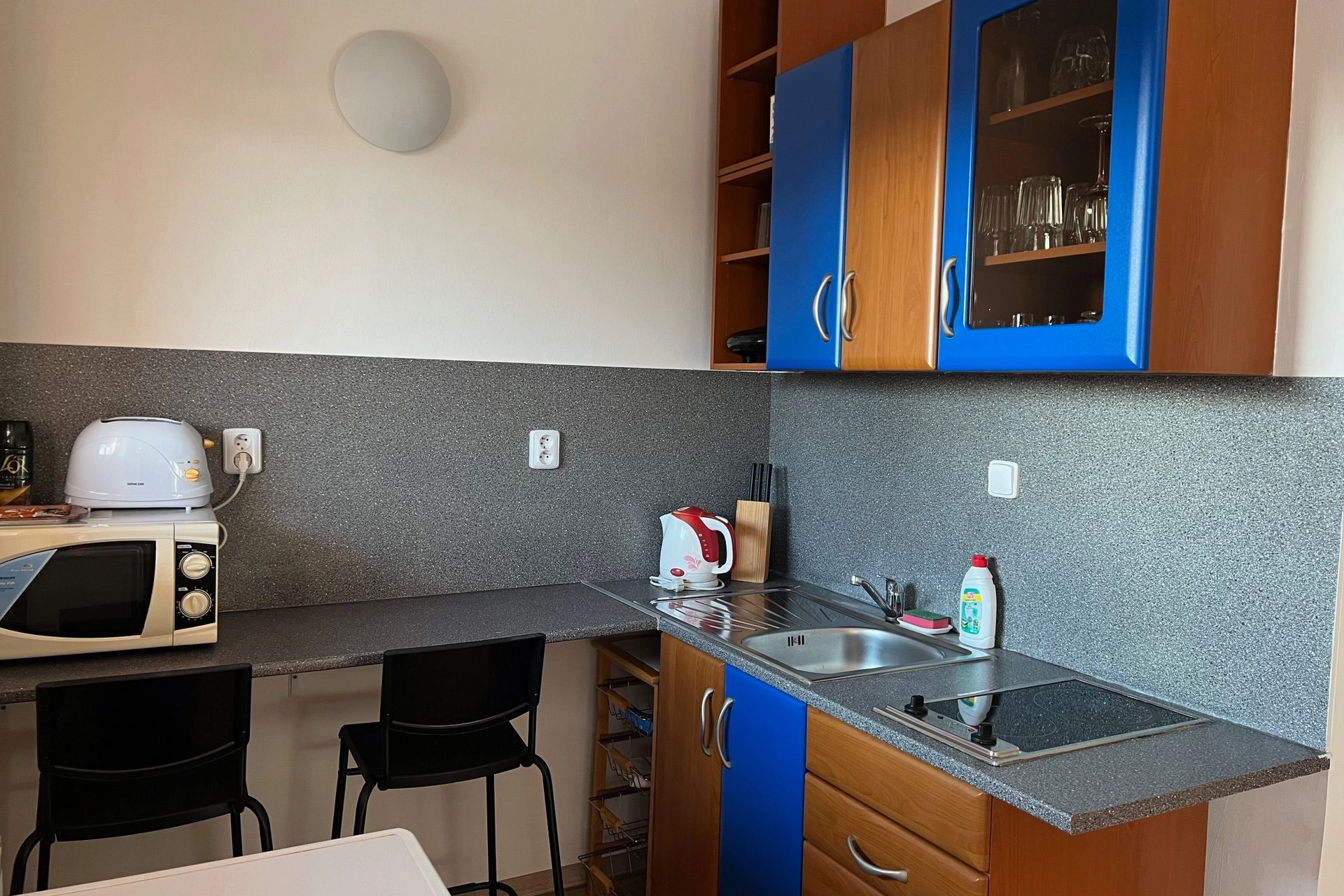 - Kuchyňský kout s elektrickým vařičem, mikrovlnnou troubou, rychlovarnou konvicí, ledničkou, topinkovačem, toustovačem a barovým sezením
