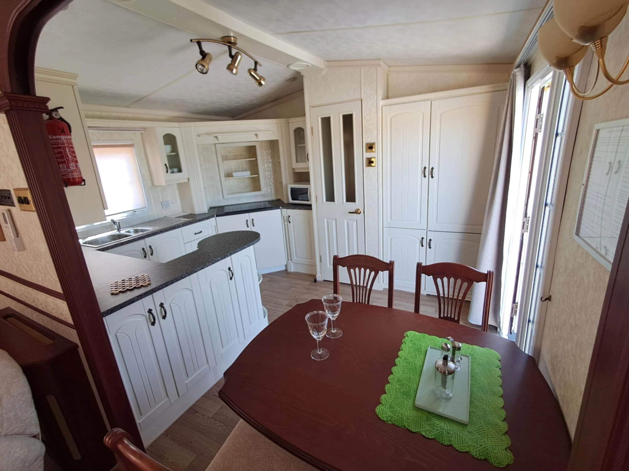Obývací část je vybavena stolem, židlemi a televizí. Kuchyňský kout zahrnuje lednici, mikrovlnnou troubu, varnou desku, rychlovarnou konvici a základní kuchyňské vybavení.