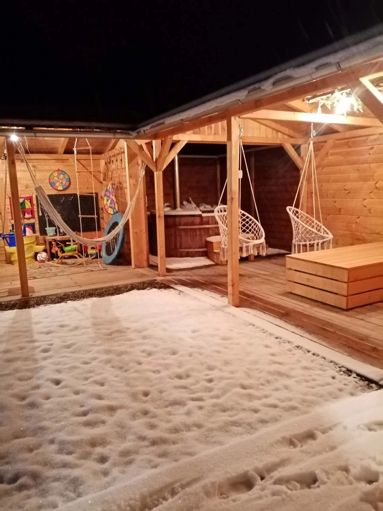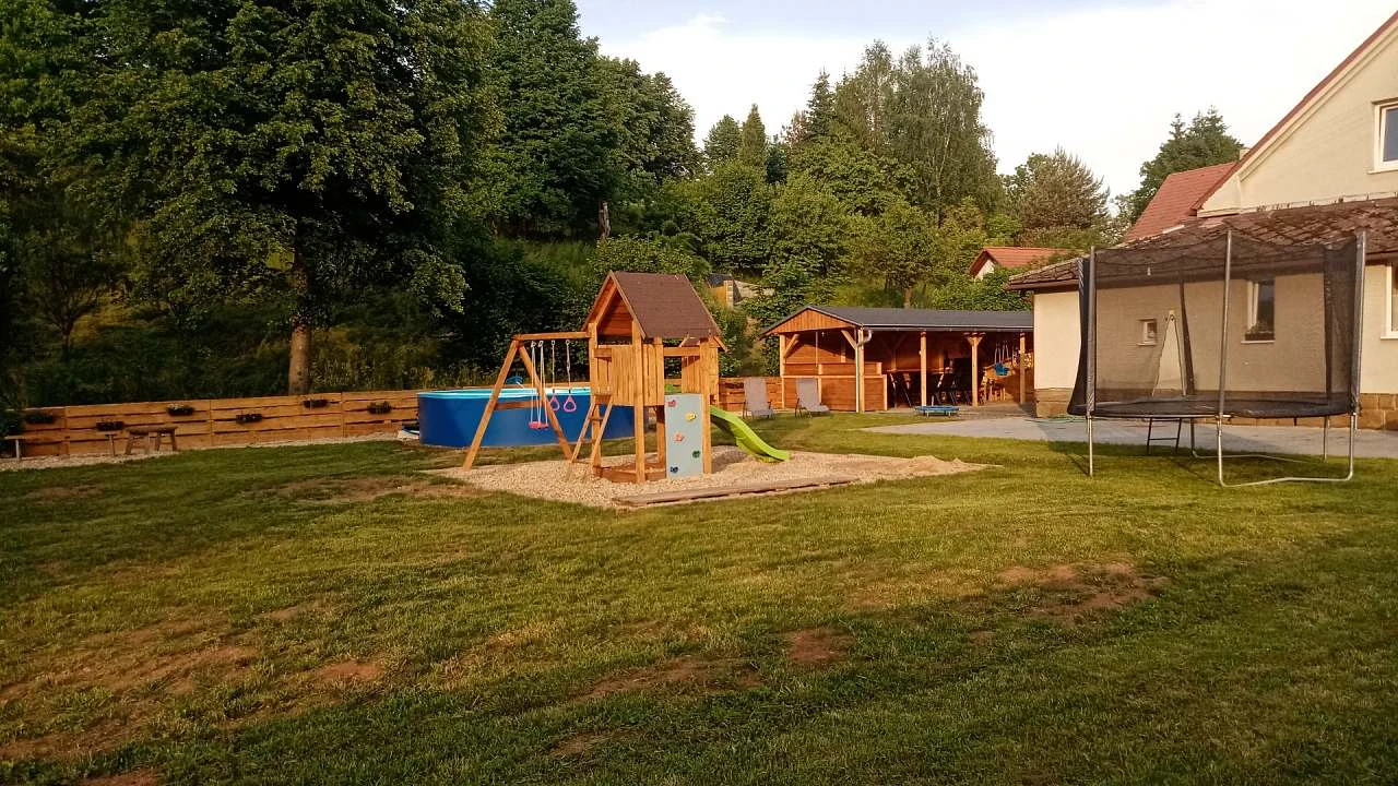Velkou devizou chalupy je její wellness zázemí. K dispozici je masážní vířivka pro 5-6 osob, sauna pro 5 osob, mokrá sauna pro 4-5 osob a relaxační zóna s houpacími křesly. Hosté si mohou užít i venkovní bazén a terasu s posezením. Děti se zase mohou dosyta vyřádit na trampolíně, v dřevěném domečku nebo na prolézačkách.