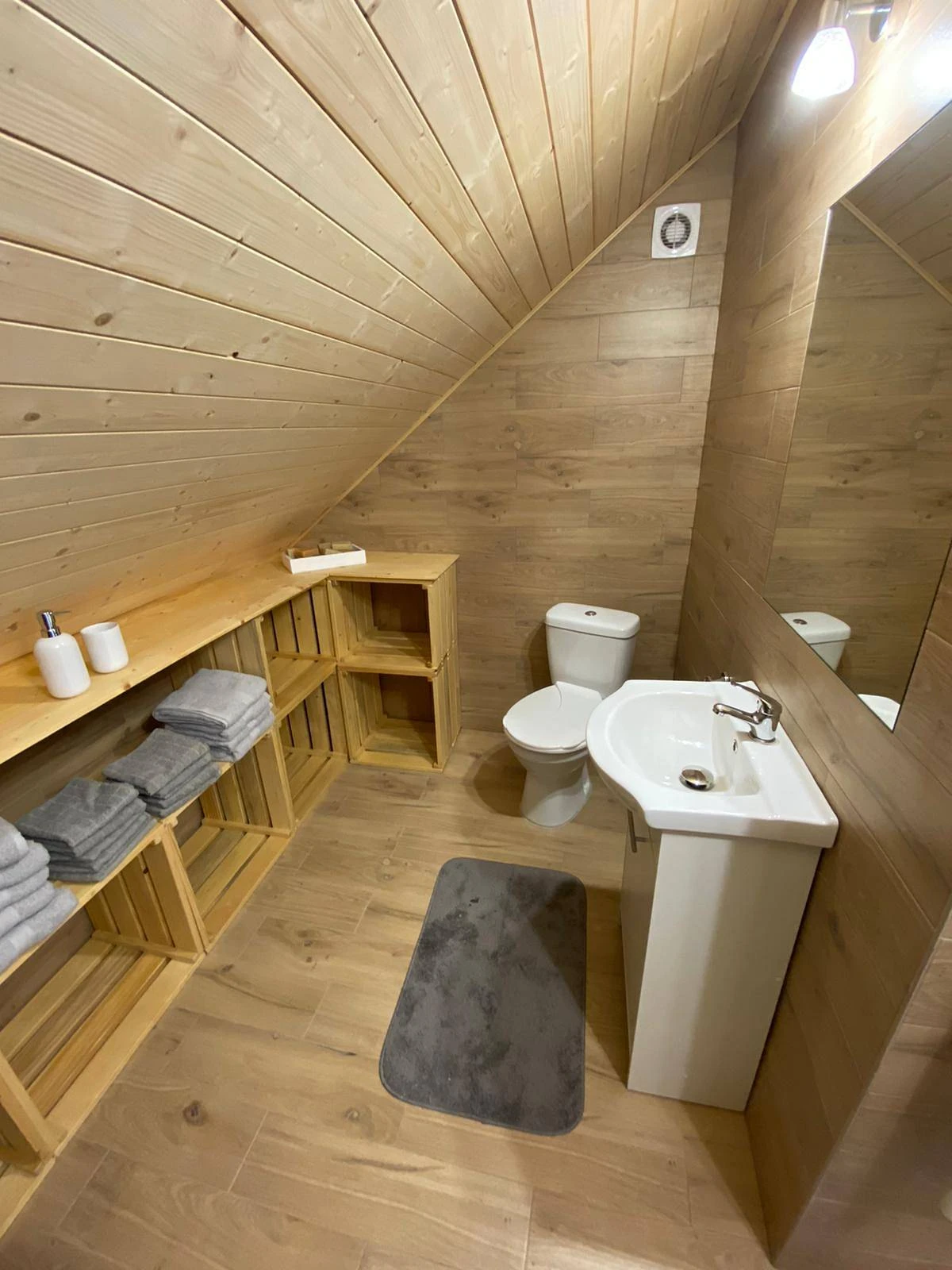 Druhé podlaží: Koupelna s WC, umyvadlem a sprchovým koutem.