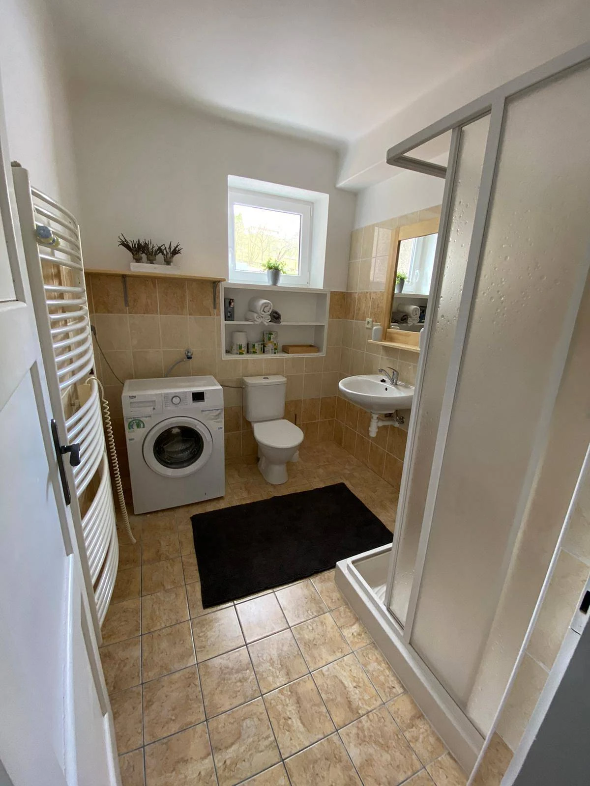 První podlaží: Koupelna s WC, umyvadlem, sprchovým koutem a pračkou.