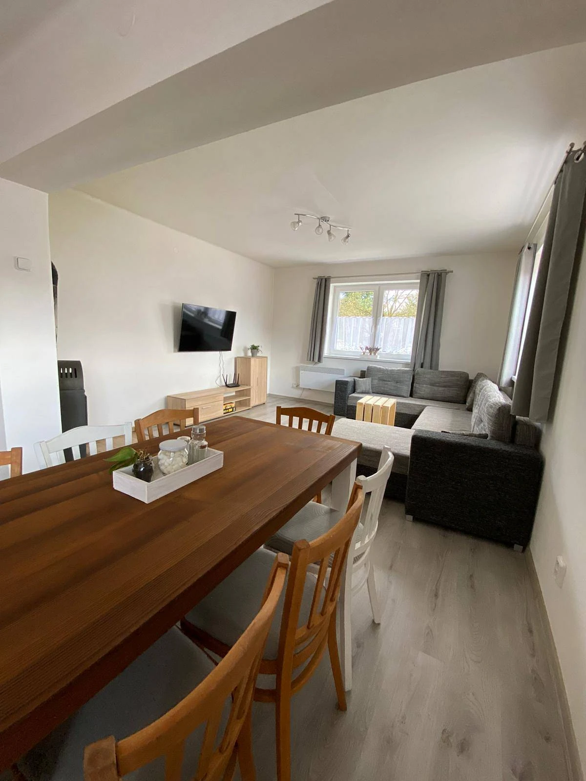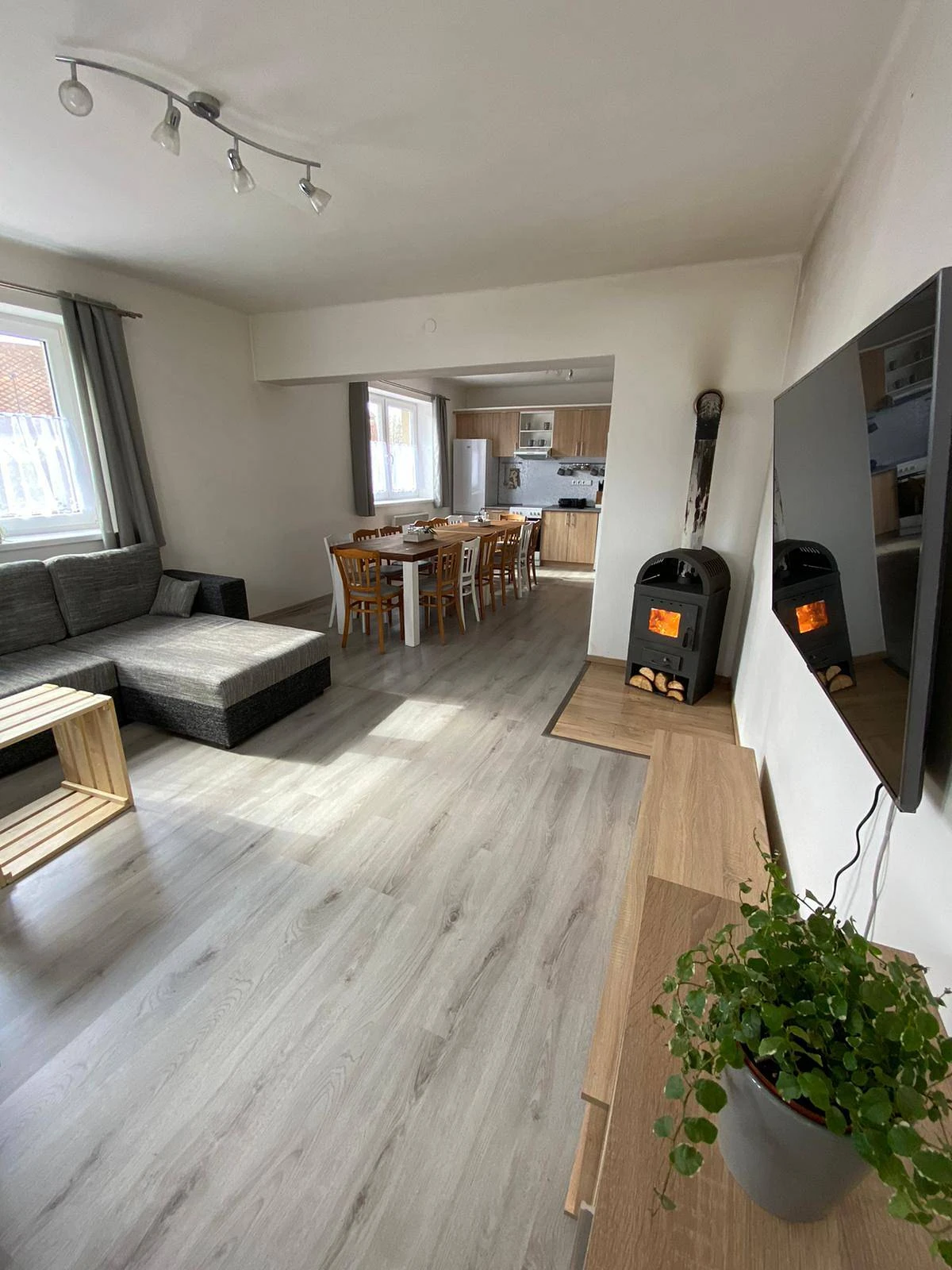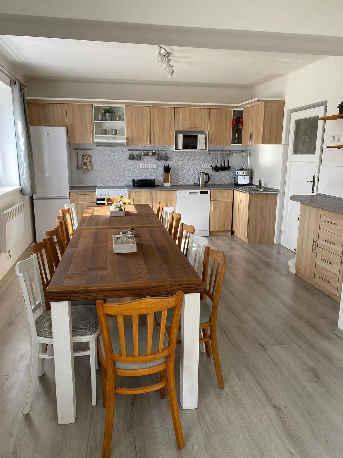 Samotný objekt poskytuje ubytování pro 1 až 14 osob ve třech ložnicích. Interiér je moderně a útulně zařízen, aby se hosté cítili jako doma. V přízemí se nachází prostorná kuchyně s obývacím pokojem, která slouží jako společenská místnost. Zde se můžete pohodlně usadit u krbu a nejdříve si příjemné chvíle.