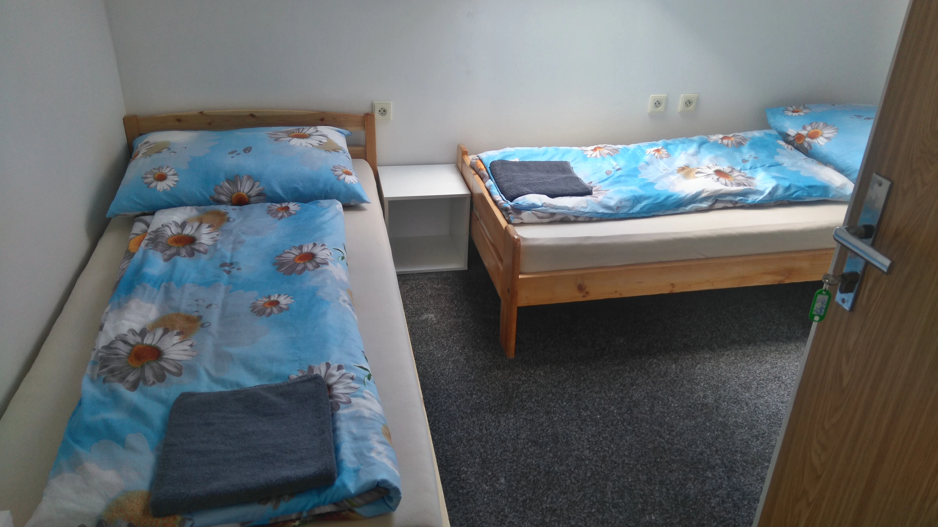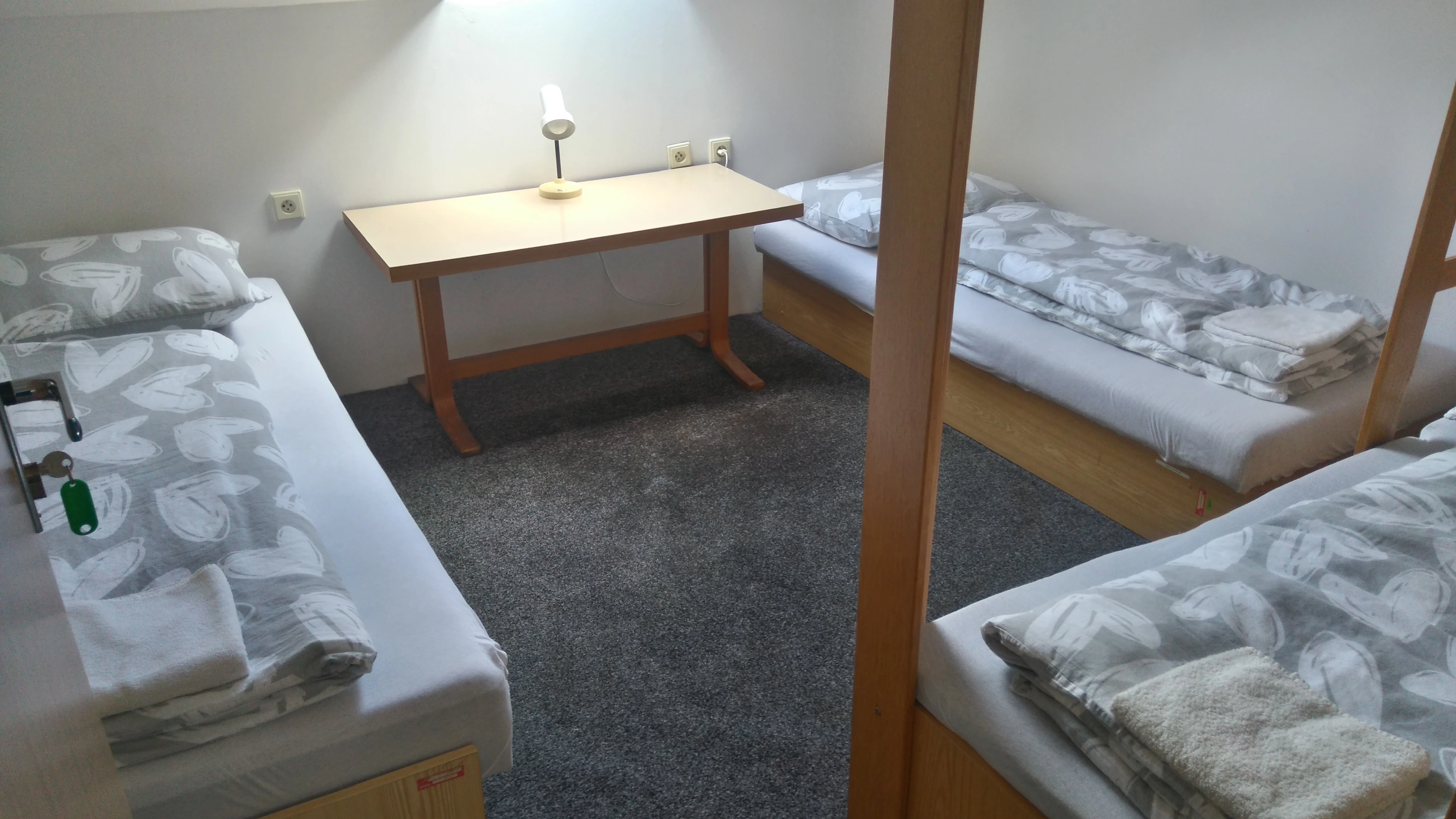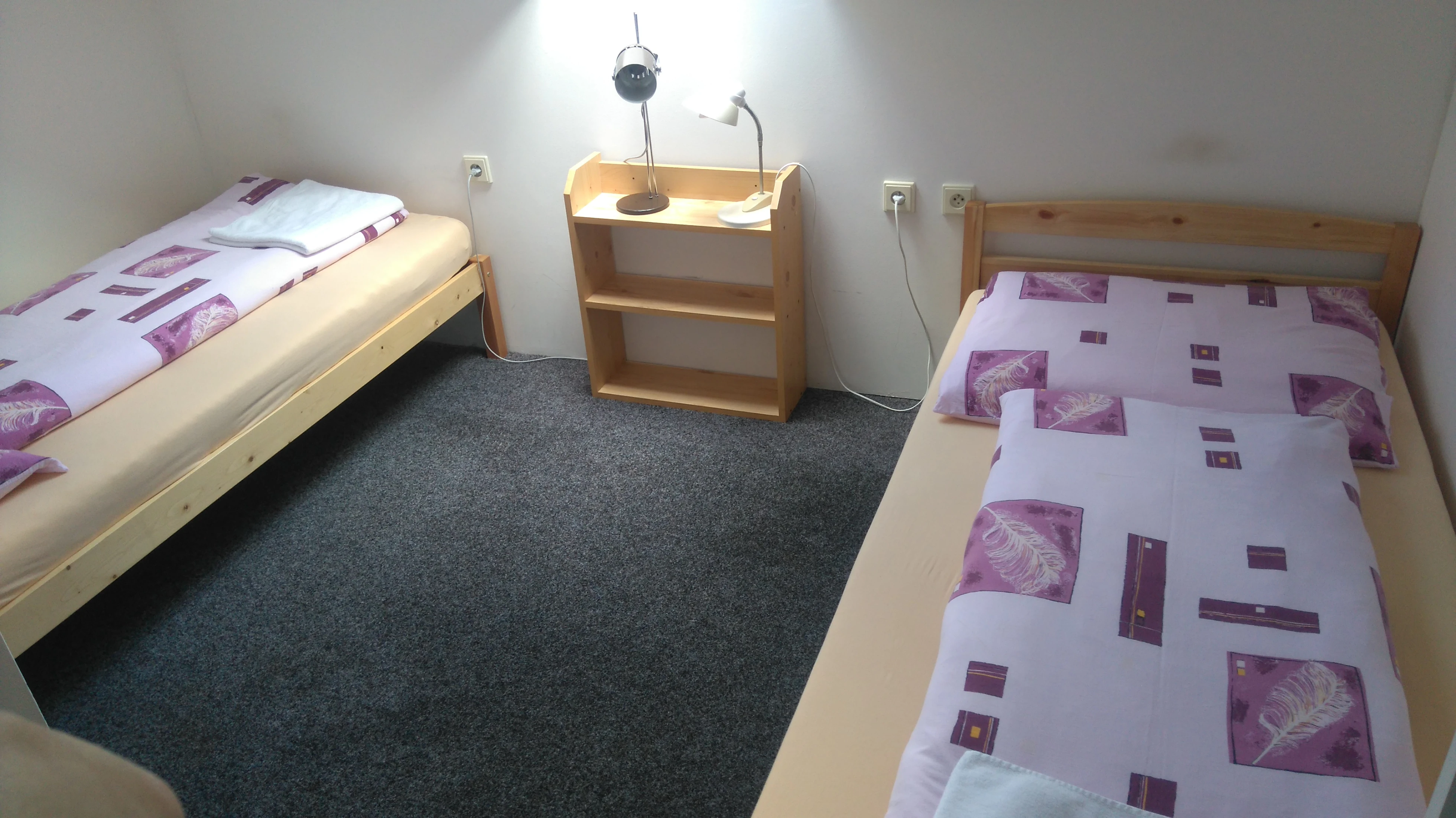 Pokoje: jednolůžka, dvoulůžka, patrová postel, sdílené sociální zařízení.
