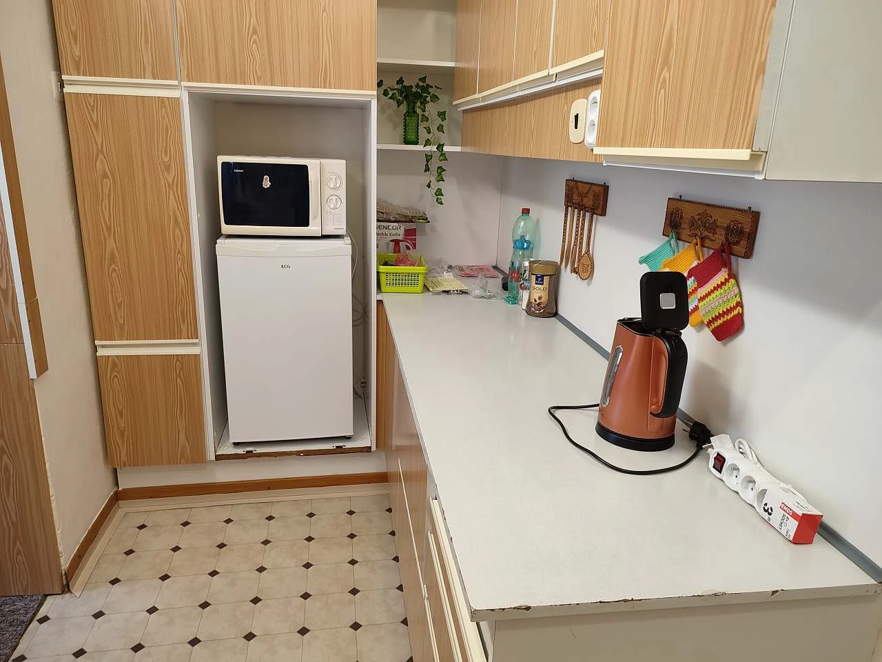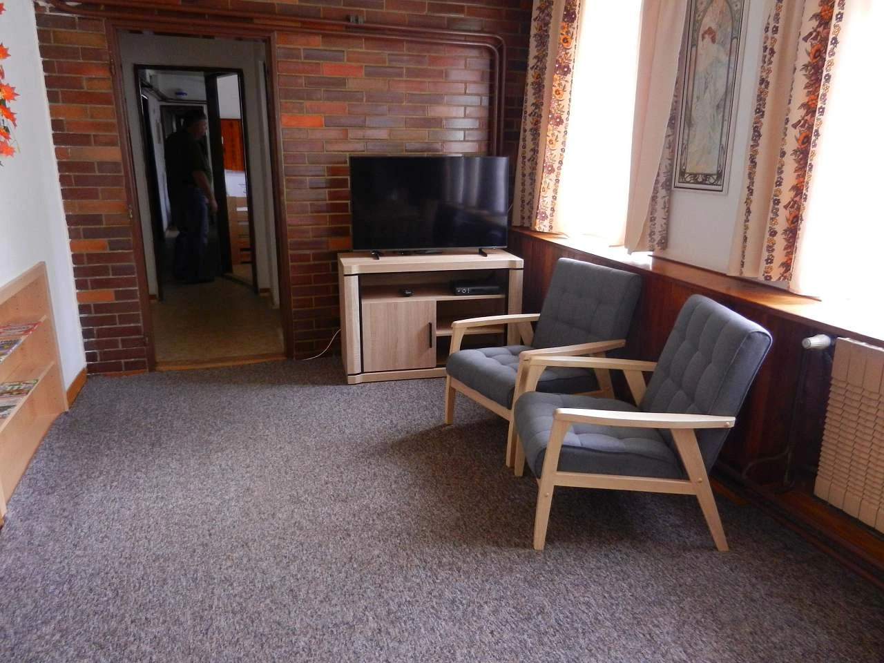 Kuchyně je standardně vybavena, je zde mikrovlnná trouba, lednice s mrazákem, vařič, rychlovarná konvice. Ve společenské místnosti je TV, internet.