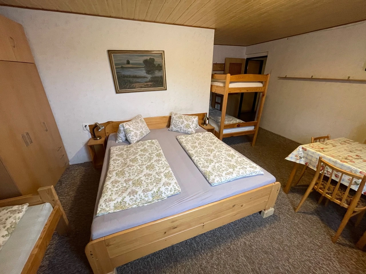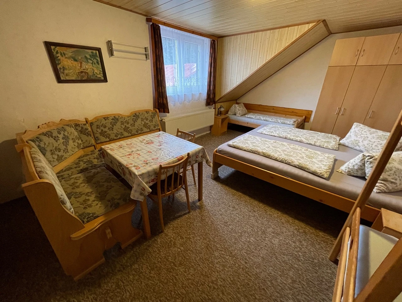 A v podkroví jsou k dispozici 2 pokoje: jeden - 5lůžek, druhý - 4 lůžka.