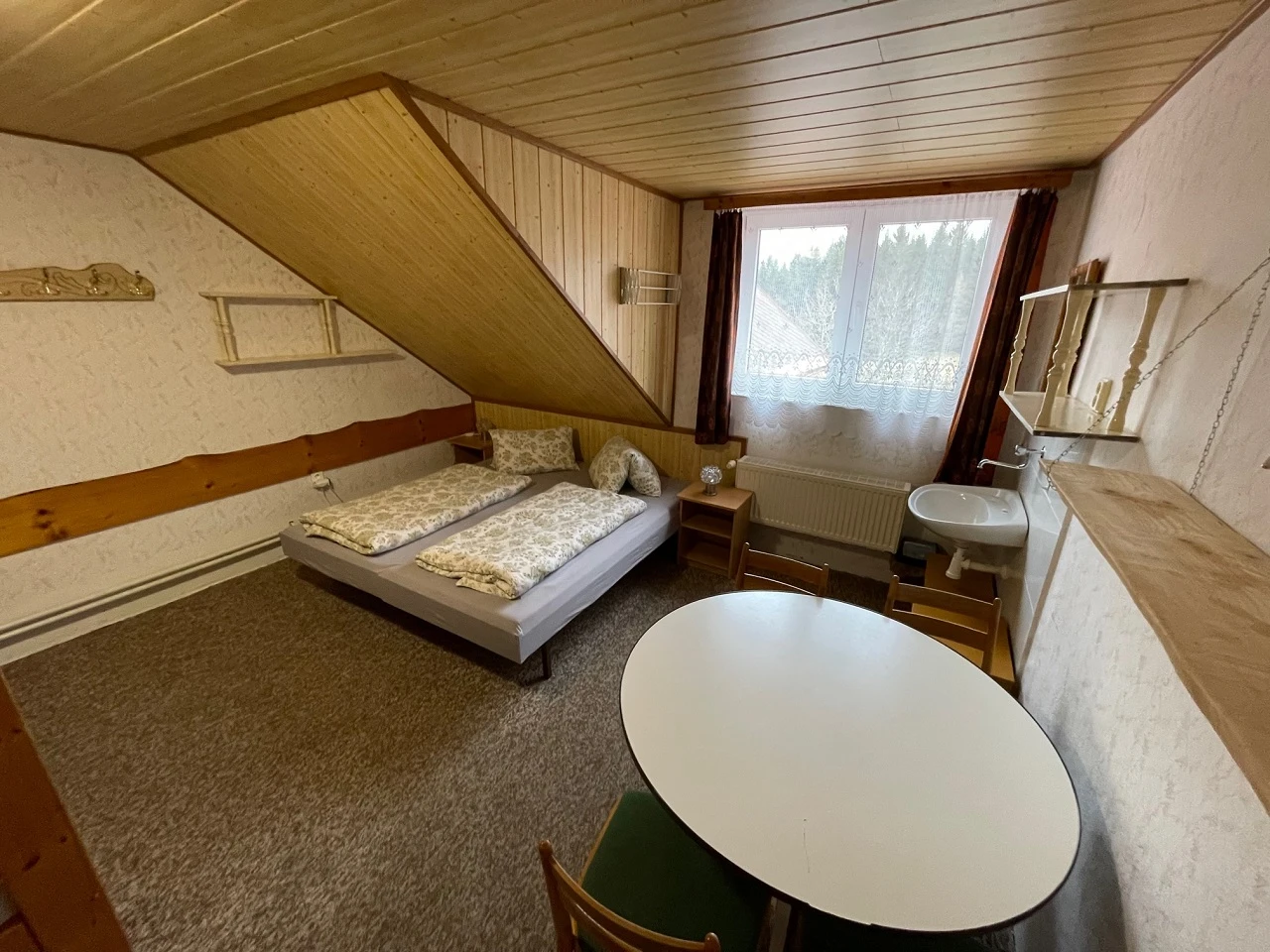 V každém pokoji je jídelní stůl a umyvadlo se studenou vodou.