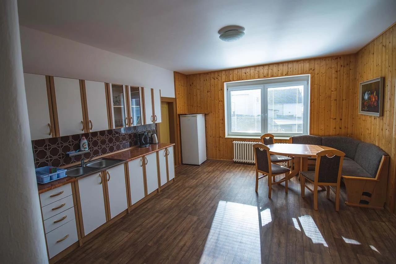 Dvě místnosti pro maximálně 6 osob čtyřlůžkový pokoj dvoulůžkový pokoj televize na pokoji plně vybavená kuchyně (varná deska, lednice, mikrovlnná trouba a rychlovarná konvice) koupelna se sprchový koutem a WC Wifi připojení k internetu