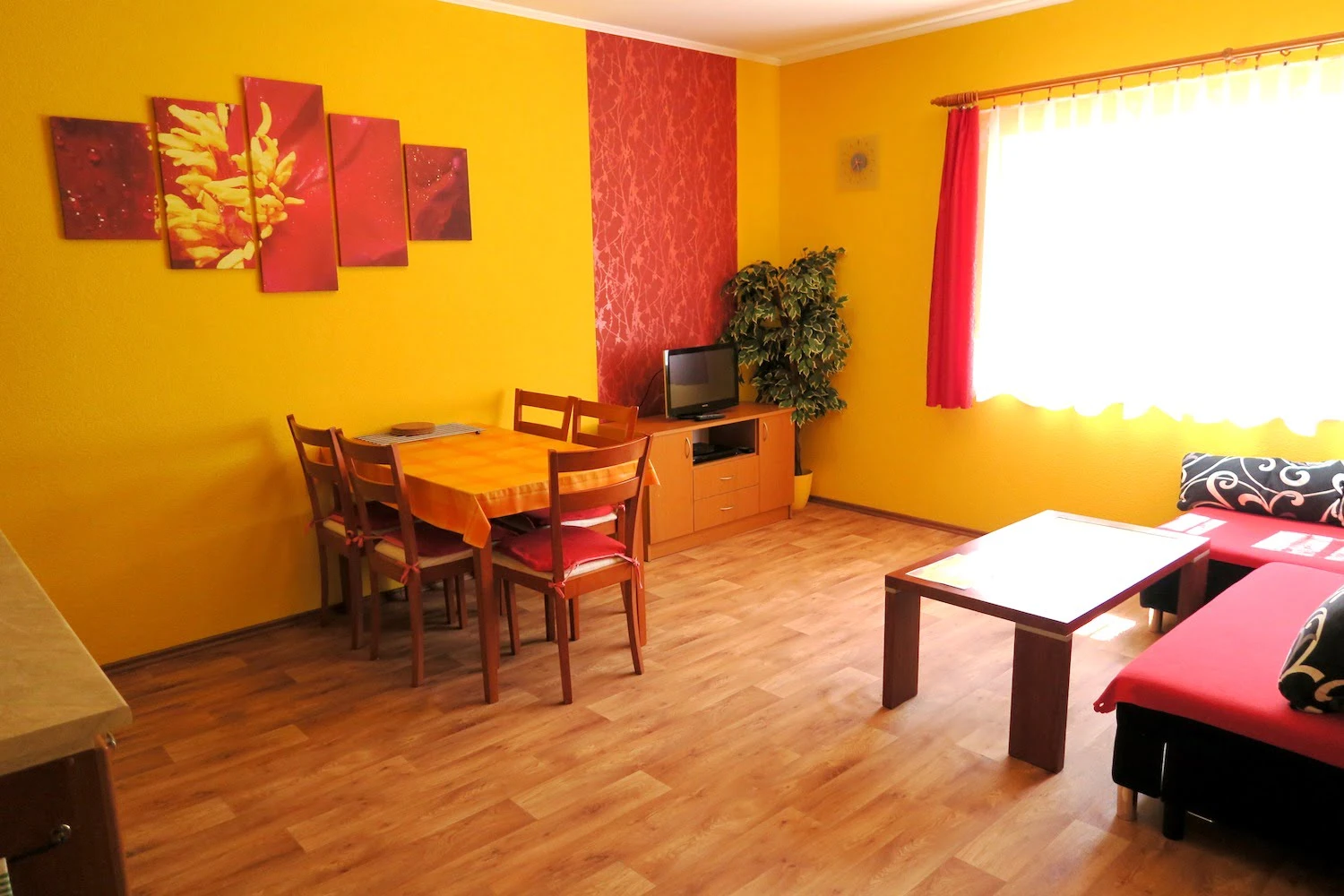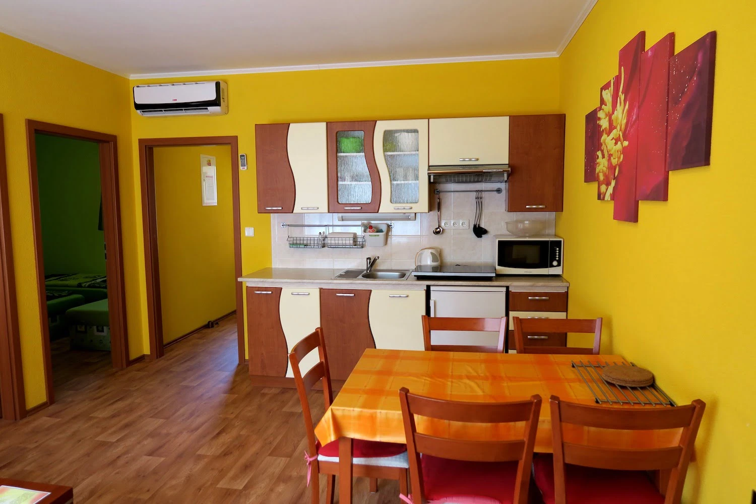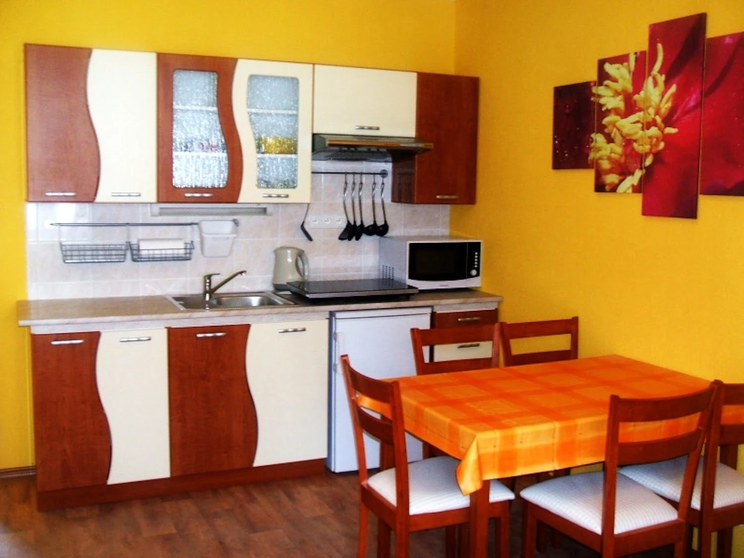 Apartmány mají kompletně vybavený kuchyňský kout - indukční vařič, mikrovlnná trouba, rychlovarná konvice, lednička s mrazákem, odsavač par, veškeré nádobí, jídelní stůl + židle.
