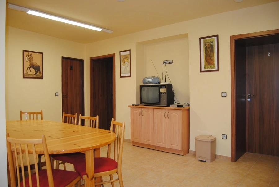 TV, WiFi, šatní skříň, stůl, židle, umyvadlo, společné koupelny, sprchové kouty, toalety, dvě kuchyně, elektrický sporák, trouba, mikrovlnná trouba, rychlovarná konvice, kombinovaná lednice, jídelní sezení, venkovní posezení, parkování, pračka, sušička, šipky, petanque, možnost ustájení koní.