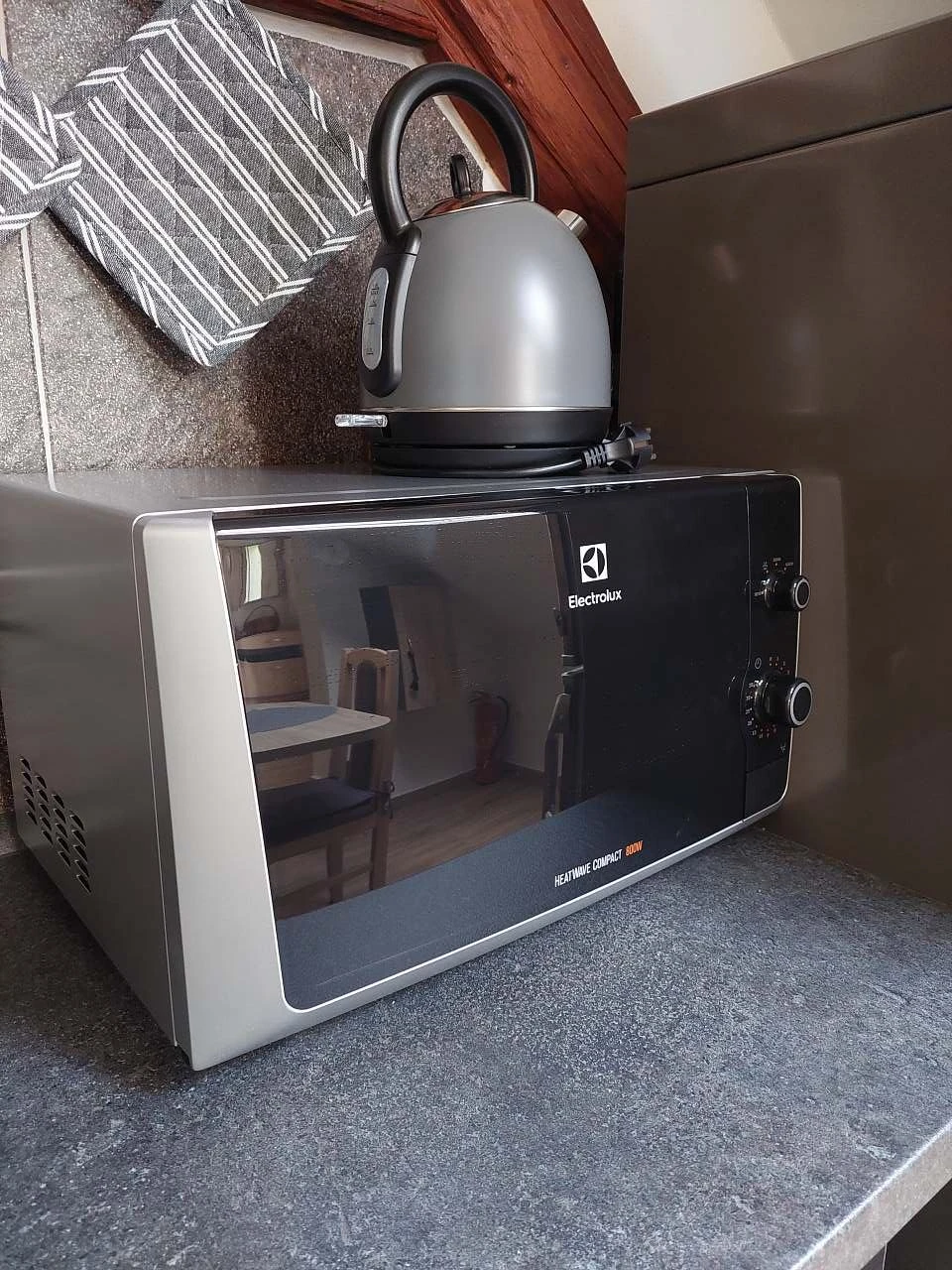 Kuchyňský kout (lednice, dvouplotýnkový vařič, mikrovlnná trouba, rychlovarná konvice, kávovar na kapsle, nádobí)