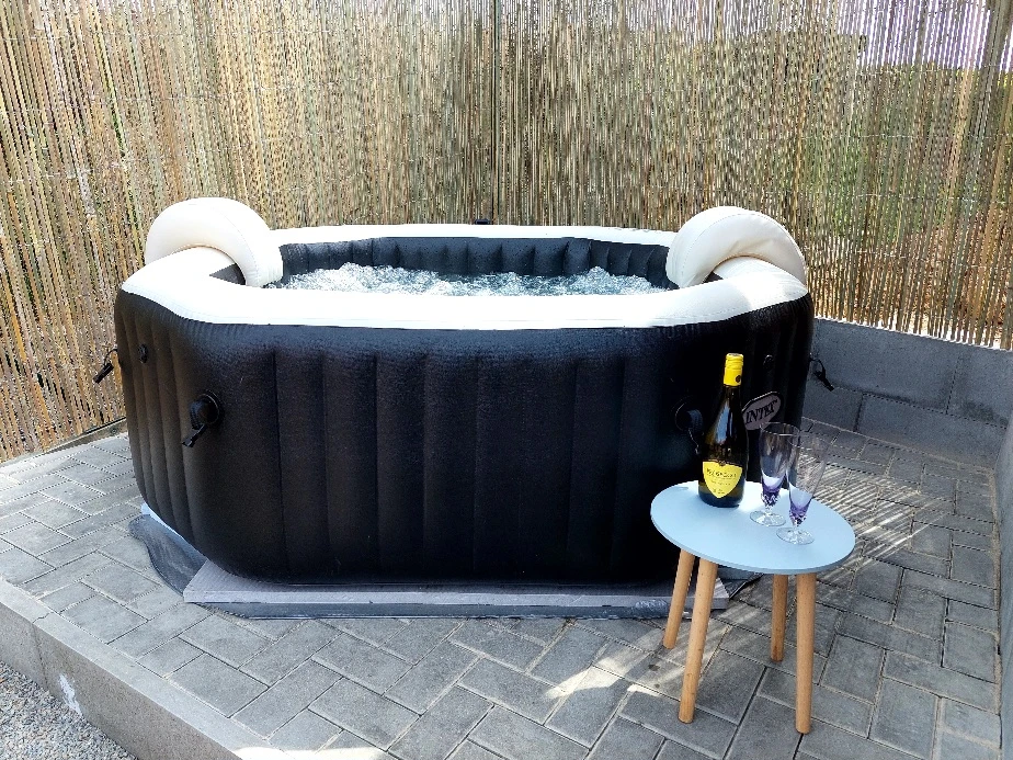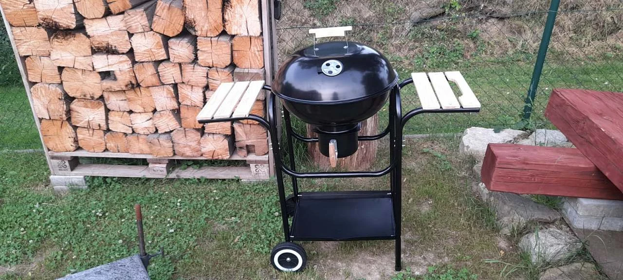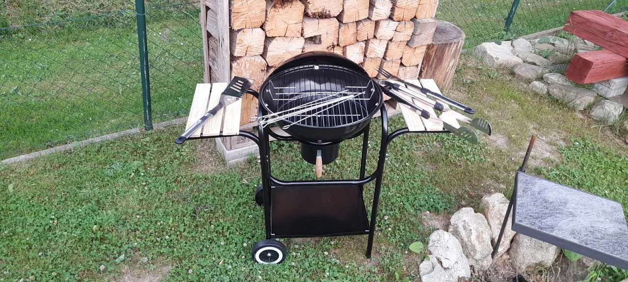 Jídelní stůl až pro 6 osob + dětská jídelní židlička - Venkovní ohniště včetně dřeva, gril, posezení se slunečníkem, vířivka