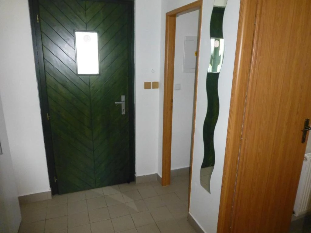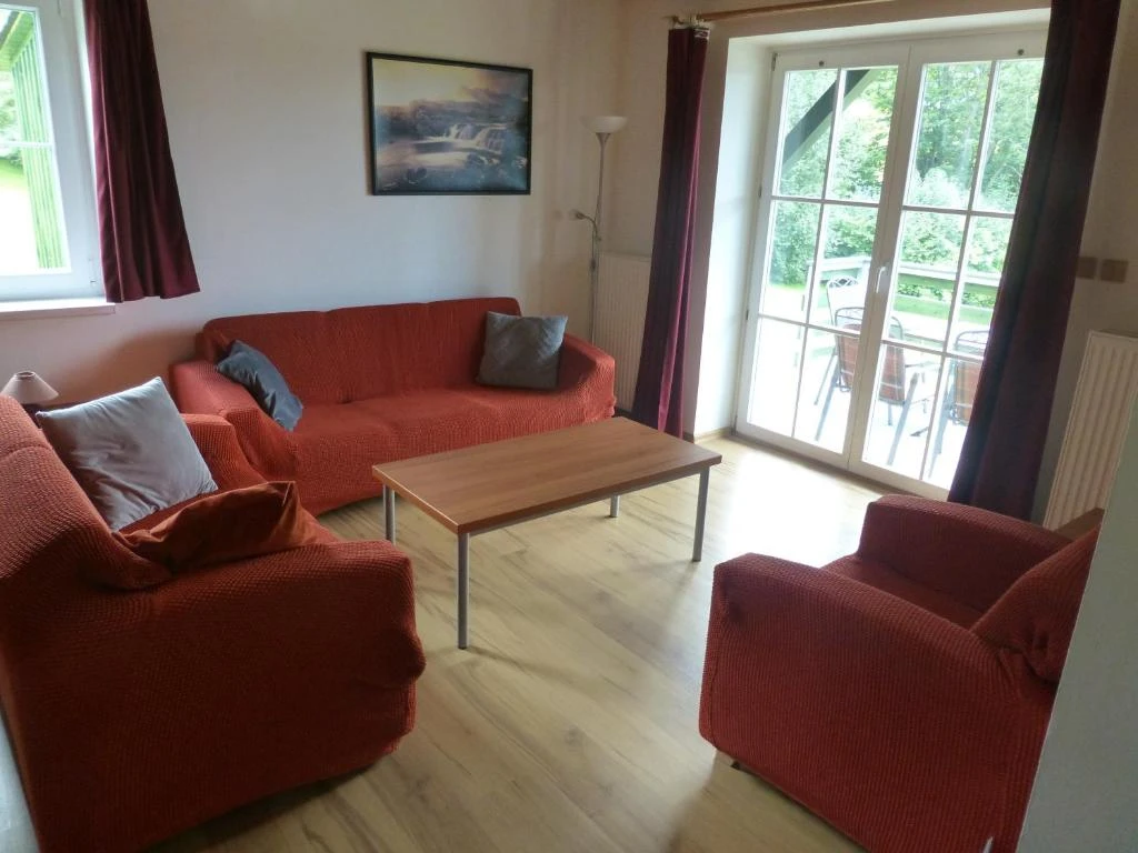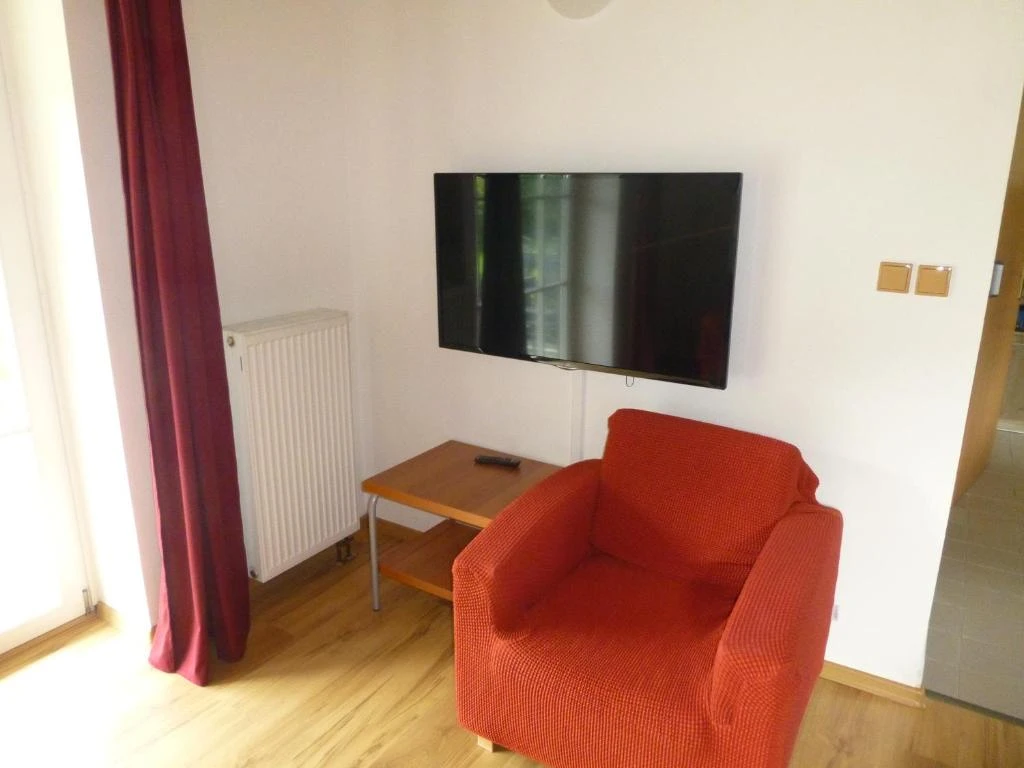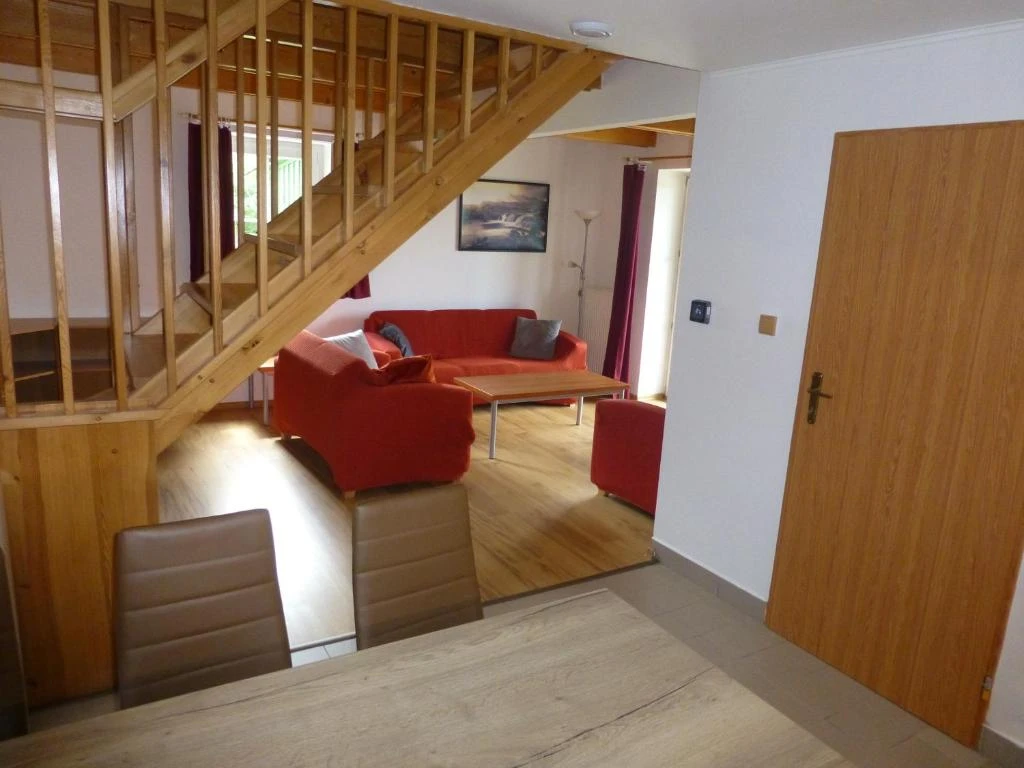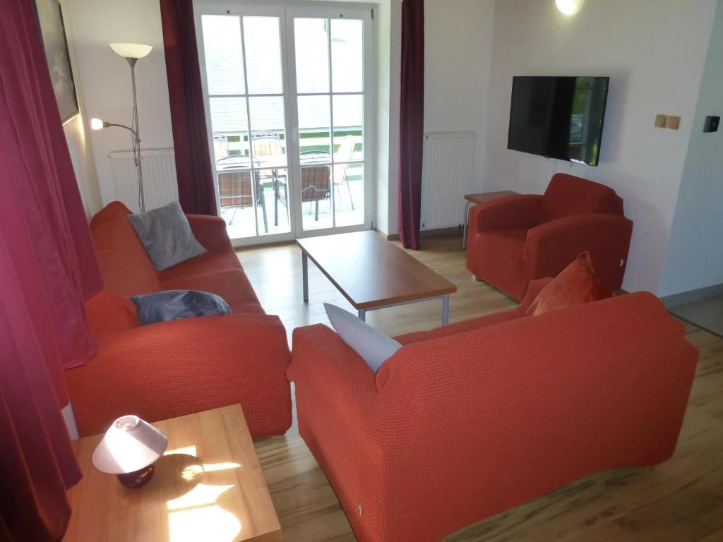 - Společná obývací místnost s televizí se satelitním příjmem, gaučem a vstupem na terasu